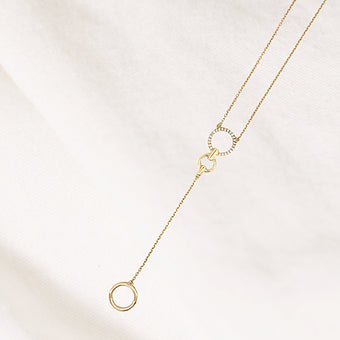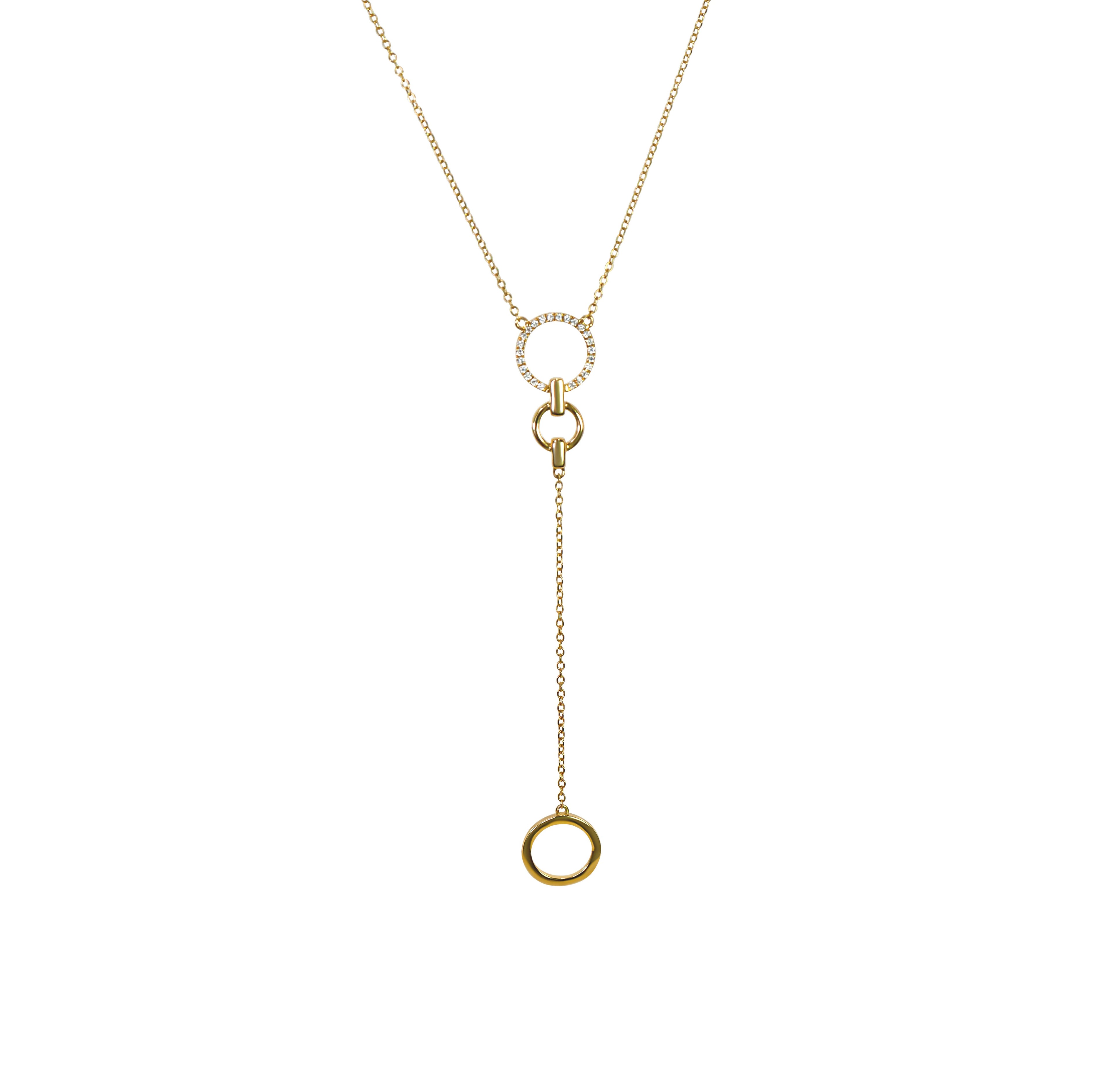 Elevate your jewelry collection with the exquisite Taira Necklace, a stunning lariat style piece adorned with circles of dazzling diamonds. Crafted with 14k yellow gold, this elegant necklace exudes sophistication and luxury. The delicate cable link chain adds a touch of femininity and grace to this timeless piece, making it a versatile addition to any outfit. Whether worn alone or layered with other necklaces, the Taira Necklace is sure to make a statement and add a touch of glamour to any ensemble. Perfect for special occasions or everyday wear, this necklace is a must-have for any fine jewelry lover.