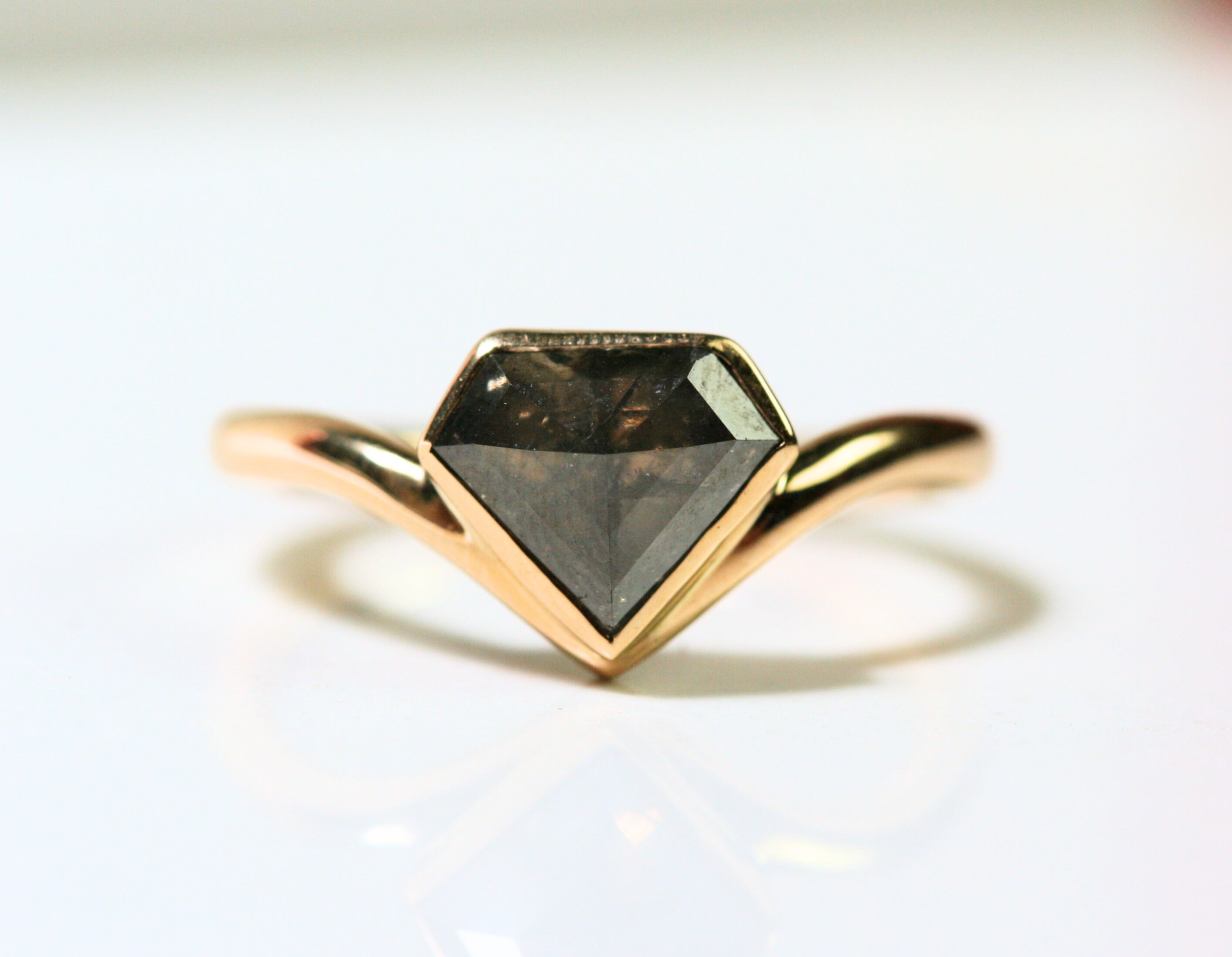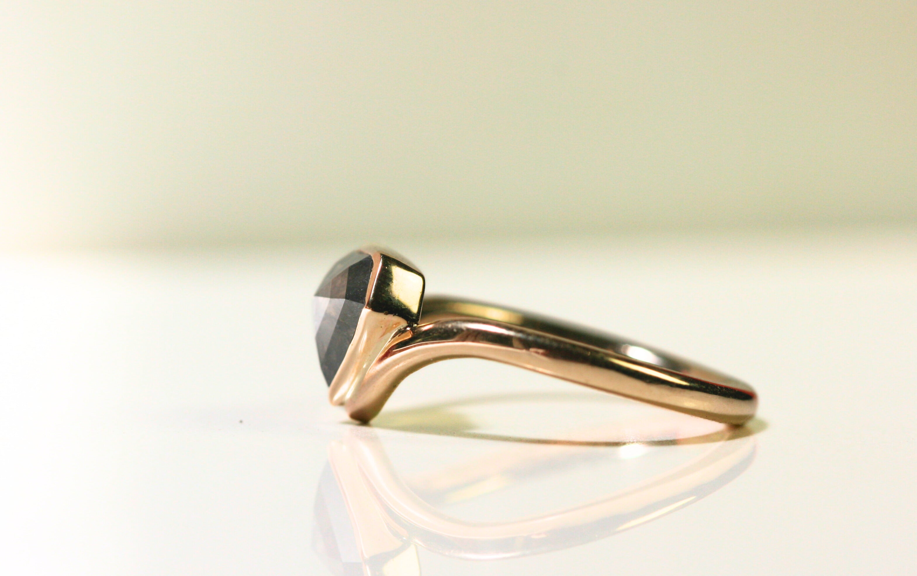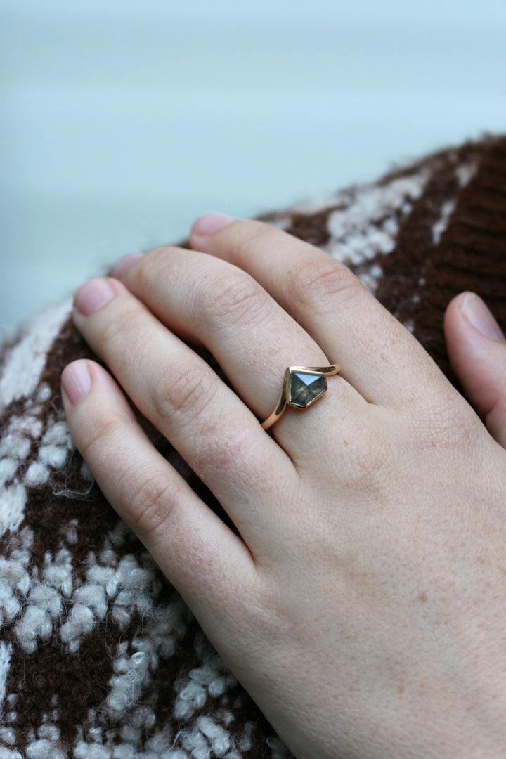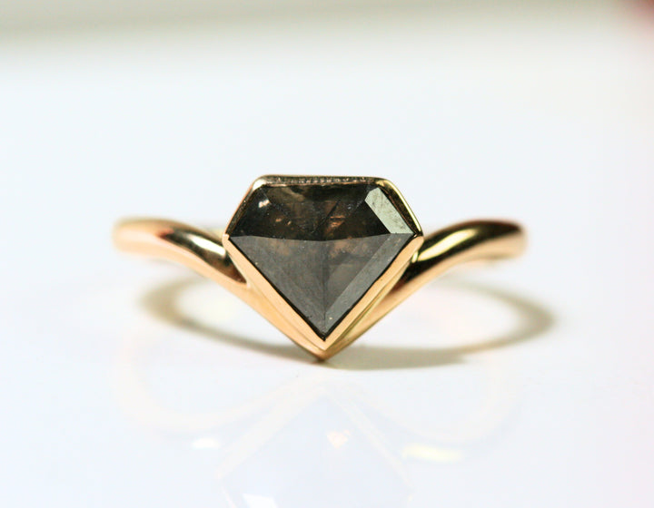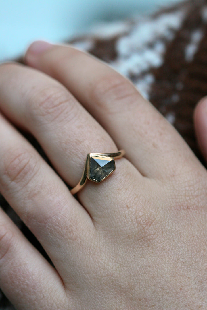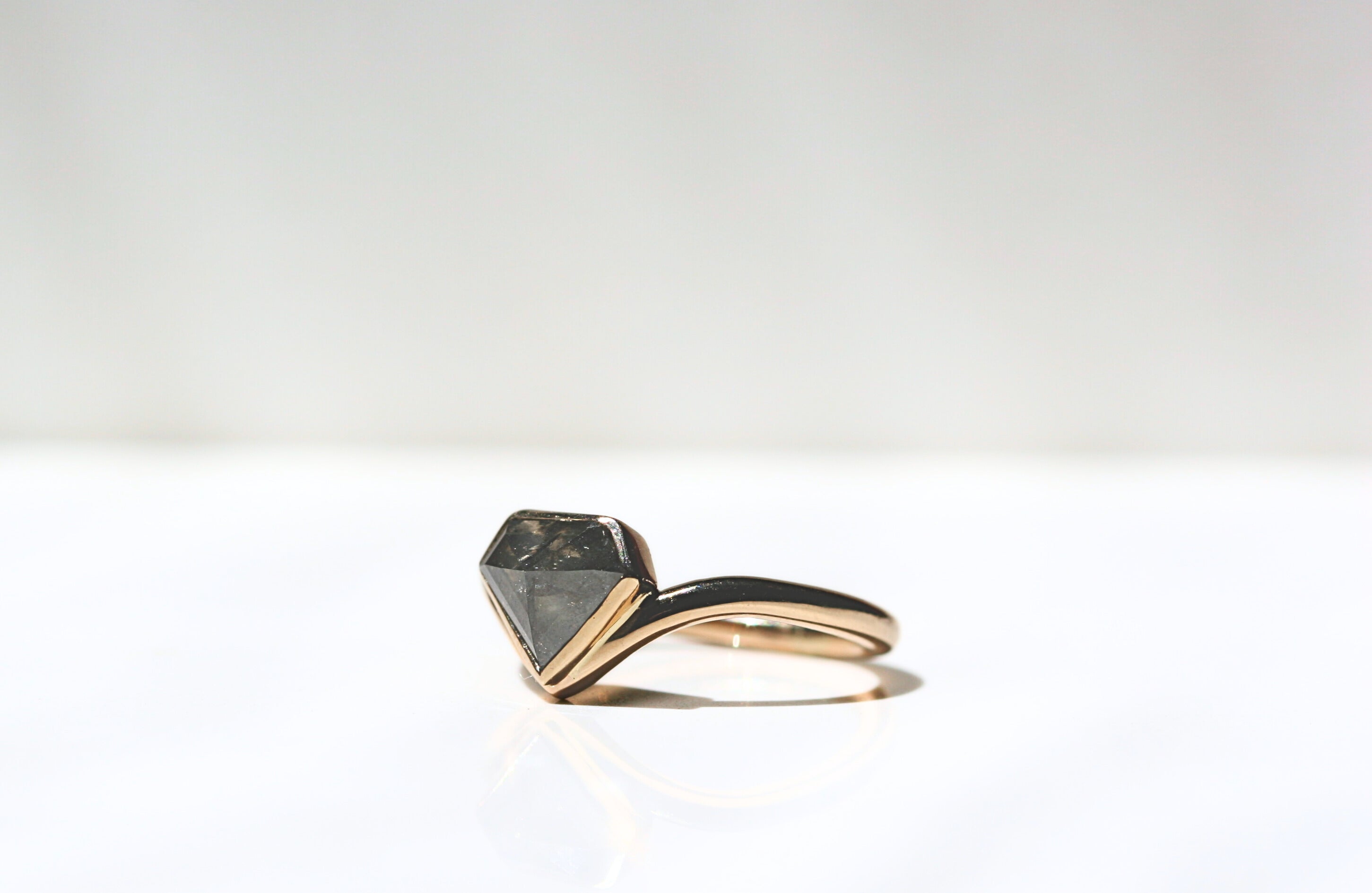 The Belladonna Ring features a stunning 1.75-carat fancy rose-cut salt and pepper diamond, uniquely captivating with its natural inclusions and one-of-a-kind sparkle. Set in 14k yellow gold, the bezel is handcrafted to perfectly fit the stone, ensuring its beauty and individuality shine through. Designed with a comfort-fit band, this versatile ring can be worn two ways, giving it a dual personality that makes it feel like two rings in one. A truly unique piece, it pairs beautifully with the Daviana Necklace, another salt and pepper diamond treasure. Perfect for someone with an eye for individuality and modern elegance.