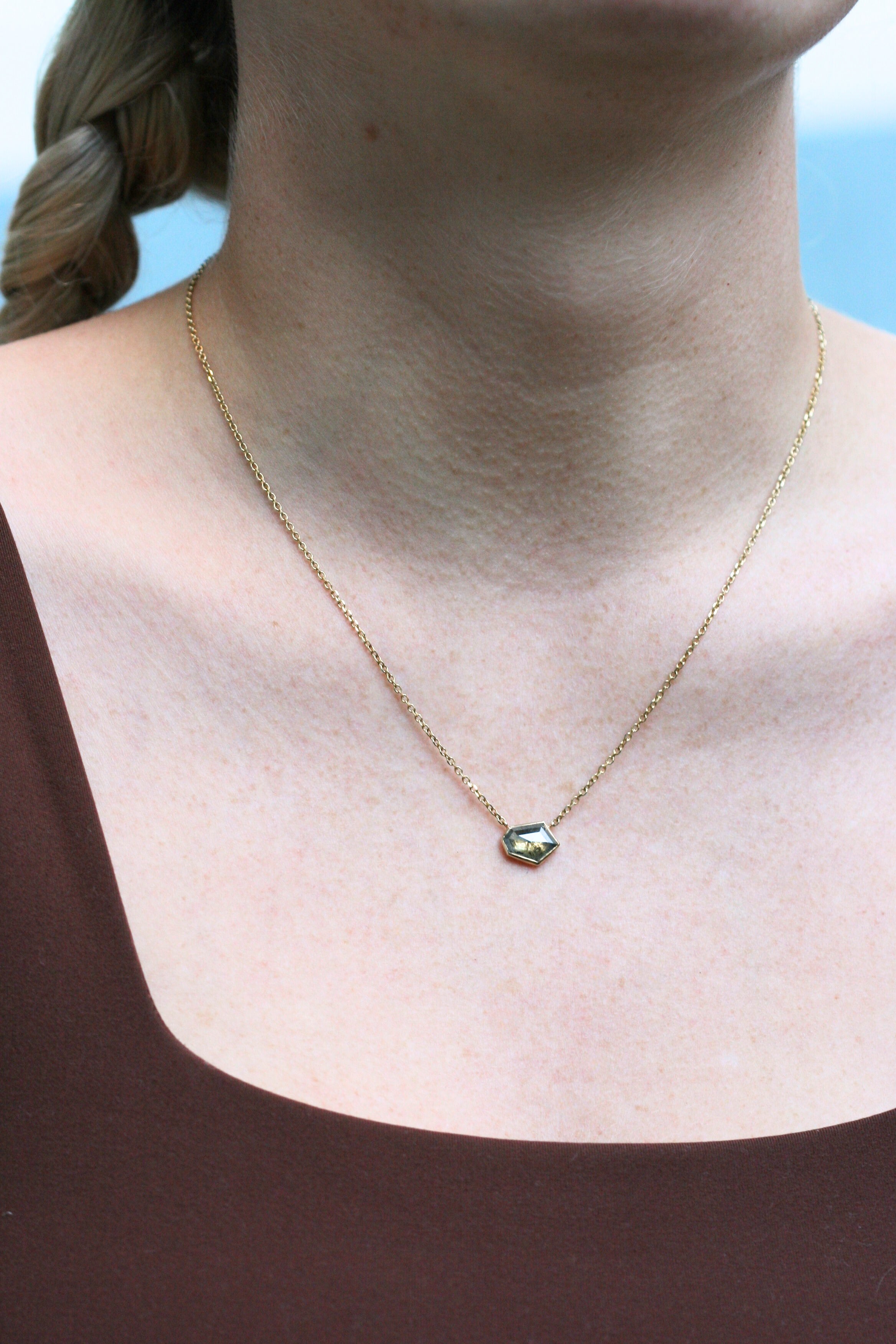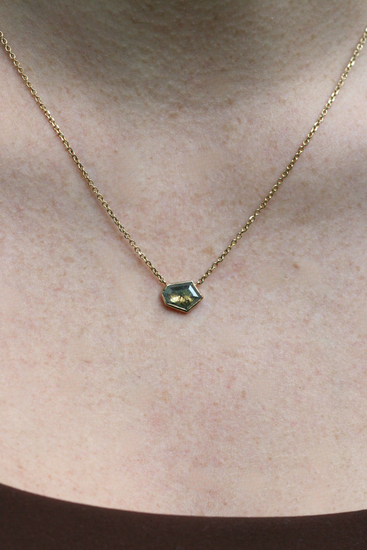Introducing the "Daviana" necklace, a captivating piece featuring a 2-carat salt and pepper diamond in an abstract shape. This unique diamond, with its dark grey color that shifts and sparkles, is bezel-set in buttery 14k yellow gold, highlighting its intriguing inclusions and freckles. With a smooth, golden back, you could engrave a sentimental thought. The more you look, the more you discover within this mesmerizing stone. Suspended from a sturdy cable link chain, the "Daviana" necklace is a beautiful and unique gift, perfect for someone who appreciates understated elegance with a touch of the extraordinary.