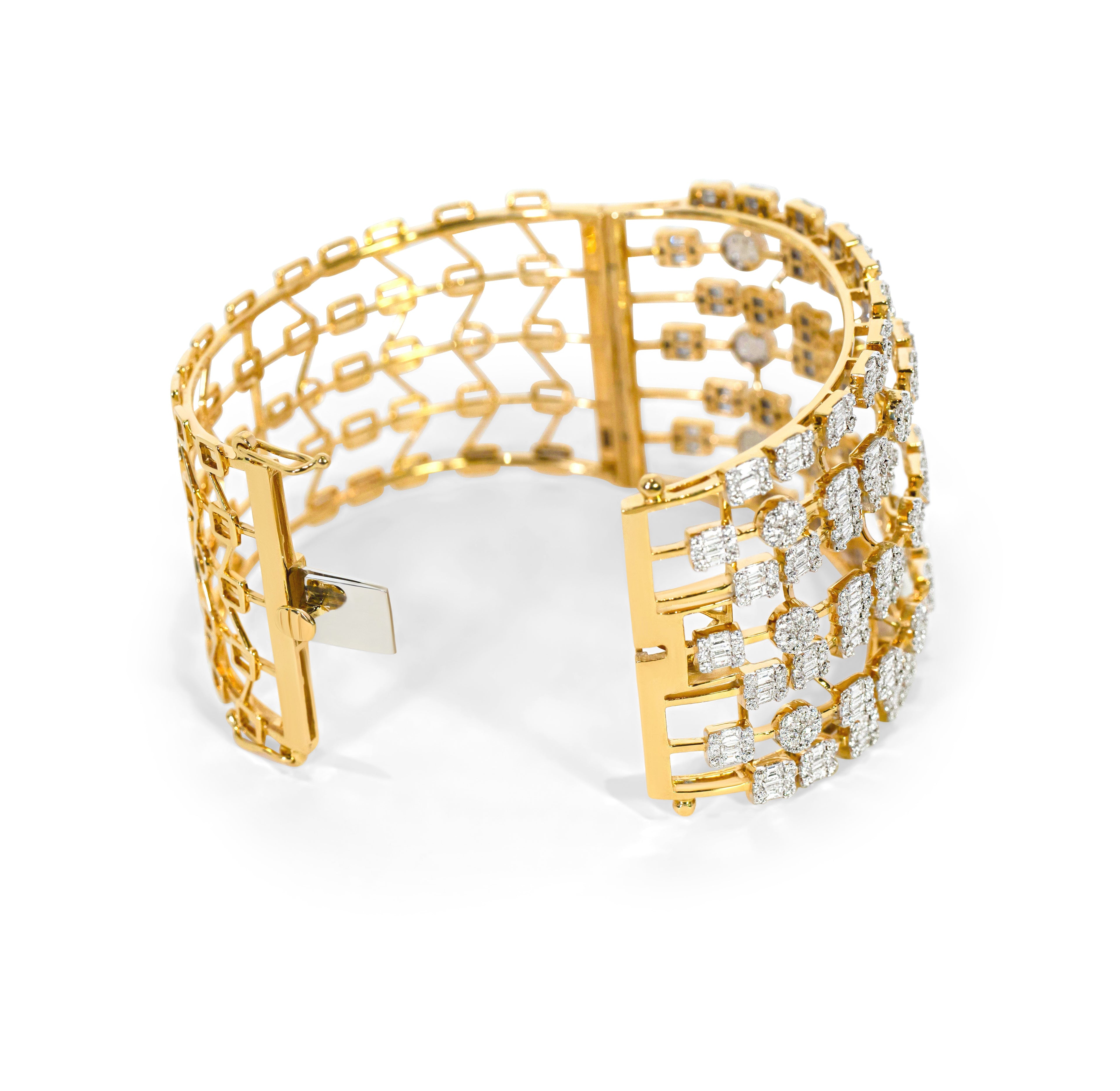 The "Delphine" Bracelet is a breathtaking statement piece, featuring seven rows of 720 meticulously arranged diamonds in round, princess cut, and baguette shapes. With a total carat weight of 10.37, the intricate patterns created by the varying diamond cuts are beautifully illuminated by the masterfully crafted gold design, which allows light to enhance their brilliance. Perfect for the woman who has everything, this bracelet is as secure as it is stunning, with two safety clasps atop a handmade open box clasp and a hinged design for effortless wear. Its unparalleled sparkle and exquisite detail make it a true masterpiece of luxury and elegance.