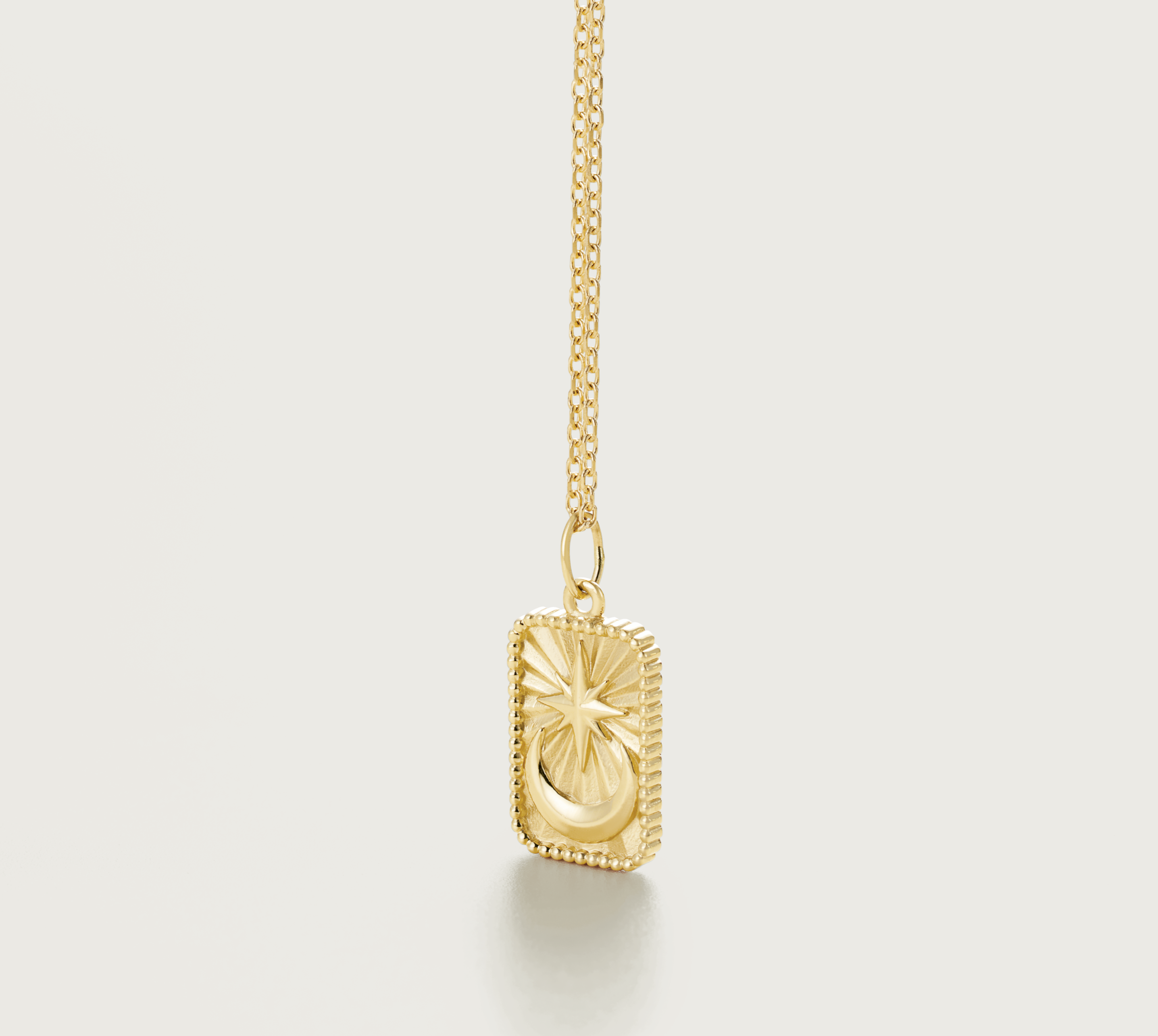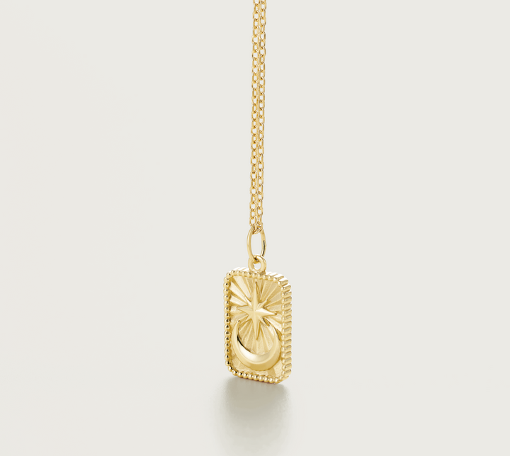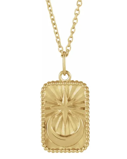 Transform any outfit into a luxurious ensemble with our "Divine" Necklace. Crafted from delicate 14k yellow gold, the pendant features a mystical moon and star design surrounded by radiant rays of light. The intricate beaded edge adds a touch of sophistication. Perfect as a sentimental gift for your moon and stars, this necklace is sure to impress with its thoughtful and elegant design.