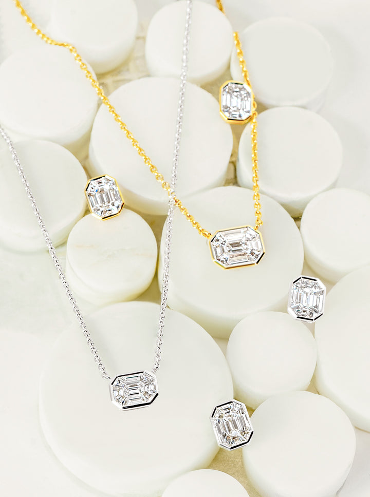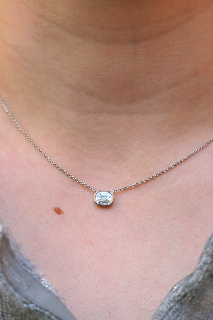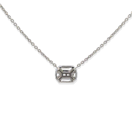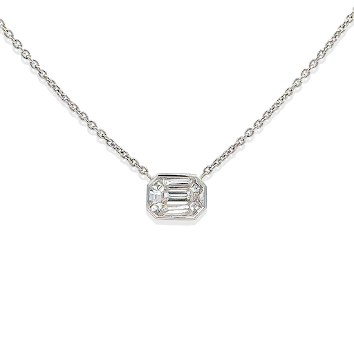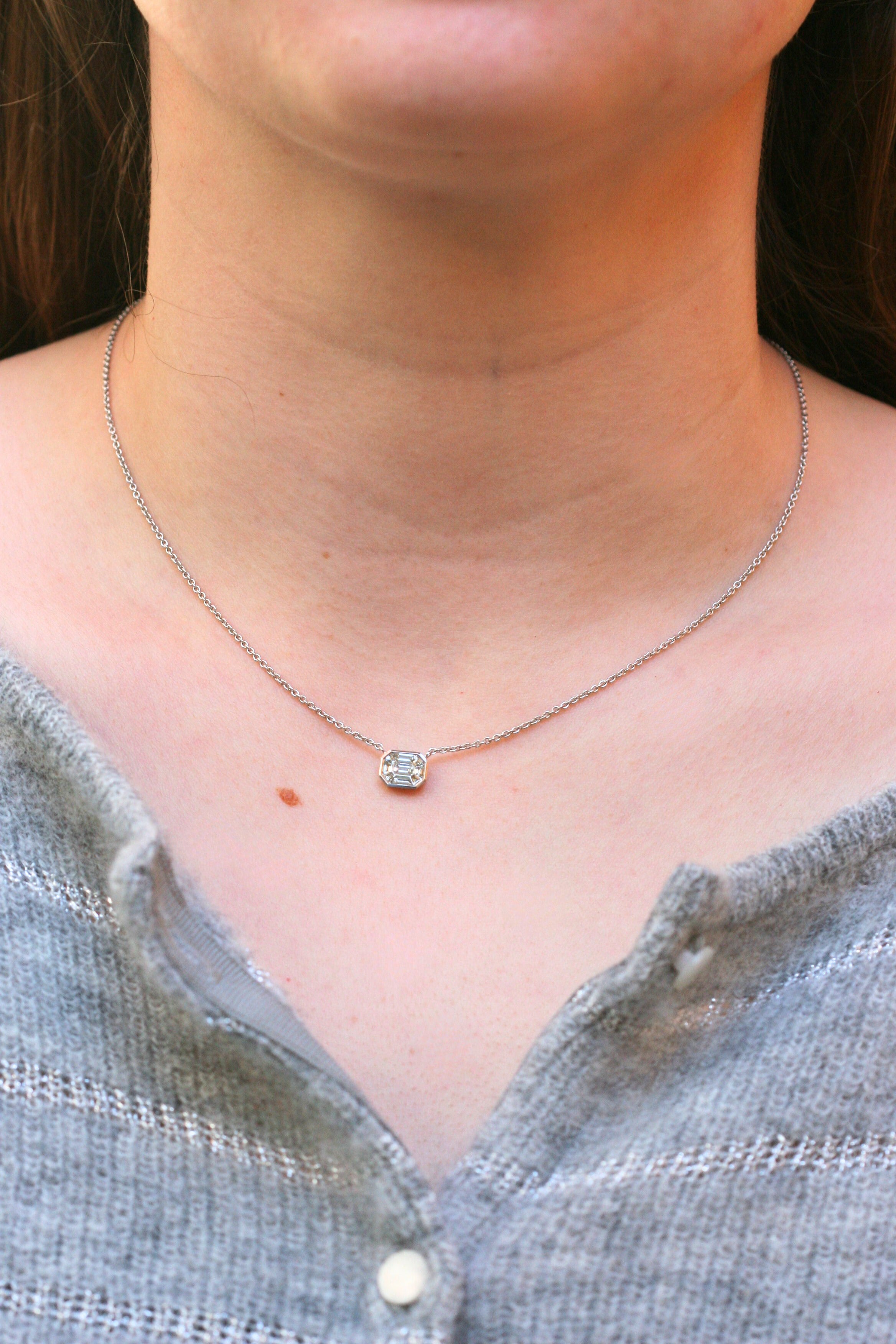 The "Mosaic" Necklace is a modern masterpiece, featuring nine baguette-cut diamonds bezel set in 18k white gold. Designed to emulate the striking look of a 2-carat emerald cut diamond, this necklace offers a luxurious aesthetic without the high price tag. The invisible setting allows the diamonds to lay flush against the chest, ensuring comfort and a sleek appearance. Suspended on an adjustable 15.5-18" cable link chain, it’s versatile enough to wear solo as a statement or layered for a more dynamic look. Complete the set with our "Mosaic" earrings for an elegant, cohesive style.