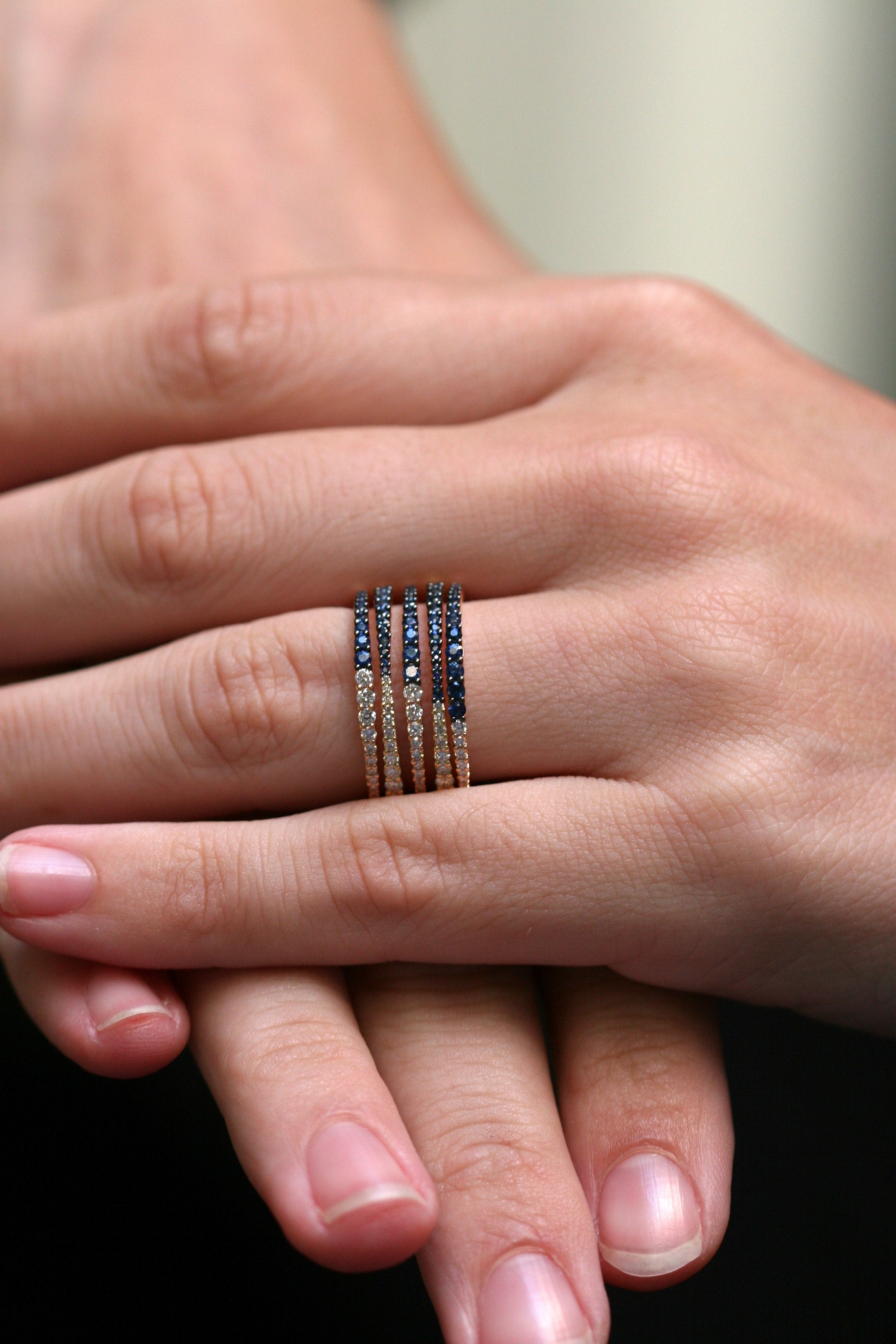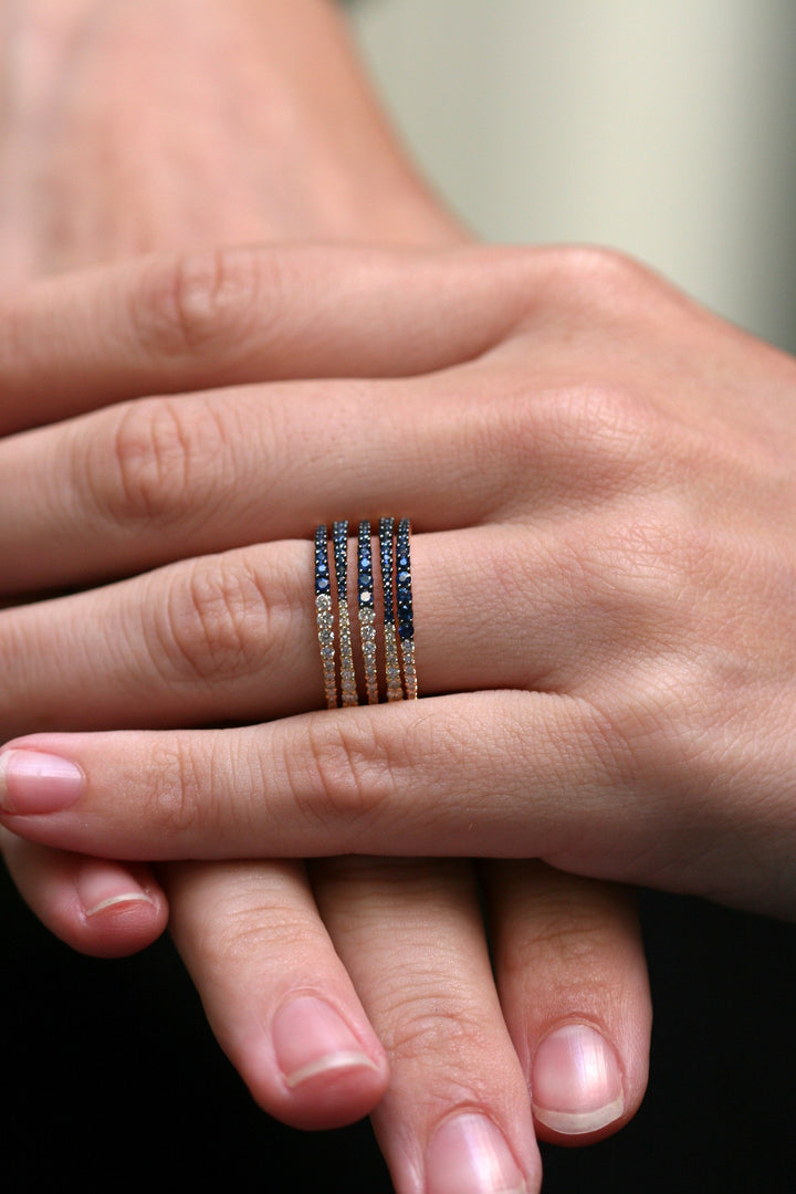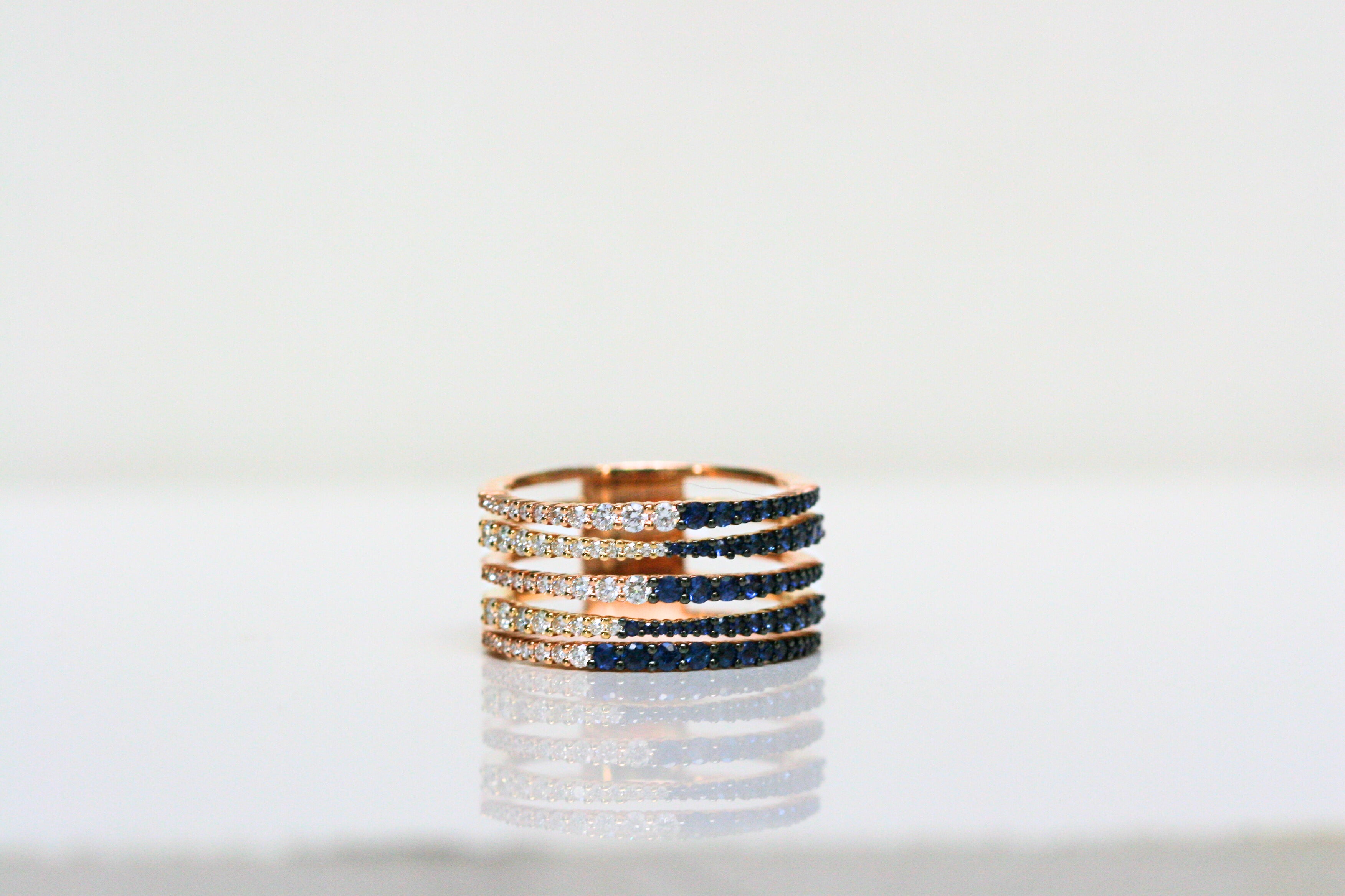 Experience luxury with our "Rivers" Ring. This stunning statement piece is crafted from 18k rose gold and adorned with 62 deep blue sapphires and 51 bright diamonds, creating rivers of shimmering gems across your finger. Not only is it a unique addition to your jewelry collection, but it is also expertly designed for comfort. Elevate your look with this elegant and exclusively Carats & Stones ring.