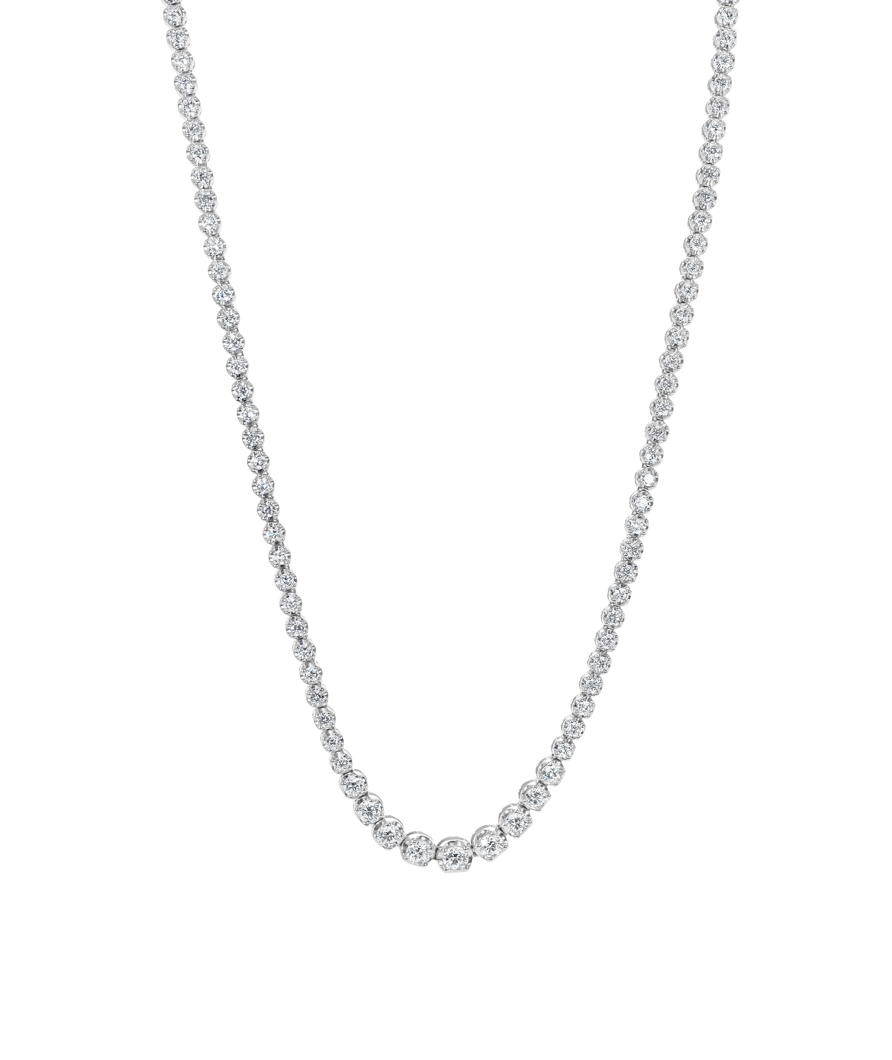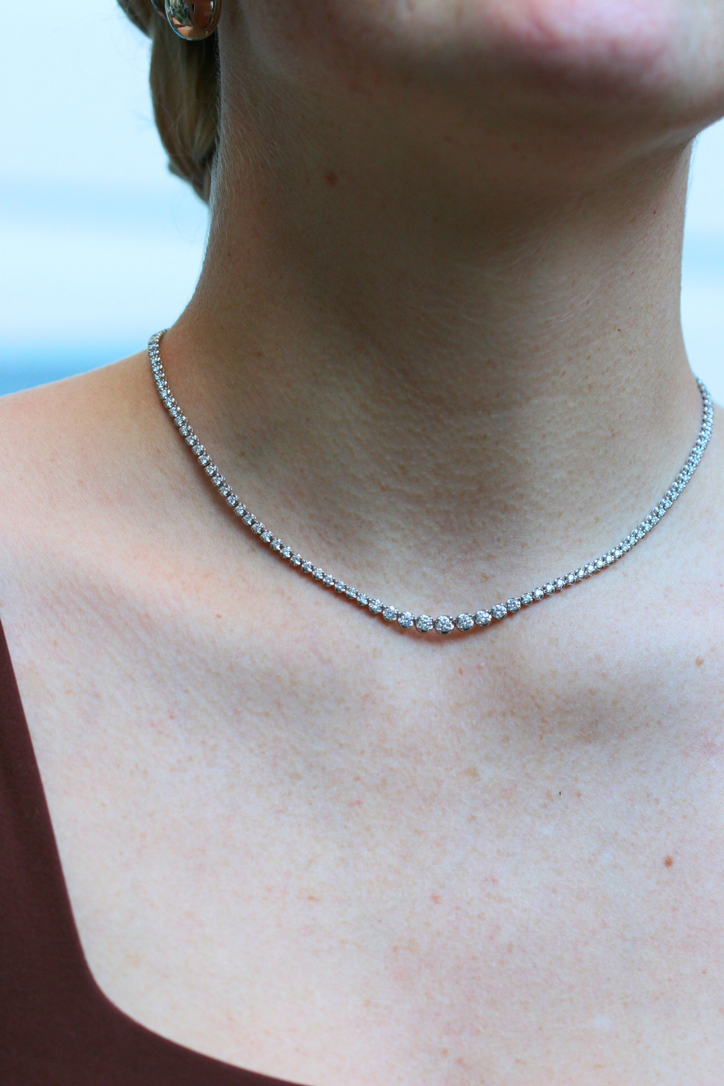 The tennis necklace takes inspiration from the iconic tennis bracelet, which became famous after a match involving tennis star Chris Evert in the 1970s, when her diamond bracelet broke mid-game. The term now refers to elegant, seamless designs featuring aligned diamonds. With their enduring style and luxurious sparkle, tennis necklaces are a sophisticated addition to any jewelry collection.