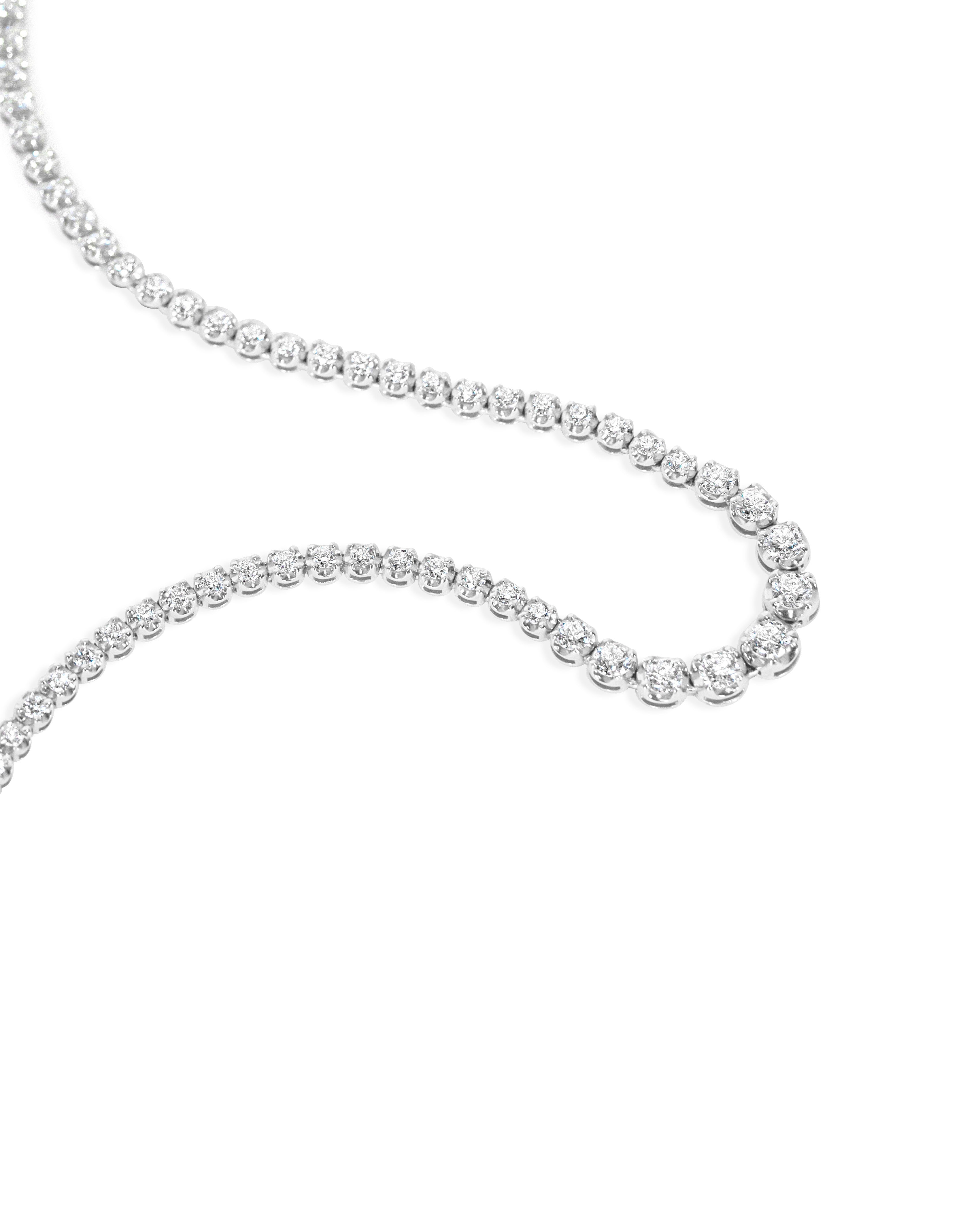 The "Eridani" Necklace, named after the constellation Eridanus and its brilliant stars, embodies celestial elegance. Featuring over 4 carats of graduated diamonds, this timeless piece sparkles beautifully under any light. Designed with thoughtful craftsmanship, the necklace’s settings ensure it stays perfectly in place, preventing flipping during wear. Set in 18k white gold, it combines stunning beauty and practicality with a secure box clasp and additional safety. At 16.5 inches, this necklace is a gorgeous bridal accessory or a cherished gift. Complimentary resizing is offered for the perfect fit.