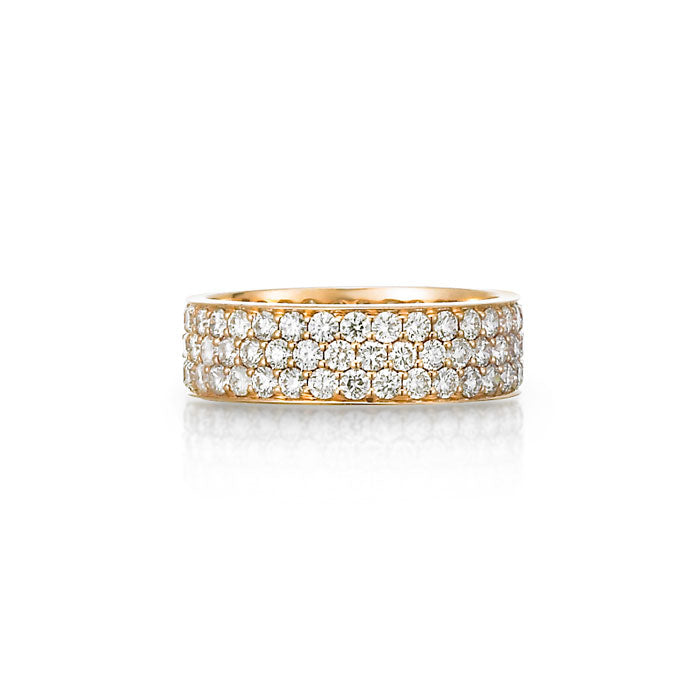 A distinctive three-row pavé setting is the hallmark of this astonishingly radiant 18-karat rose gold ring that carries 99 brilliant round diamonds, weighing more than 2 carats in all. Some sizes may carry an additional charge.