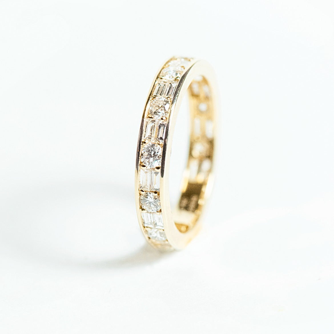 The "Gwyneth" eternity band features alternating round and double-emerald cut diamonds wrapping around the entire ring. With almost 1.5ct worth of diamonds, this is for those who want a more substantial look.