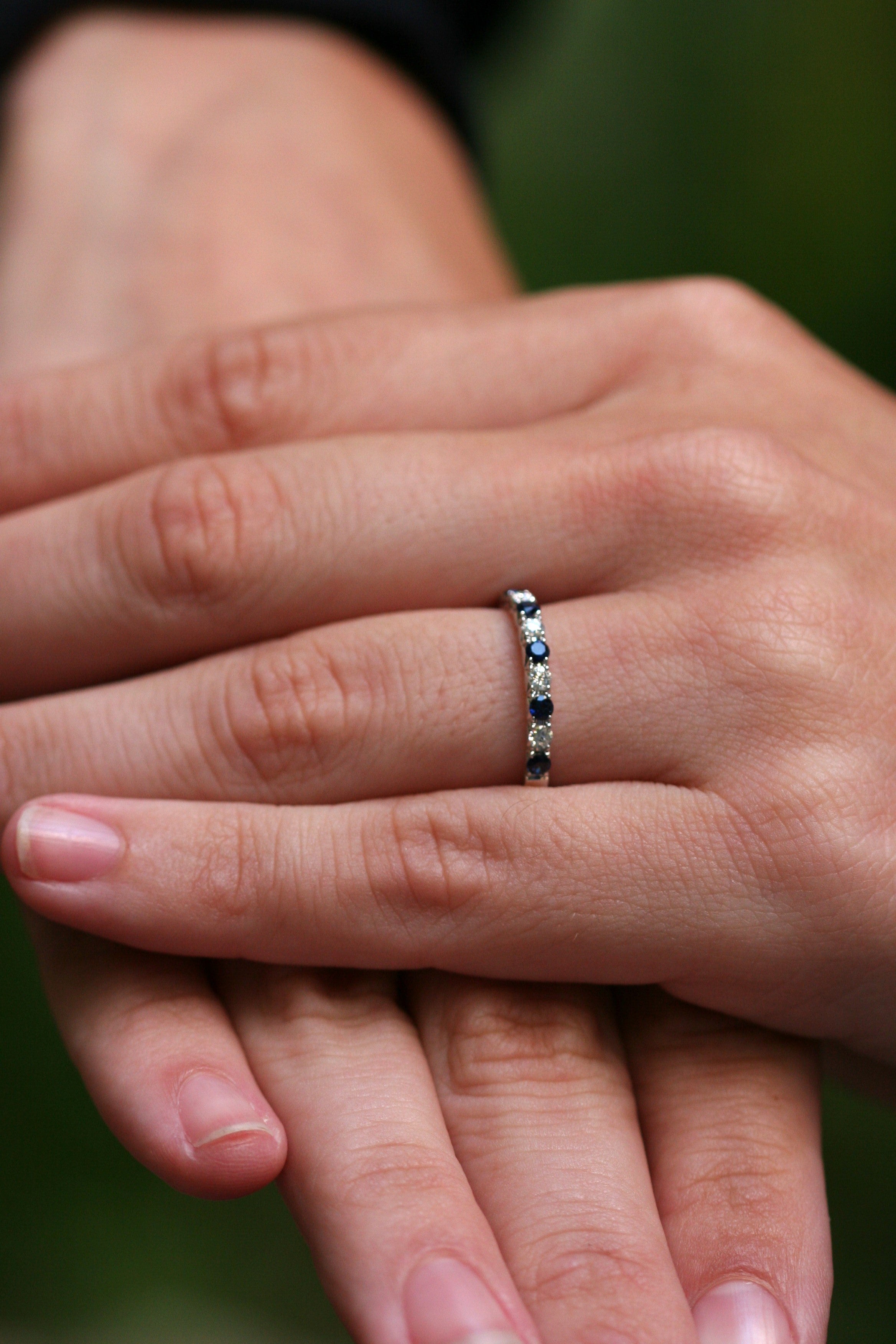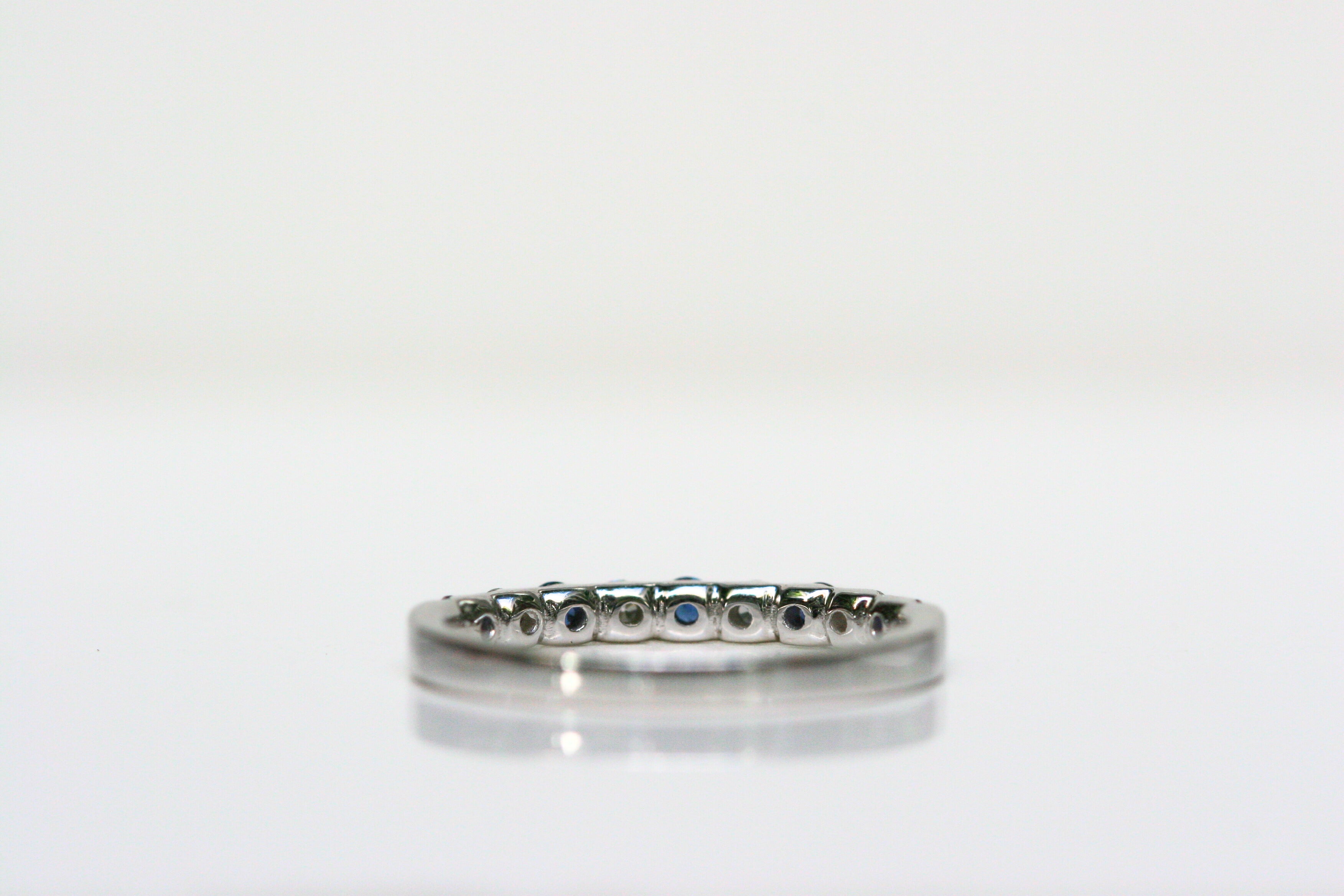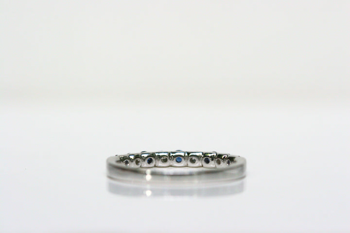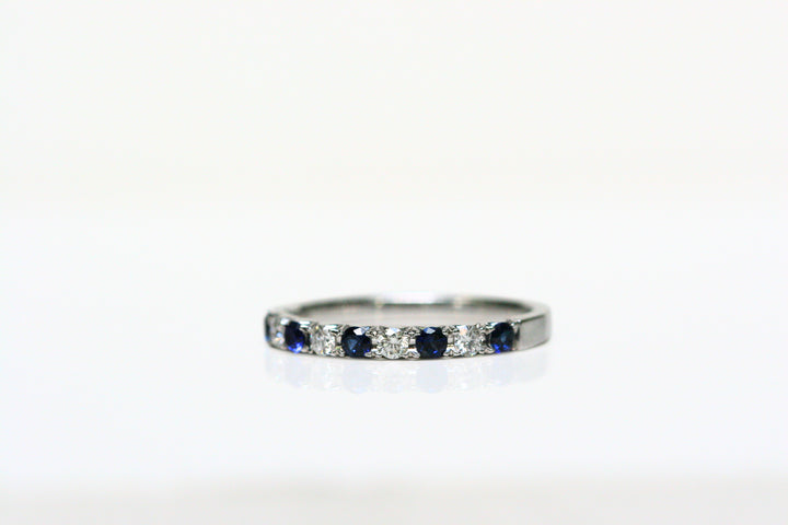 Indulge in the delicate elegance of the "Lila" Ring. Alternating 5 sapphires with 4 diamonds, it's perfect for a sophisticated wedding band or a sparkling addition to your daily stack. With the sapphires representing September's birthstone, it's also a thoughtful birthday gift.