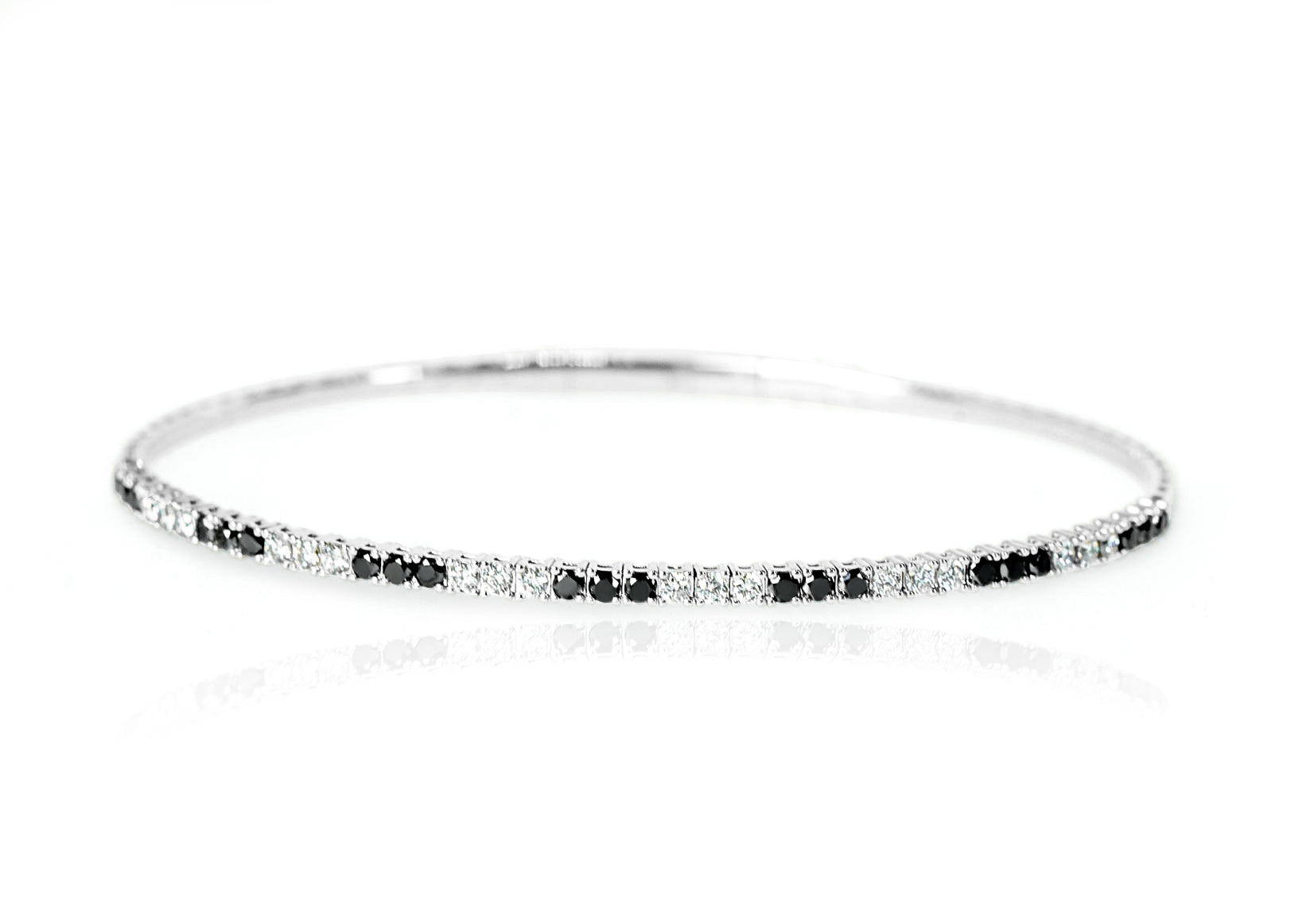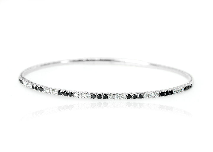 The "Ranya" Bangle is a sophisticated blend of elegance and practicality, featuring 21 dazzling white & stunning black diamonds set in a sleek white gold design. Its titanium wire core provides flexibility, making it easy to slip on and off. The oval shape ensures the diamonds stay perfectly aligned on your wrist, offering both comfort and style. Ideal for everyday wear, this bangle can also be stacked with other "Ranya" bangles for a bold, statement look.