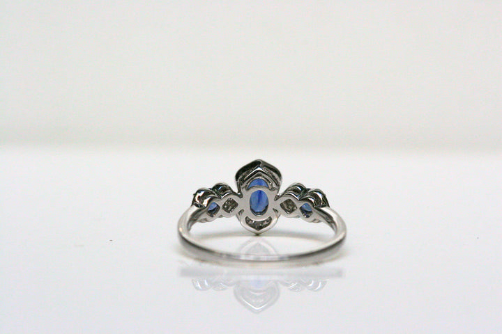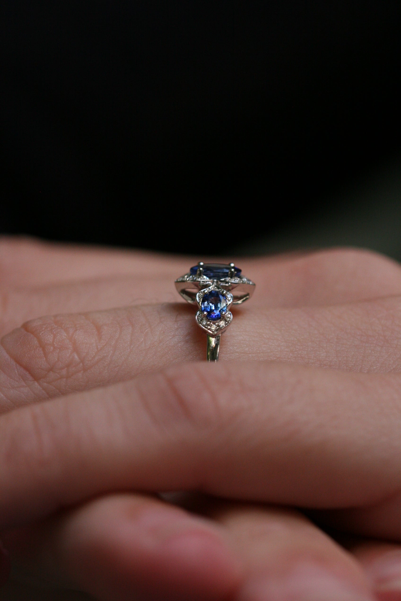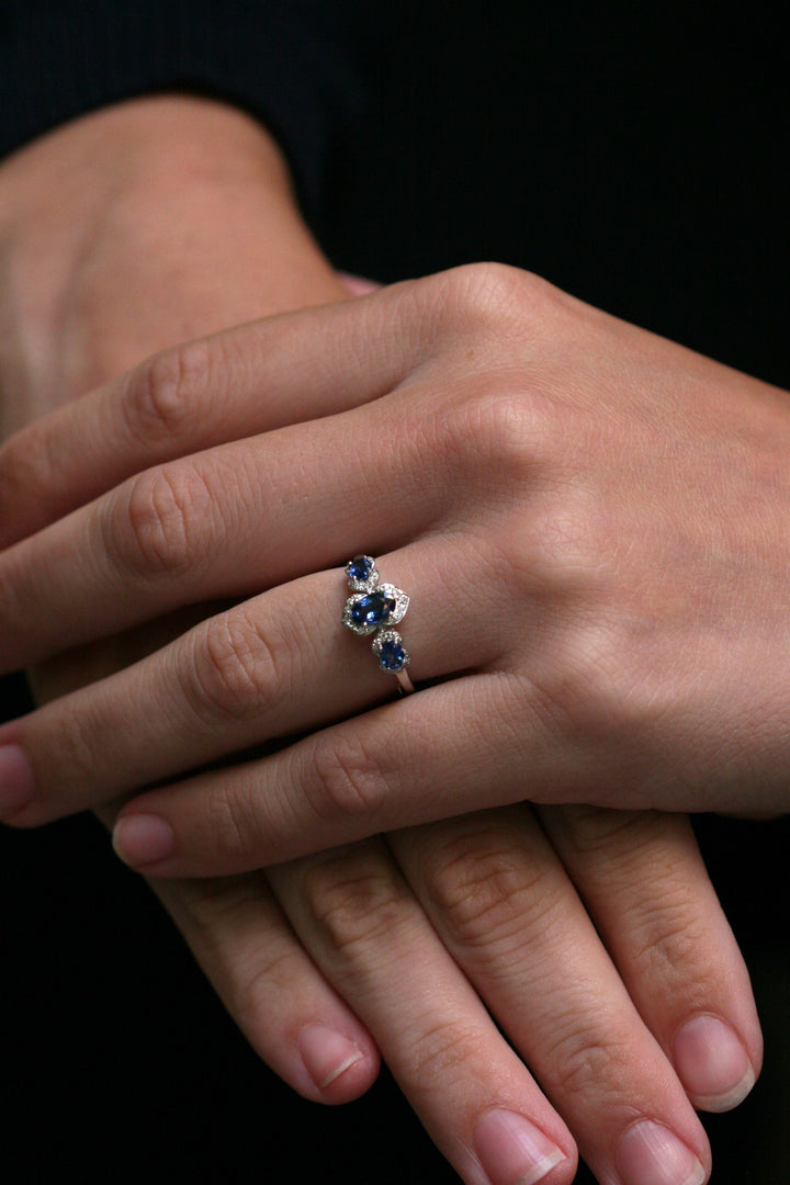 Introducing "Thea" Ring, a vintage-inspired masterpiece featuring three oval cut sapphires, with a halo of pave set diamonds on the center stone and offsetting side stones. This art deco beauty sparkles with elegance and is the perfect unique engagement ring or September birthday gift, as sapphire is the birthstone. Make a statement with "Thea" Ring.