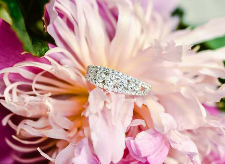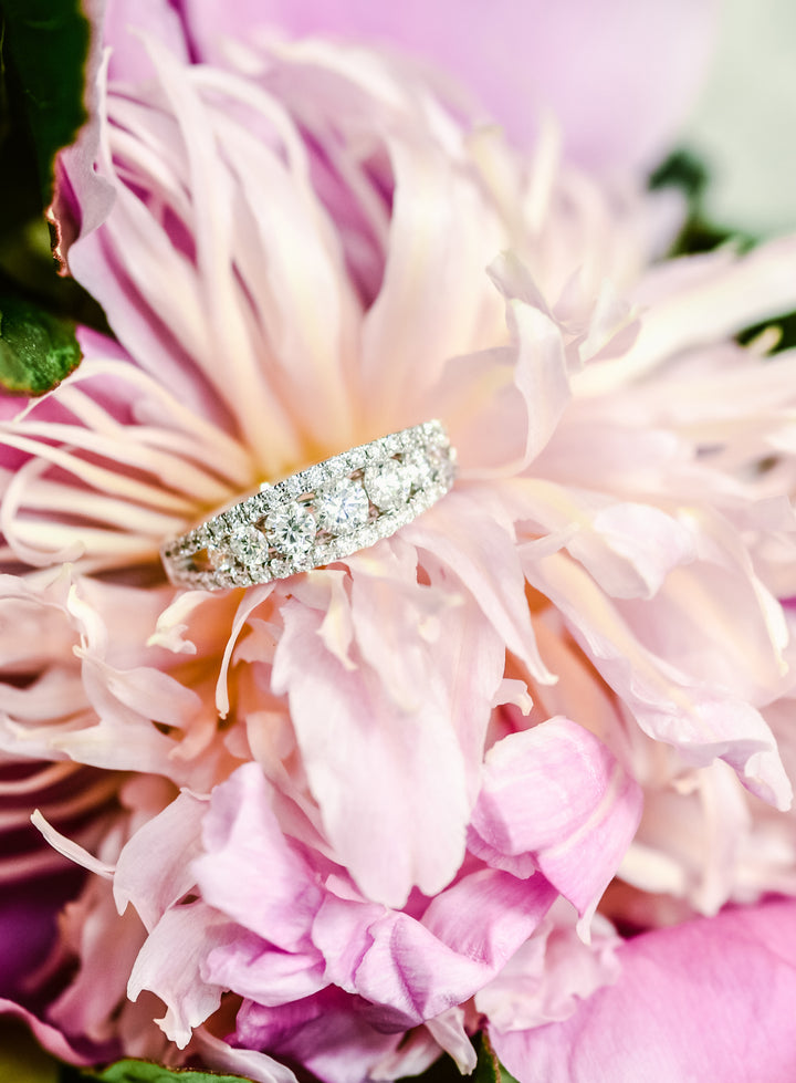 A timeless symbol of your enduring love. This exquisite anniversary band showcases three rows of sparkling round brilliant cut diamonds. The graduated stones create a mesmerizing effect, delicately nestled between two pave diamond bands to create a unique and impactful look.