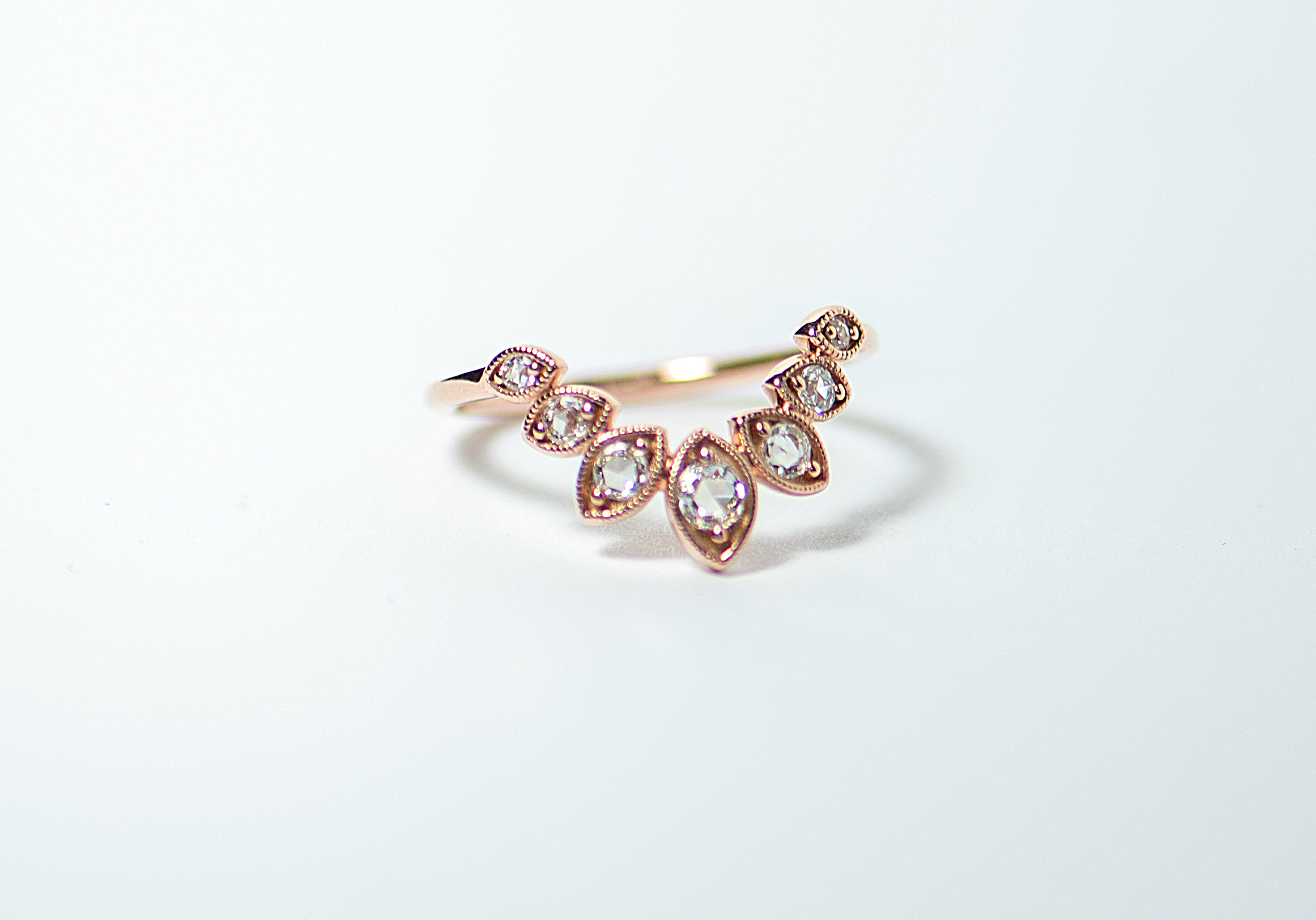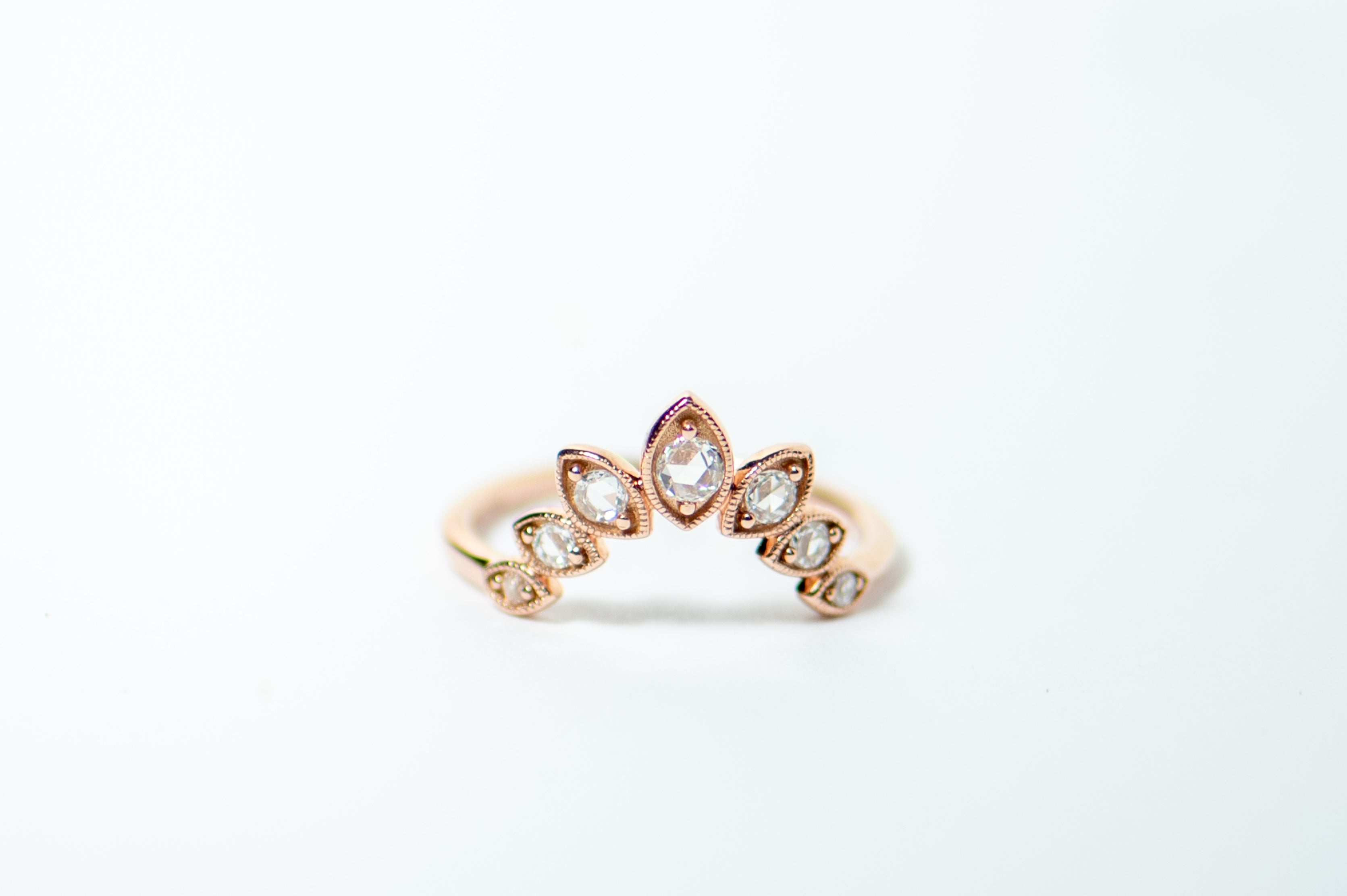 Indulge in the enchanting allure of our "Rosewood" Ring. Crafted with exquisite rosewood and accented by 7 round diamonds, it exudes elegance and exclusivity. Its crown design makes it perfect as a stunning wedding band or a stacking ring. Dipped in soft rose gold, it is a truly unique piece that will captivate all.