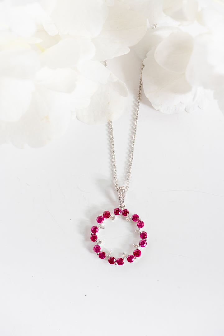 Presenting the "Rubina" Ruby Pendant, a stunning emblem of timeless elegance. Crafted in luxurious 18k white gold, this pendant showcases an unending circle of fiery rubies and dazzling diamonds, intricately set in shared prongs. The radiant rubies and sparkling diamonds exude opulence, illuminating any attire with sheer sophistication. Elevate your ensemble with this exquisite pendant, a harmonious fusion of luxury and enduring beauty. (Chain sold separately)