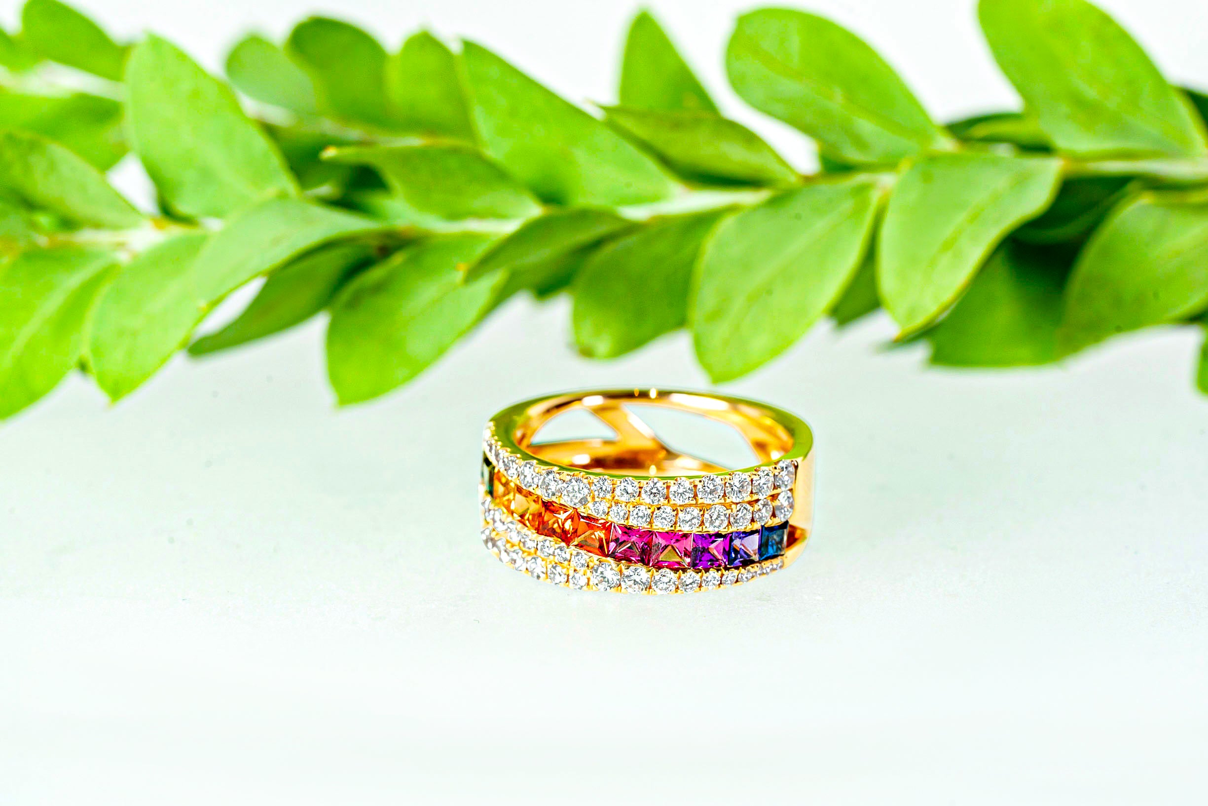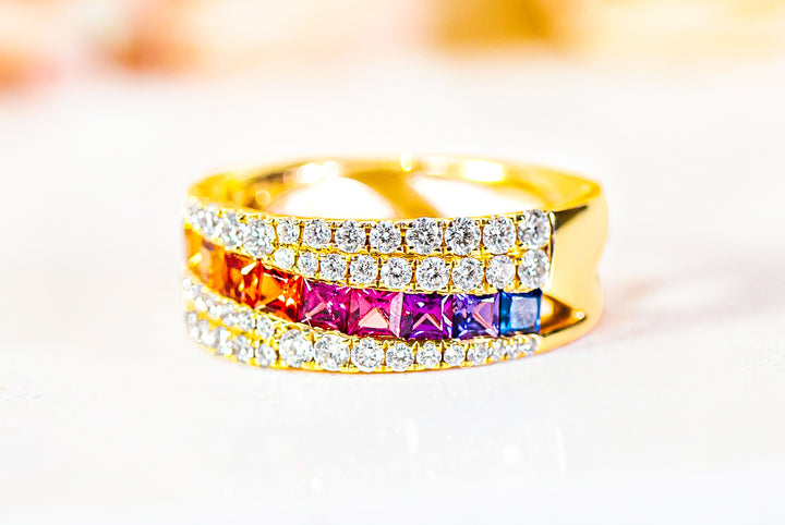 Indulge in the ultimate luxury with our "Rainey" Ring. Featuring a stunning array of princess cut sapphires in a vibrant rainbow surrounded by dazzling diamonds, this statement band is the epitome of elegance. Crafted in 18k rose gold, this ring is the perfect addition to your fine jewelry collection.