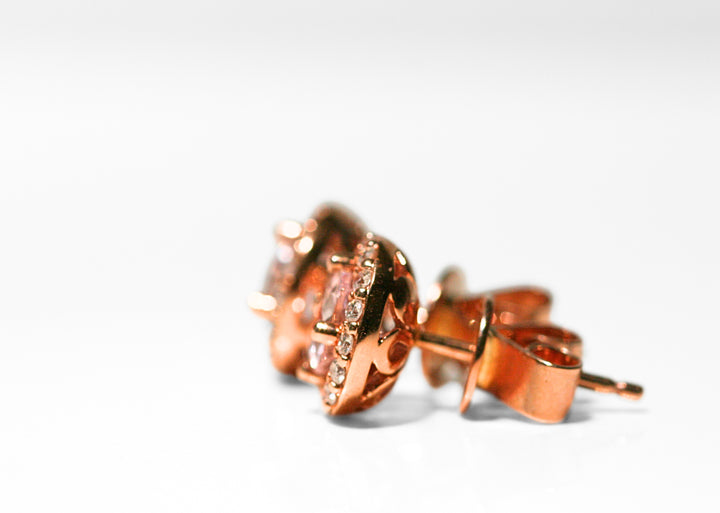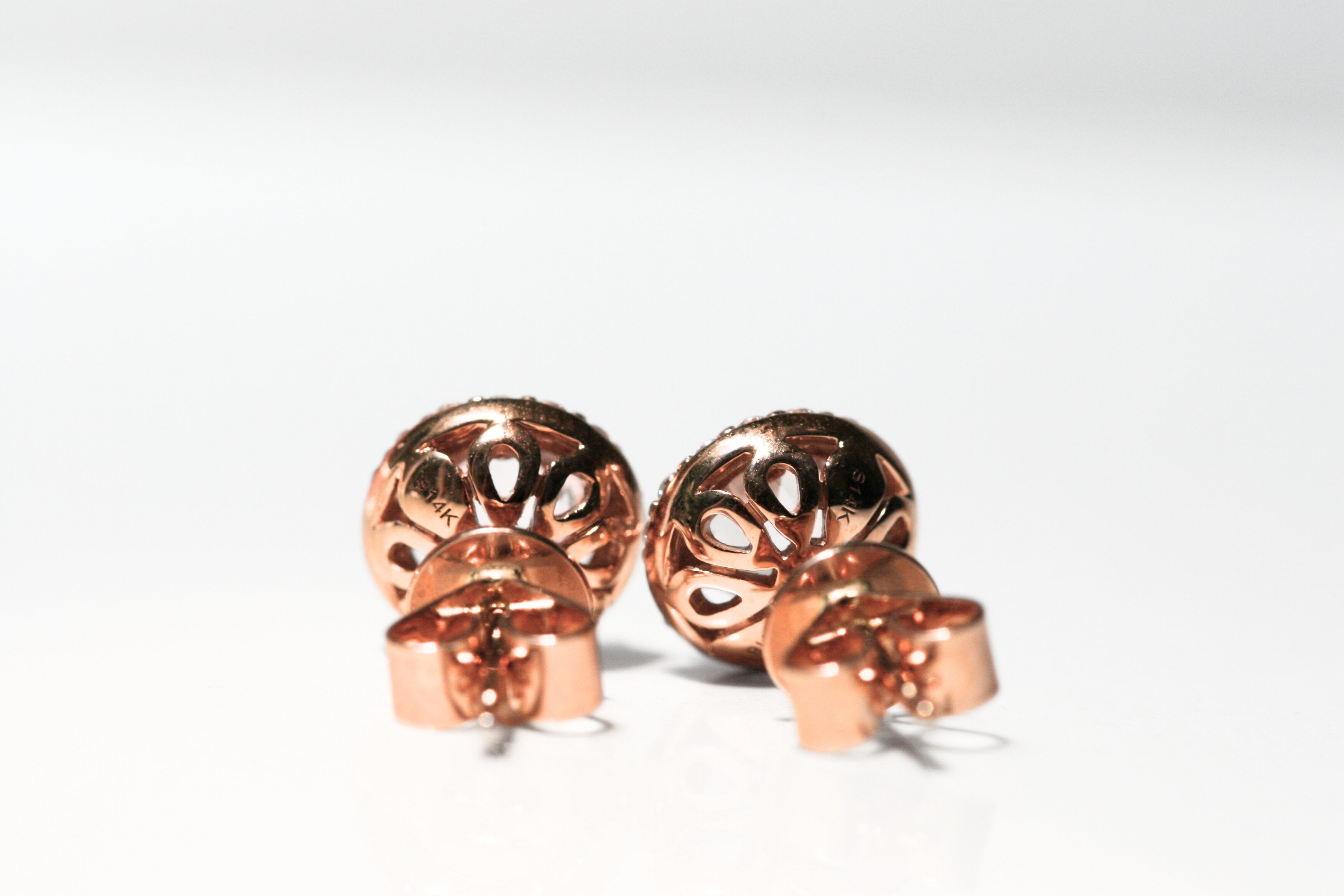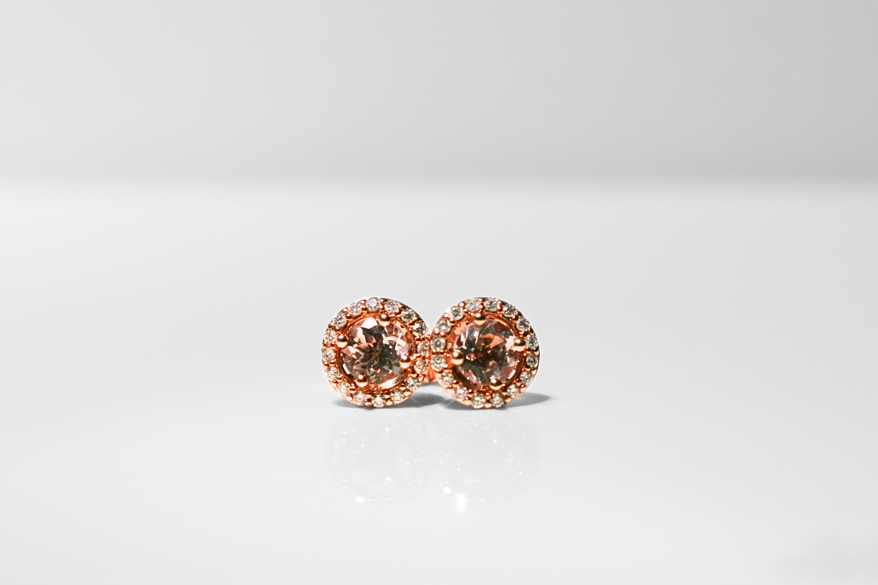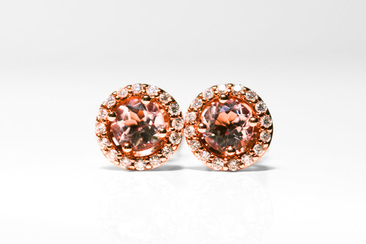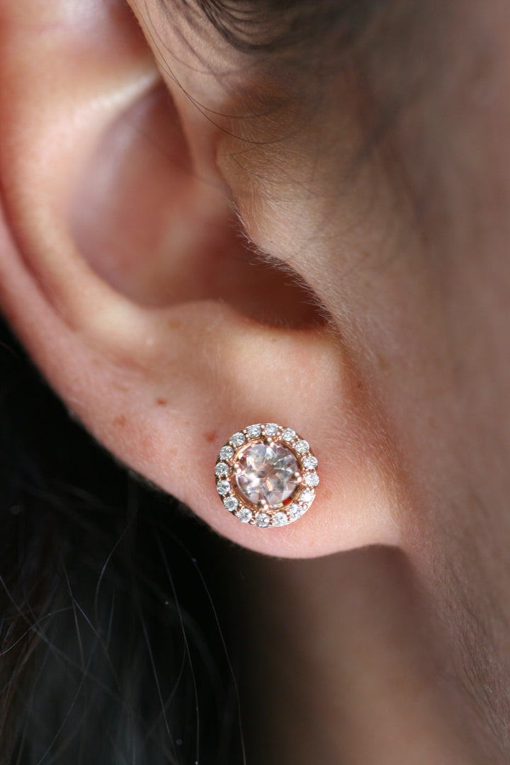 The Rosa earrings feature two round morganite stones, surrounded by a delicate halo of diamonds. These studs, featuring a friction back closure, lay comfortably upon the earlobe. 14k rose gold brings out the pink hues in the morganite, sparkling brightly in the light. These studs are perfect for everyday wear!
