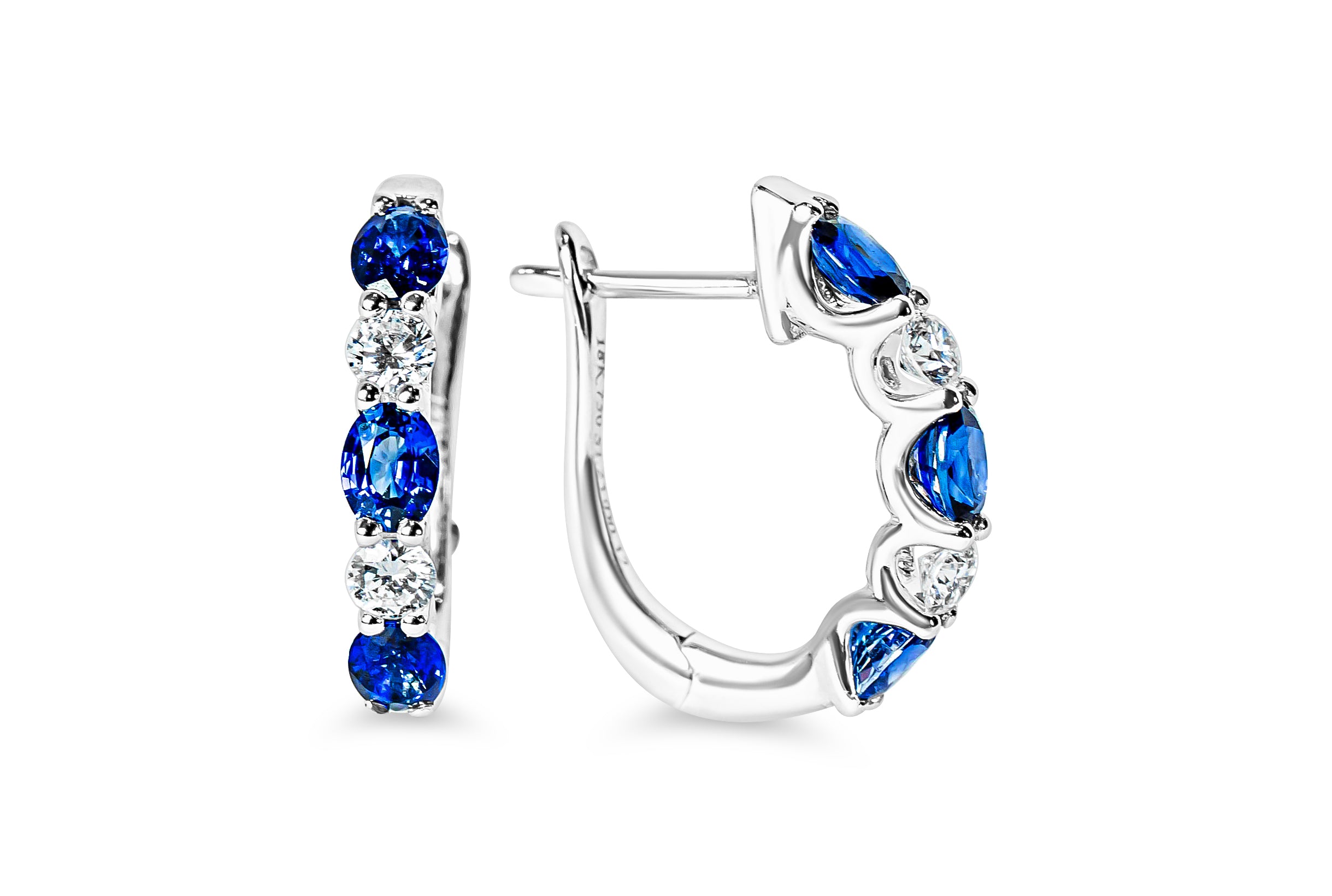 The "Saskia" Earrings are a delicate and feminine design, featuring three oval-cut sapphires and two diamonds per earring, all set in 18k white gold. Their shared prong setting enhances the natural brilliance of the stones, while the sapphires add a touch of "something blue" for special occasions. These dainty hoops are perfect for adding a subtle sparkle, with a secure latch-back closure ensuring comfort and ease for everyday wear. Timeless and elegant, the "Saskia" Earrings bring effortless sophistication to any look.