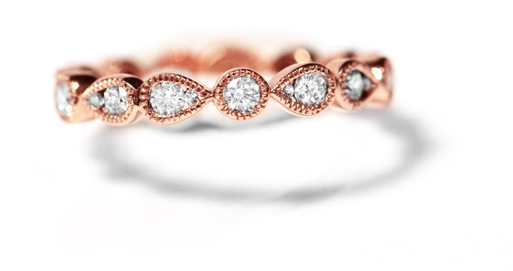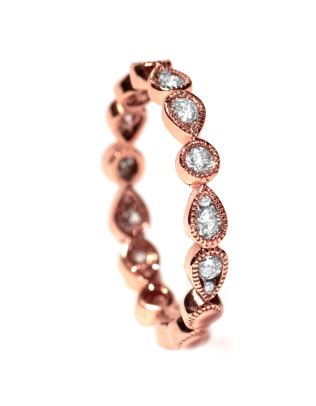 Introducing "Rosemarie" - the epitome of eternal love and commitment. Our exquisite eternity ring, adorned with round and pear-shaped diamonds, is the perfect addition to any wedding band collection. Crafted in luxurious rose gold, it is a timeless piece that embodies sophistication and everlasting beauty.