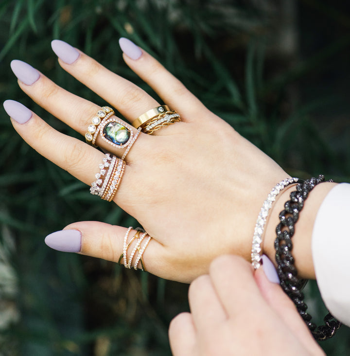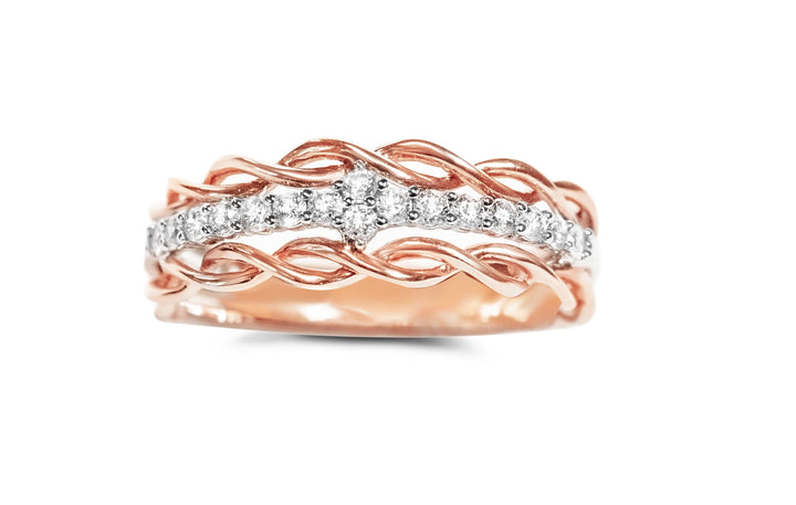 Elevate your style with our "Love Poem" Ring. This fashion-forward stacking ring adds a pop of brightness to any outfit. With its playful design and luxurious feel, it's the perfect statement piece for the fashion-savvy individual. An enchanting creation, the "Love Poem" Ring features brilliant diamonds in the center and an intricate rose-gold vine tracing the outside. So go ahead, add a touch of fun and sophistication to your wardrobe with our "Love Poem" Ring.