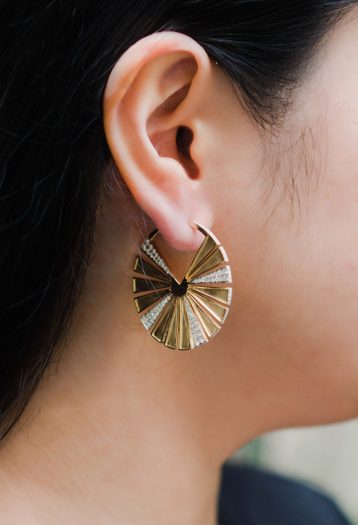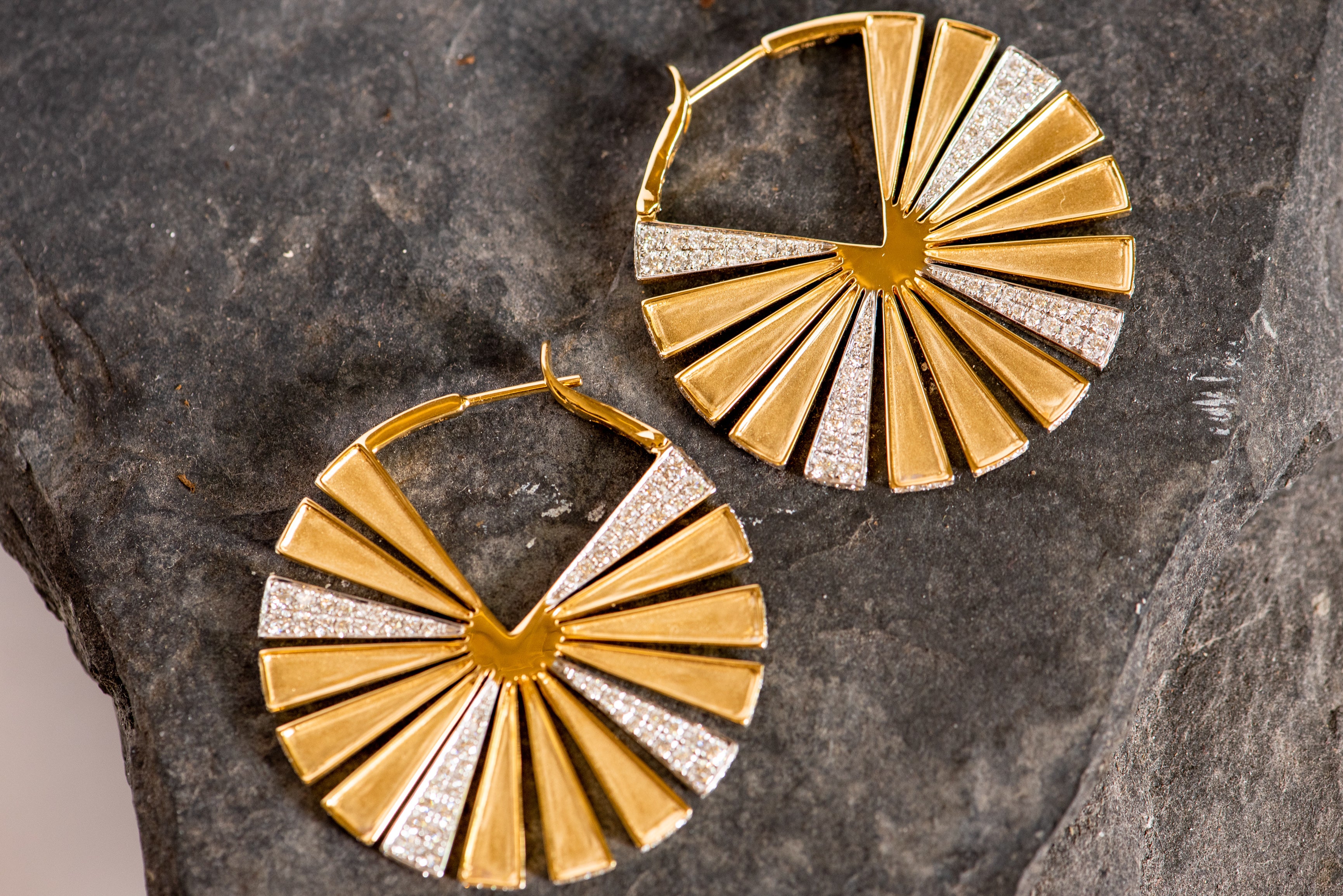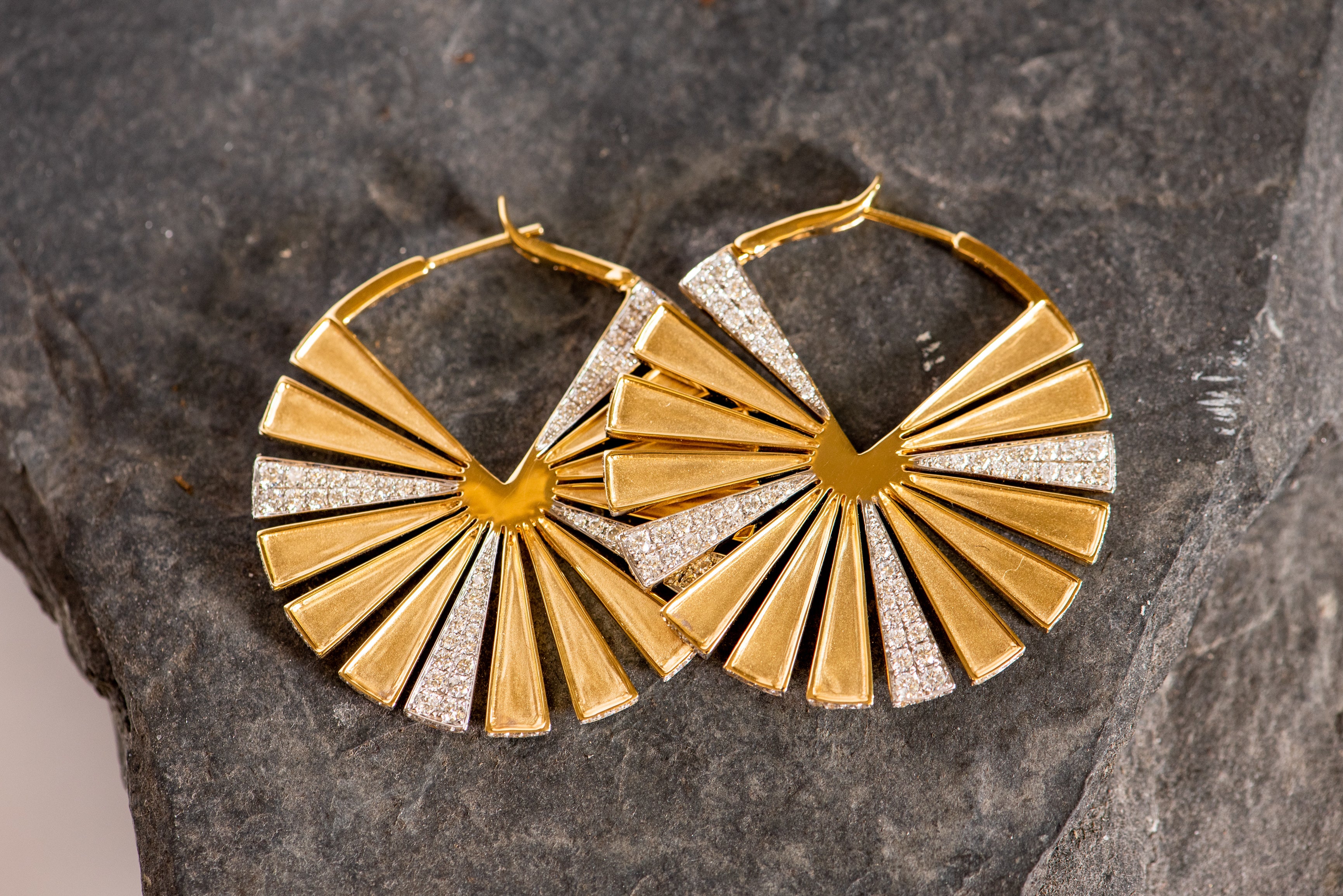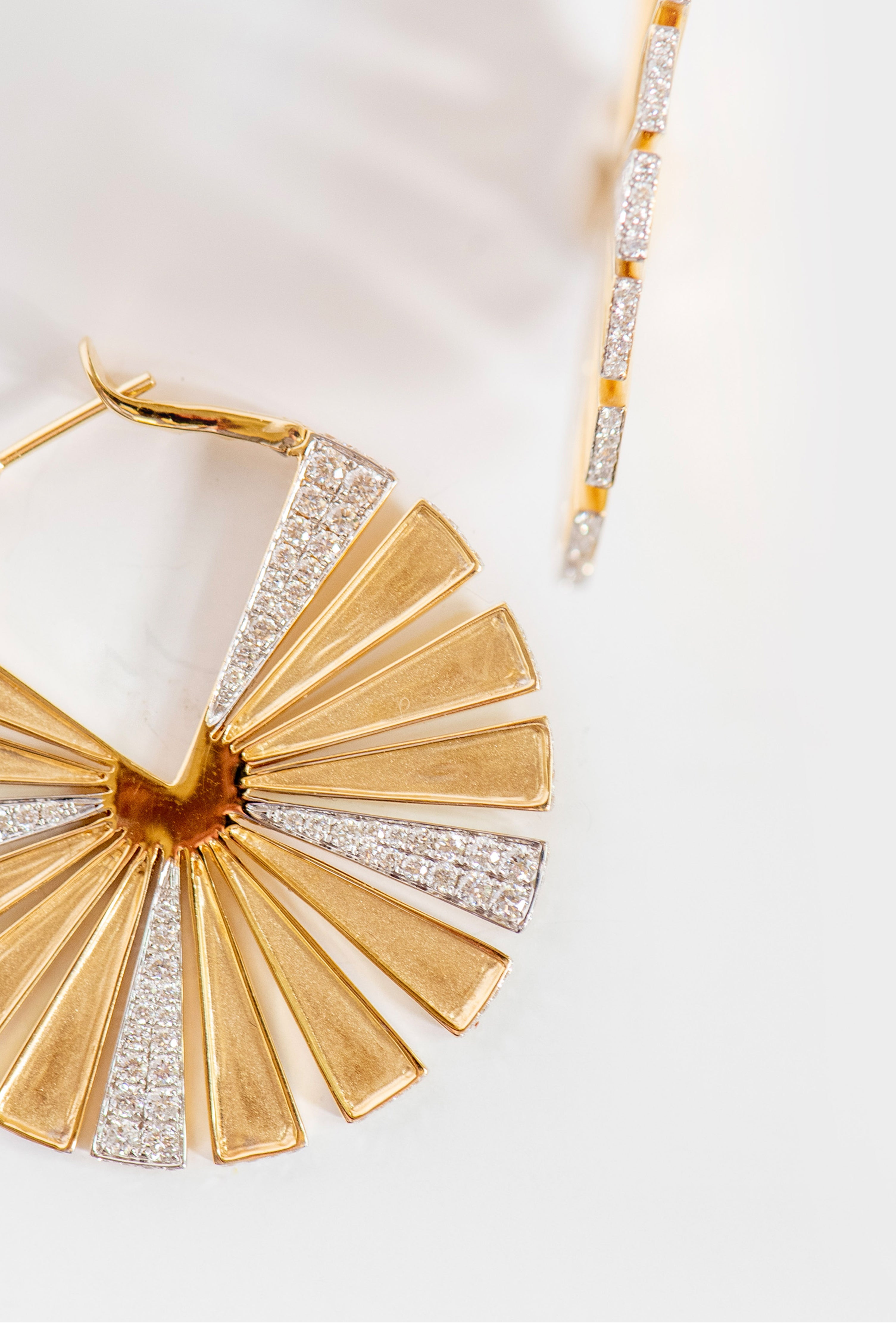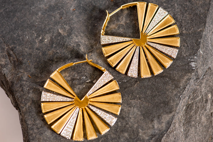 Discover the epitome of celestial elegance with our "Zaraya" Earrings. Crafted in radiant yellow gold, these hoop earrings boast a mesmerizing sunbeam-inspired design adorned with dazzling diamonds. Elevate your style effortlessly with the captivating sparkle of the "Zaraya" Earrings, a statement piece that exudes sophistication and charm.