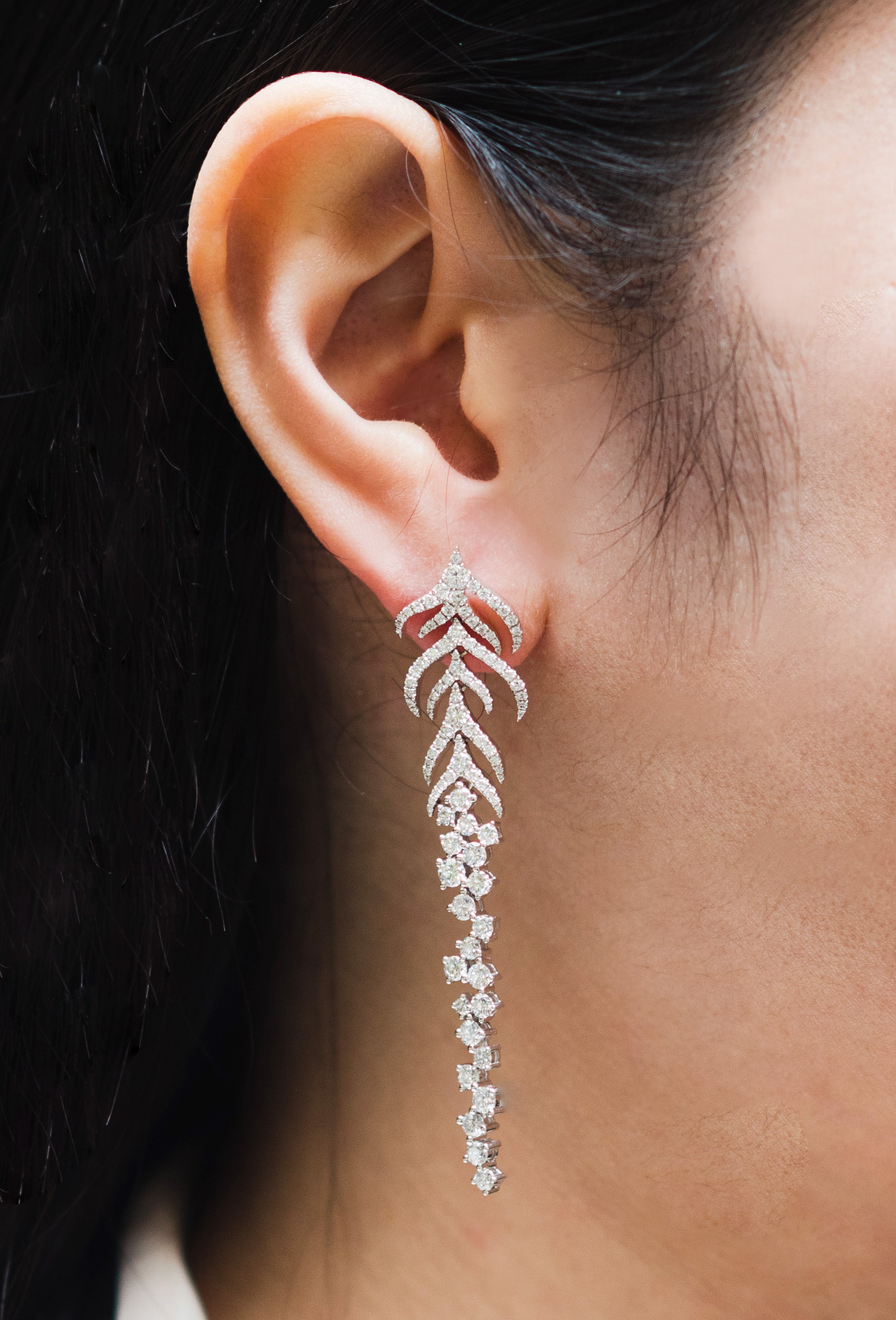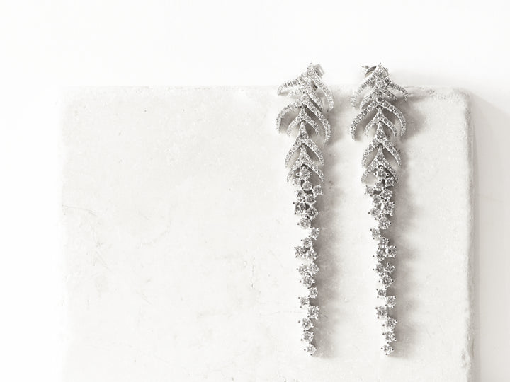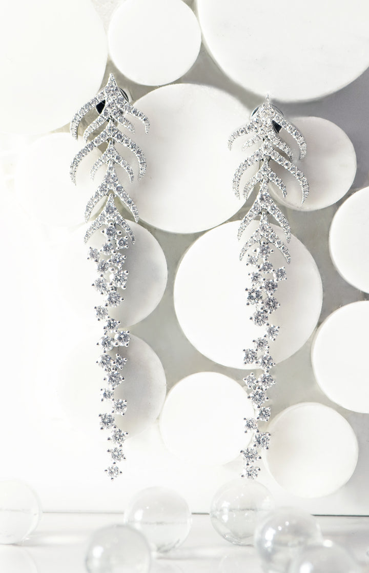 Step into luxury with our "Isadora" Earrings. With over 4 carats of diamonds, these chandelier earrings feature a stunning feather design. Effortlessly elegant with a friction back closure, they add glamour to any occasion. Elevate your style with the timeless allure of "Isadora".