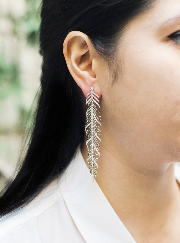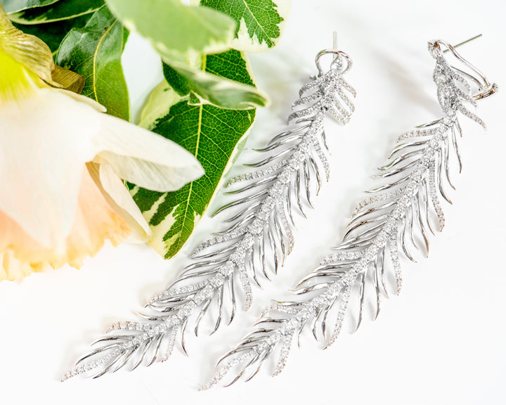 Experience the essence of elegance with our "Odette" Earrings. These delicate dangle earrings feature 14k white gold feathers adorned with 364 sparkling diamonds, creating a one-of-a-kind piece. Embrace movement and make a statement with these exclusive earrings.