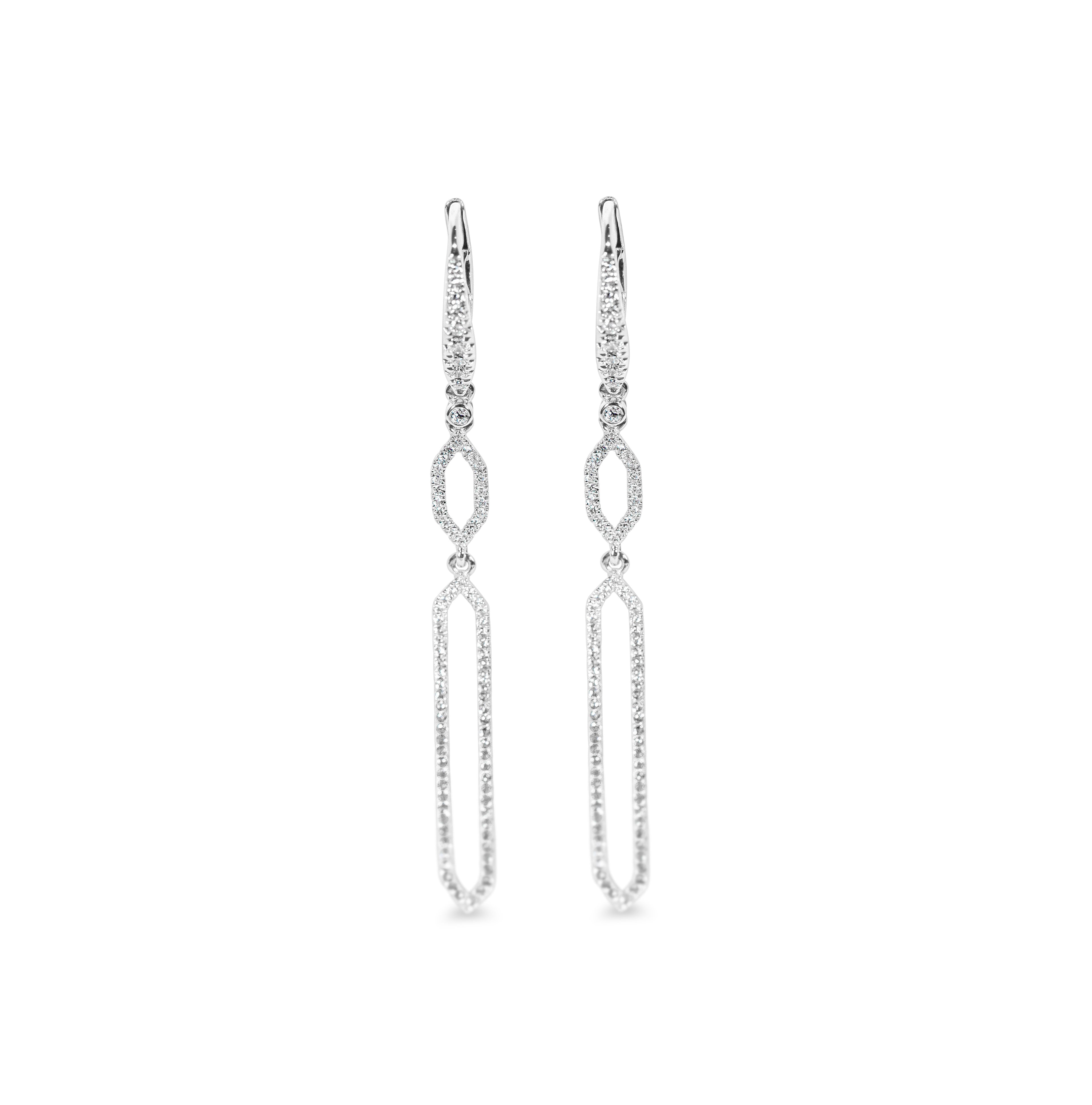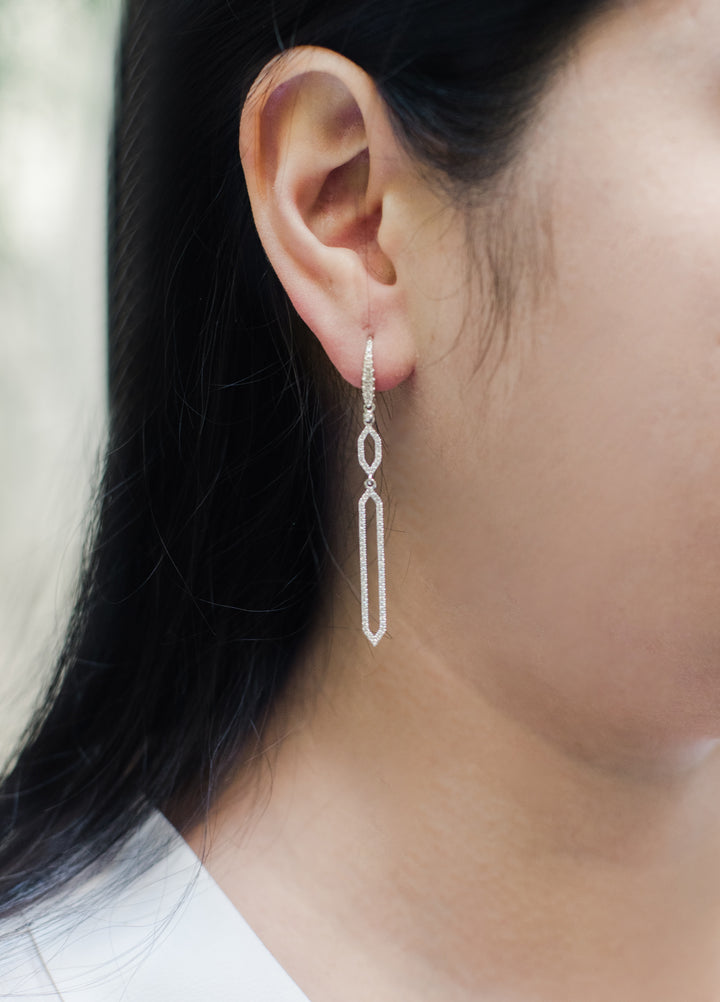 Step into modern luxury with our "Josephine" Earrings. Crafted in white gold, these geometric diamond dangling earrings feature a chic hexagon frame adorned with round brilliant cut diamonds. With a secure lever-back closure, they offer both style and peace of mind. Elevate your ensemble with the captivating allure of "Josephine".