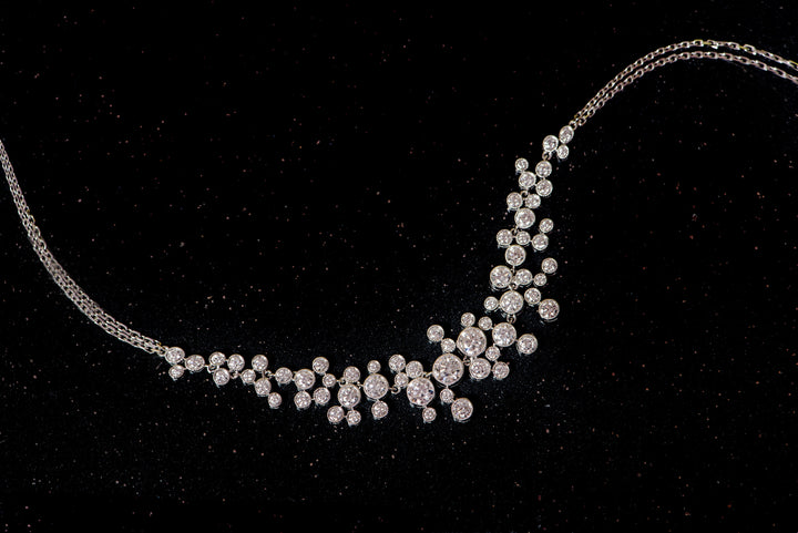Indulge in luxury with our "Prosecco Delux" necklace. This diamond statement piece, with its double link chain, is part of our exquisite Prosecco Collection. Channel the celebratory spirit and elegance of bubbles in prosecco with this bridal necklace. Perfect for special occasions and making a tasteful statement.