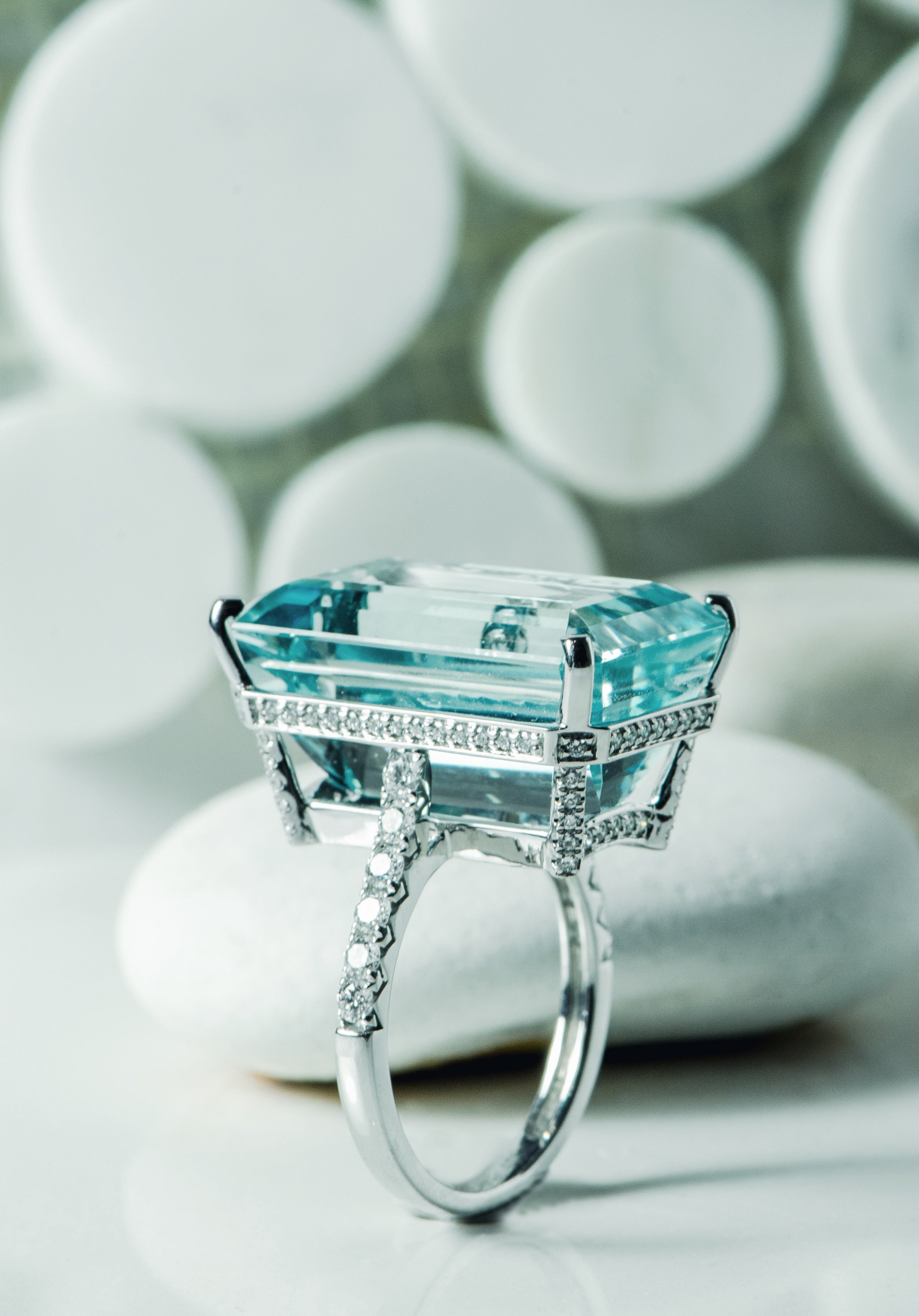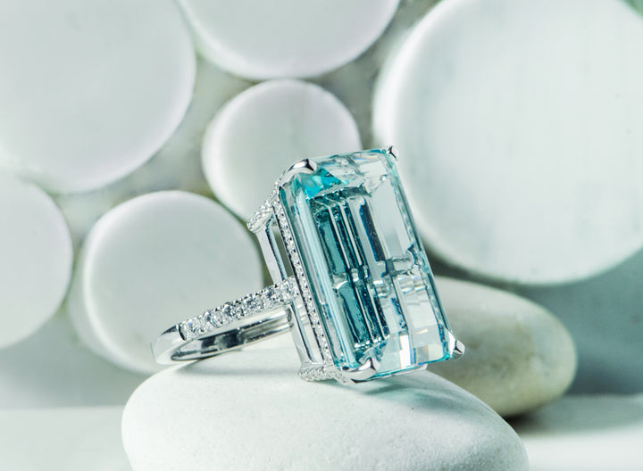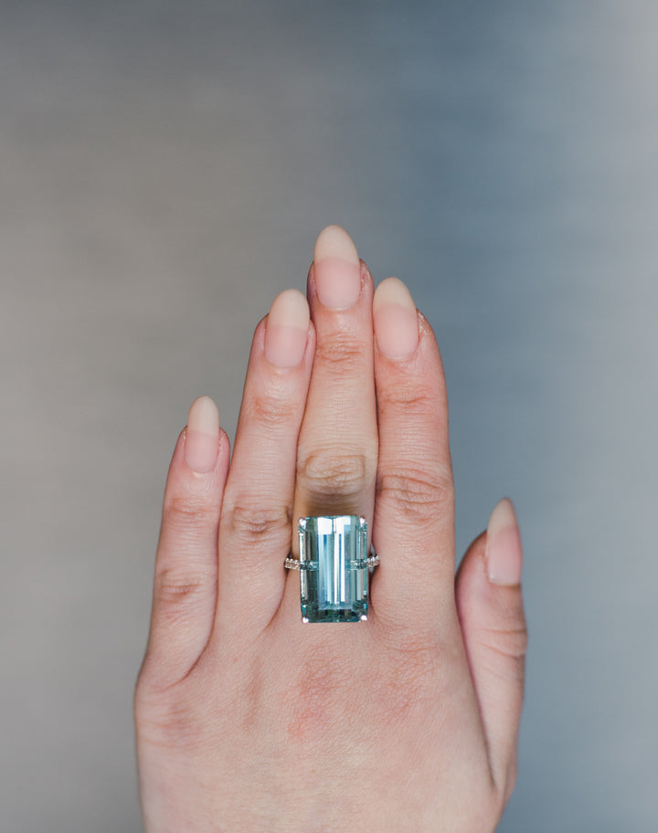 Elevate your style with the "Thalassa" Ring. This true statement piece boasts over 24 carats of crystal-clear aquamarine, showcasing its exquisite step-cut design. A generous gift for a loved one with a birthday or anniversary in March, as aquamarine is the birthstone. Sparkle and shine with every gesture. Diamonds are pave-set in the band and basket, accentuating the gleaming aquamarine.