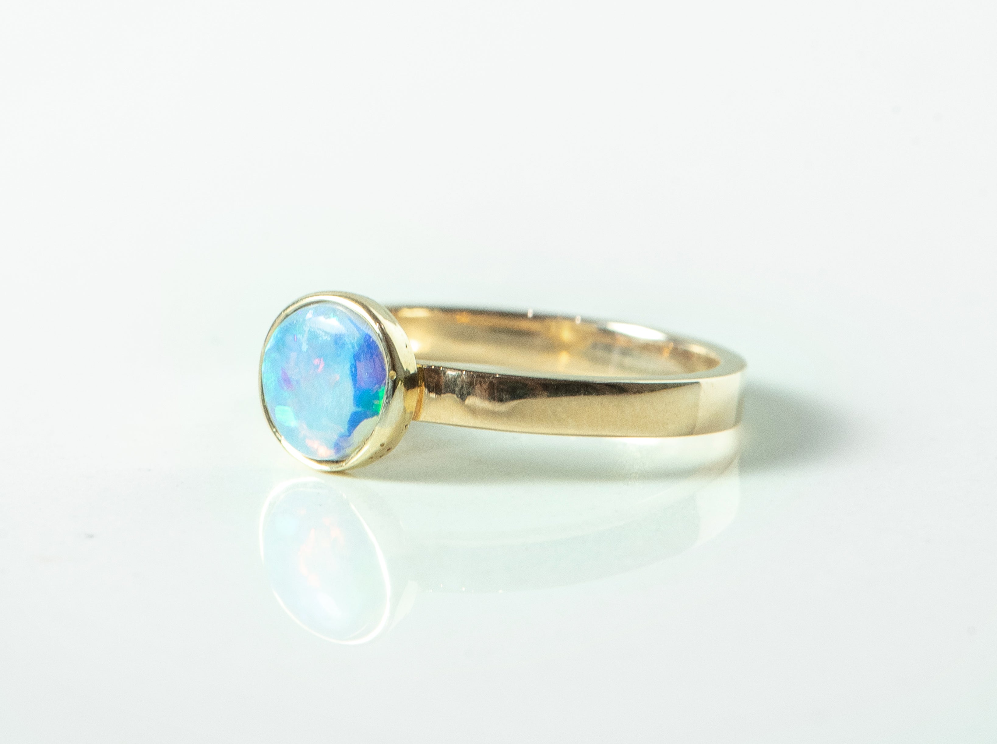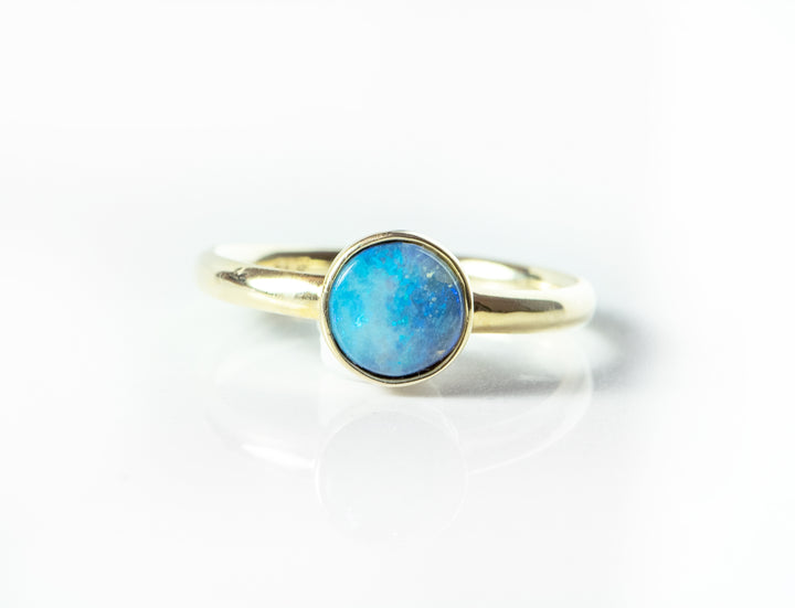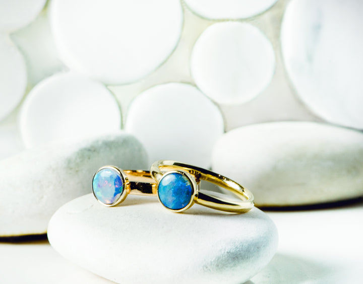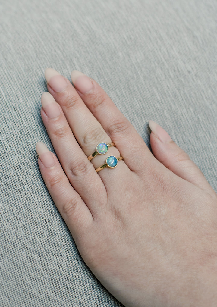 Our Oceanic Opal rings are simple, delicate, and unique. Each ring is slightly different, as no two opals are the same. They shimmer and shift colors in the light, creating an ethereal look. The opals are bezel set in 14k yellow gold, which contrasts nicely with the blue.