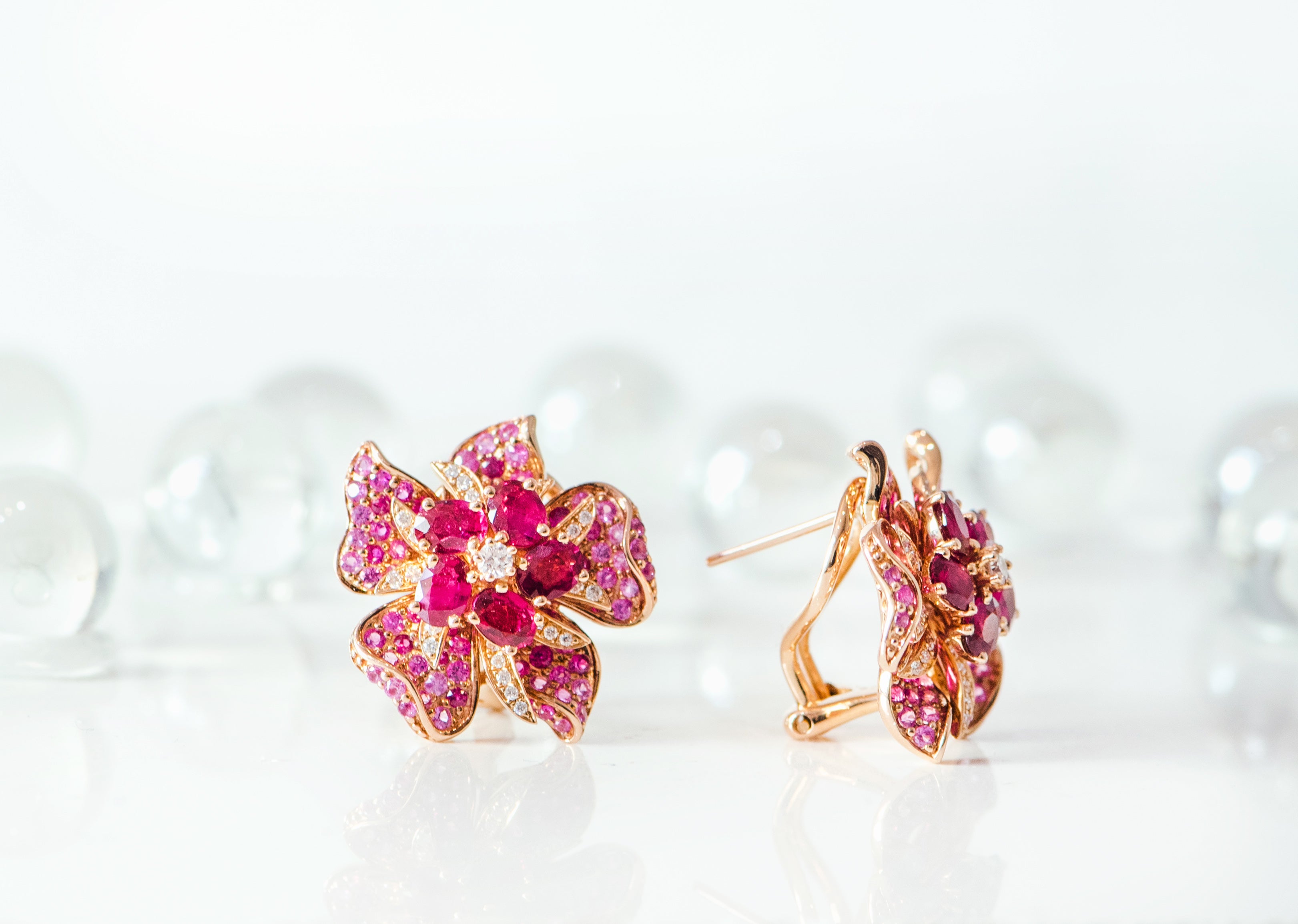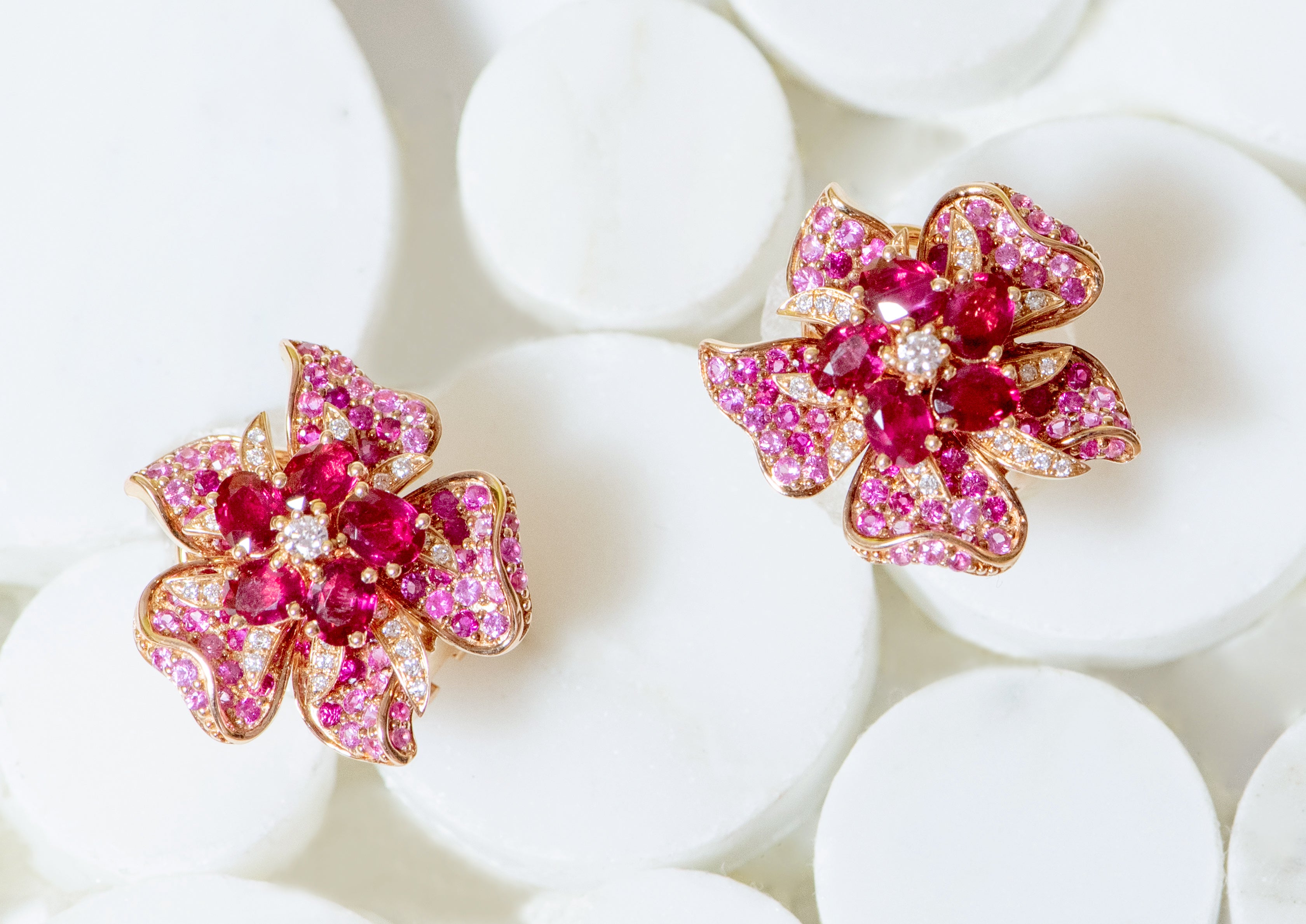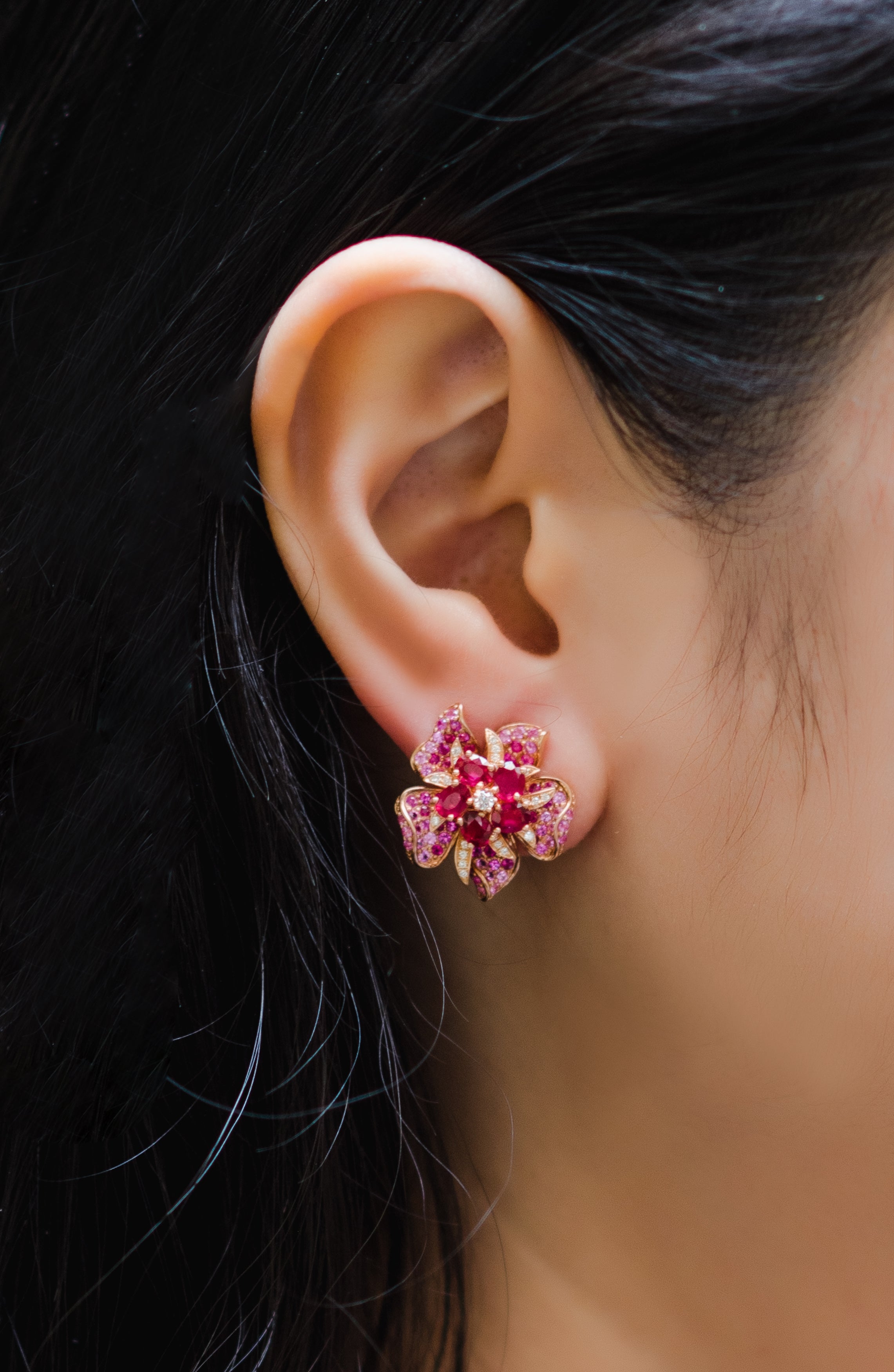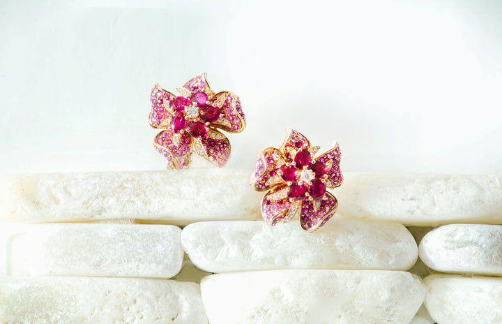 Indulge in luxury with our "Rose Enchantment" Earrings. The multi-layered floral design, crafted with exquisite ruby, pink sapphire and diamond accents, is a stunning embodiment of elegance. With a push back and omega clip, these 18k rose gold earrings are both beautiful and secure.