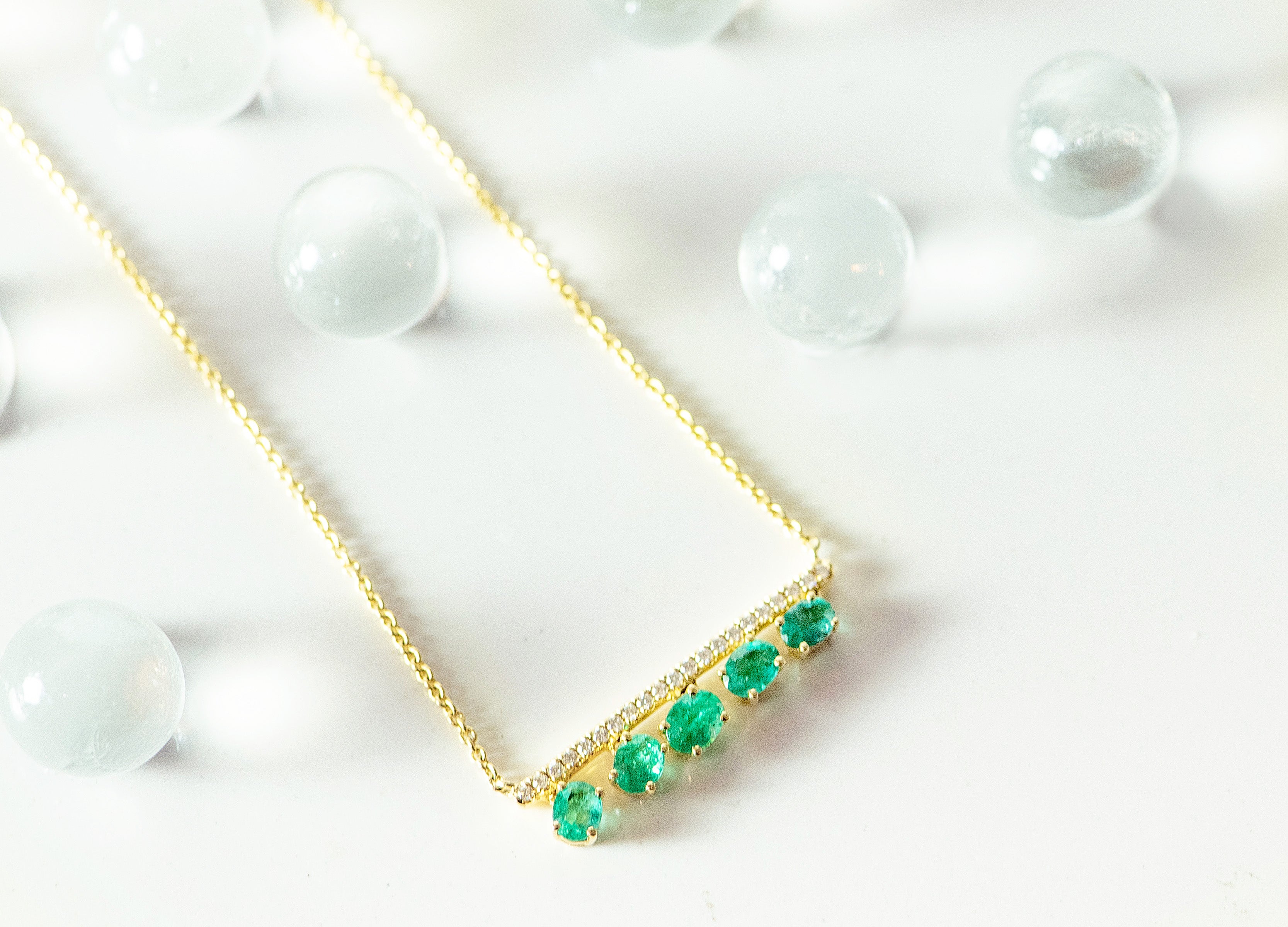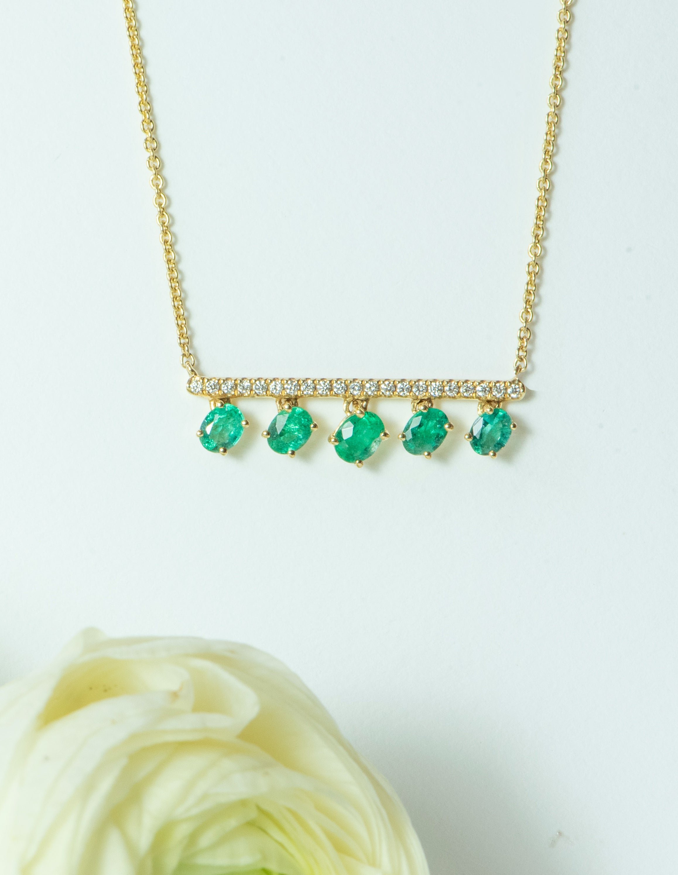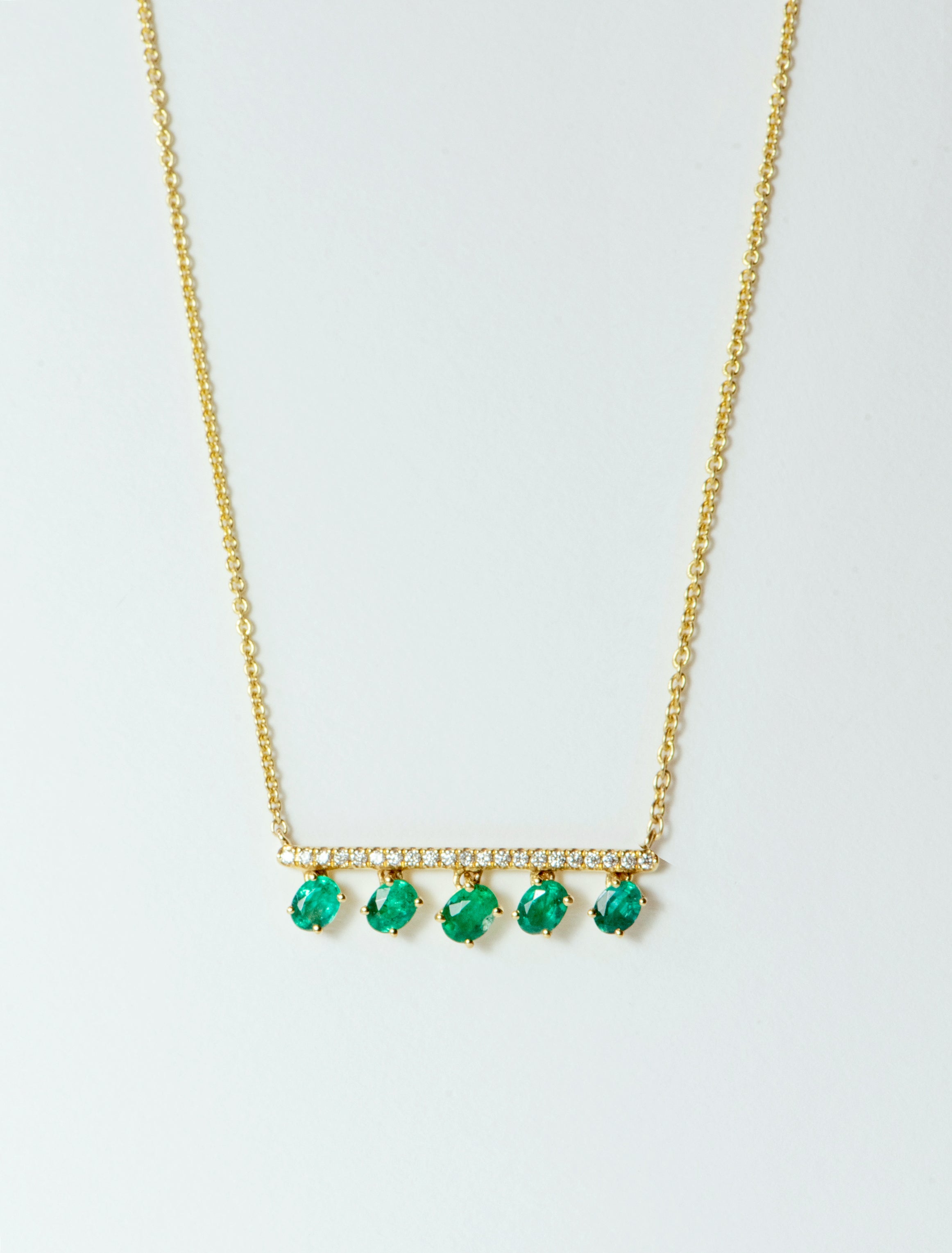 Introducing the exquisite Sabaa Necklace, a stunning piece of fine jewelry that is sure to captivate and mesmerize. Five shimmering emeralds elegantly hang from a bar that is pave set with 21 round diamonds, creating a breathtaking and luxurious look. Crafted with exceptional attention to detail, this necklace is made with 18k yellow gold and boasts a cable link chain for a timeless and sophisticated finish. The emeralds delicately move and catch the light, adding an enchanting touch to this already mesmerizing piece. Elevate any ensemble and make a statement with the Sabaa Necklace, a truly remarkable and opulent addition to any jewelry collection.