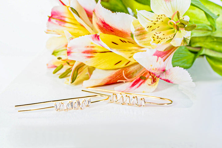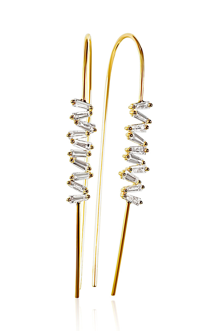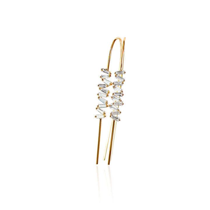 The "Bayla" Earrings are a refined and modern choice, crafted in rose gold and designed as threader earrings. Featuring 20 baguette diamonds arranged in a zigzag pattern, these earrings offer a dainty and delicate look that is light and comfortable on the ear. Their unique design and sparkling diamonds make them an ideal choice for bridal wear, adding a touch of contemporary elegance to any special occasion. The "Bayla" Earrings blend sophistication with a distinctive style, perfect for those seeking a modern, standout piece.