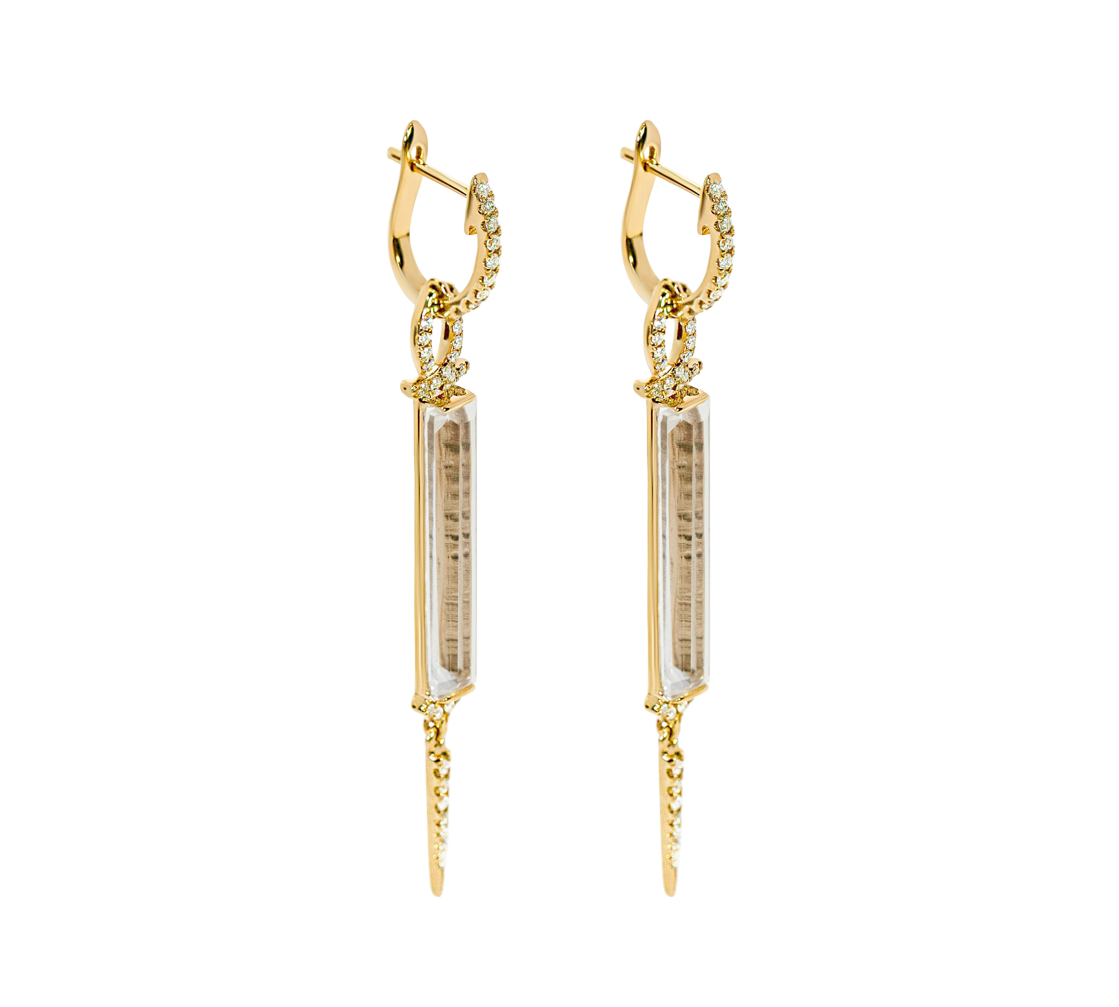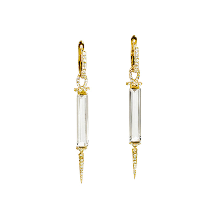 The "Brinley" Earrings feature a stunning dangle design, crafted in 14k yellow gold. At the heart of each earring are nearly 5.5 carats of step-cut white topaz, bordered at the top and bottom by sparkling diamonds that enhance the natural brilliance of the stone. A delicate diamond point swings gracefully from the bottom of the topaz, adding an elegant touch of movement and sparkle. These earrings are a true statement of sophistication, offering a special, timeless design that shines with every turn.