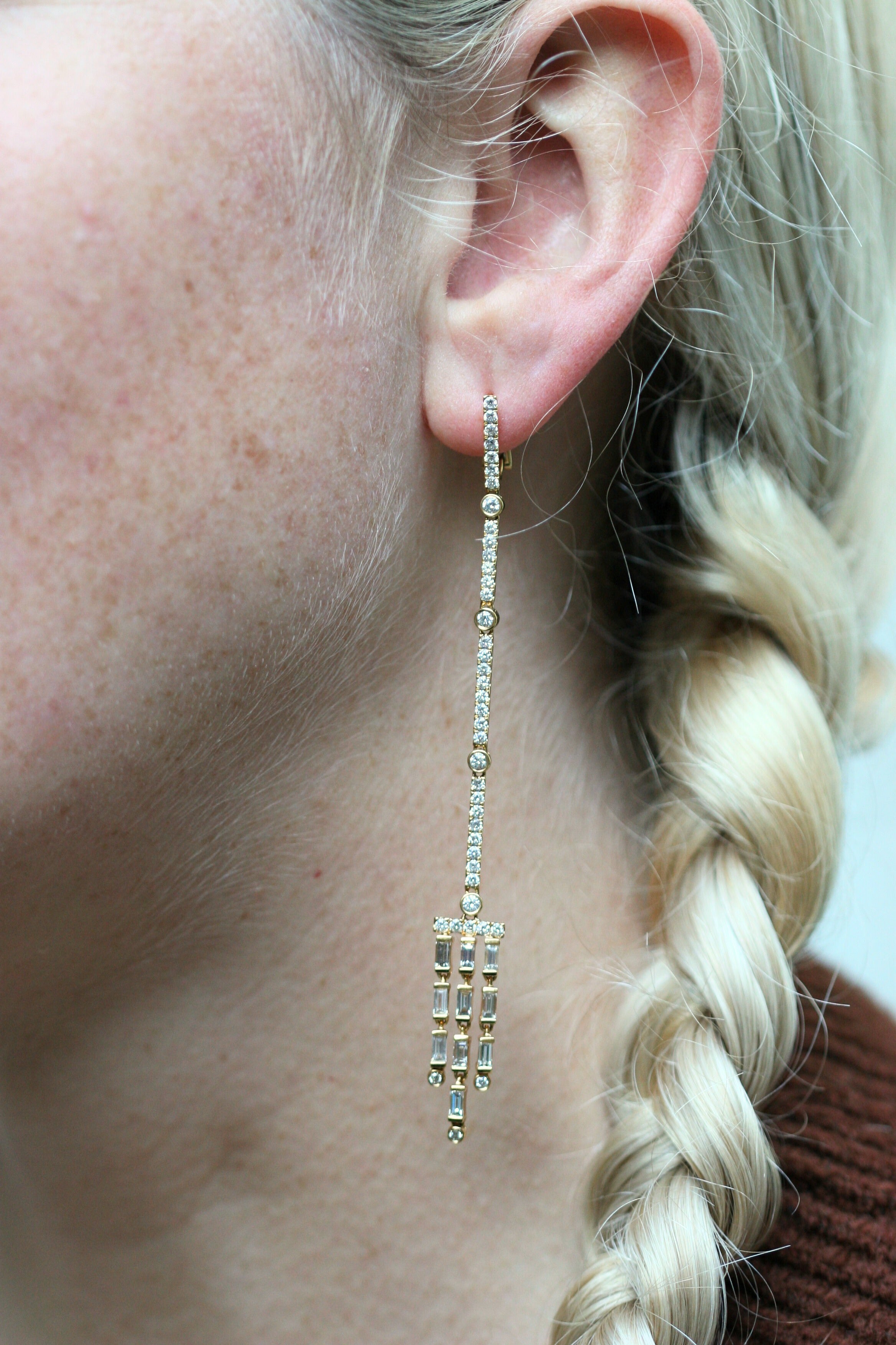 yellow gold and diamond dangle earrings. chandelier earrings. baguette diamonds. round diamonds. fine jewelry luxury. Local SF jewelry, San francisco, Luxury, hand made, Bay area, gift for her.