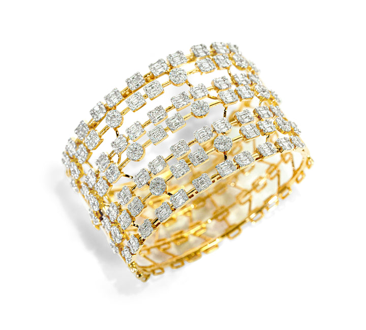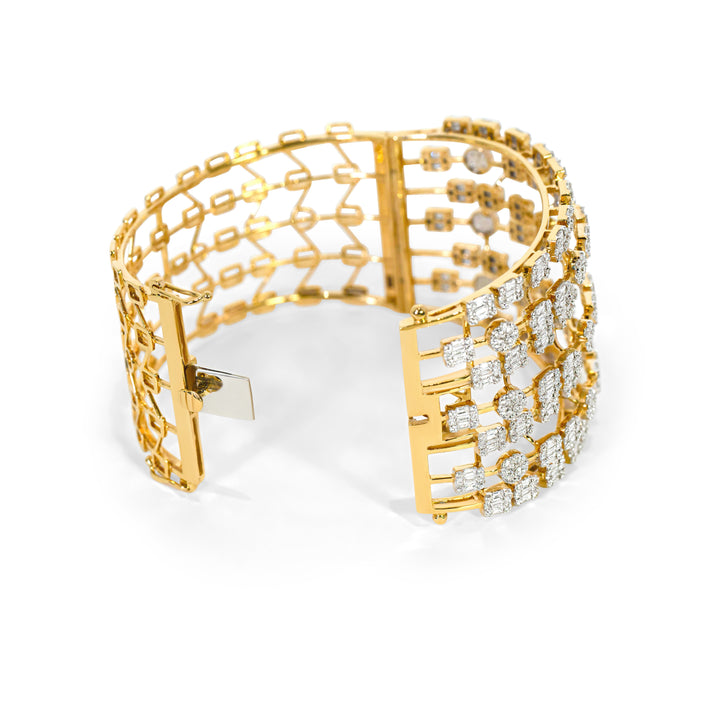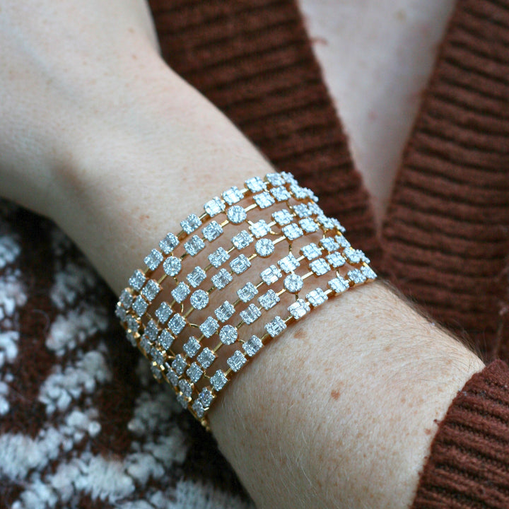 The "Delphine" Bracelet is a breathtaking statement piece, featuring seven rows of 720 meticulously arranged diamonds in round, princess cut, and baguette shapes. With a total carat weight of 10.37, the intricate patterns created by the varying diamond cuts are beautifully illuminated by the masterfully crafted gold design, which allows light to enhance their brilliance. Perfect for the woman who has everything, this bracelet is as secure as it is stunning, with two safety clasps atop a handmade open box clasp and a hinged design for effortless wear. Its unparalleled sparkle and exquisite detail make it a true masterpiece of luxury and elegance.