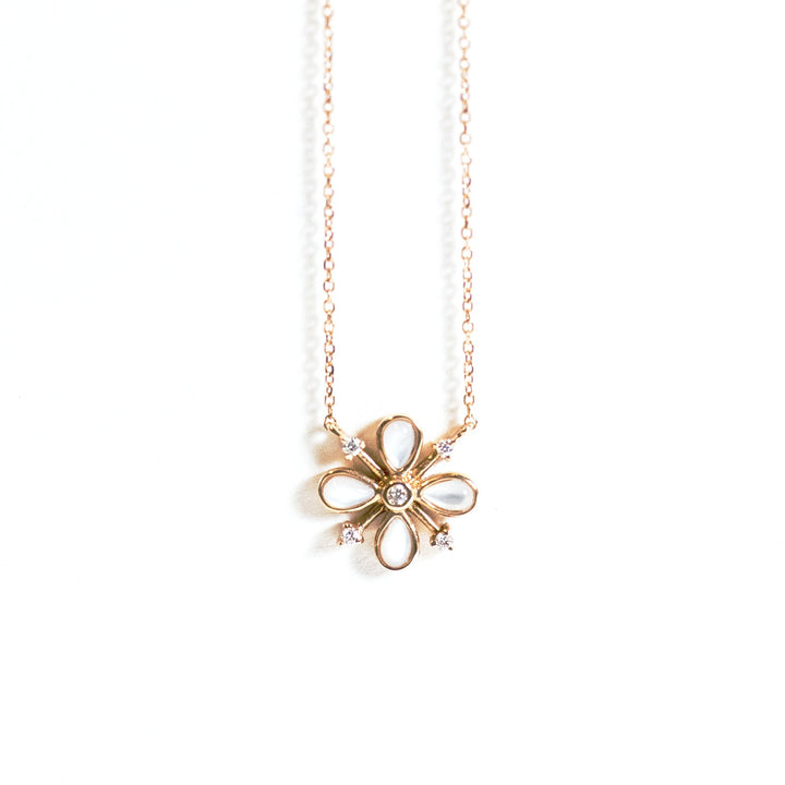 This Mother of Pearl necklace creates the perfect feminine-flirty appeal of our signature Carats & Stones collection. The soft iridescence from the Mother of Pearl complements the blush pink gold. This necklace adds a sweet touch to an understated look.
