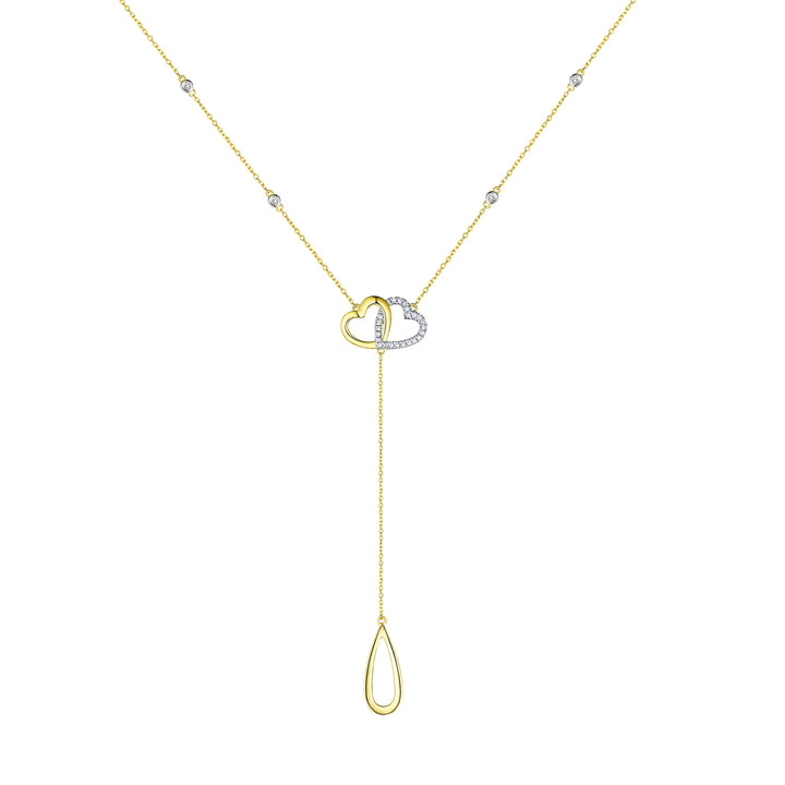 Celebrate love with the romantic "Hearts Collide" Necklace! This necklace features a yellow gold finish, a double heart-shaped charm with one heart covered with diamonds, and a cable link chain. The perfect gift for Valentine's day!