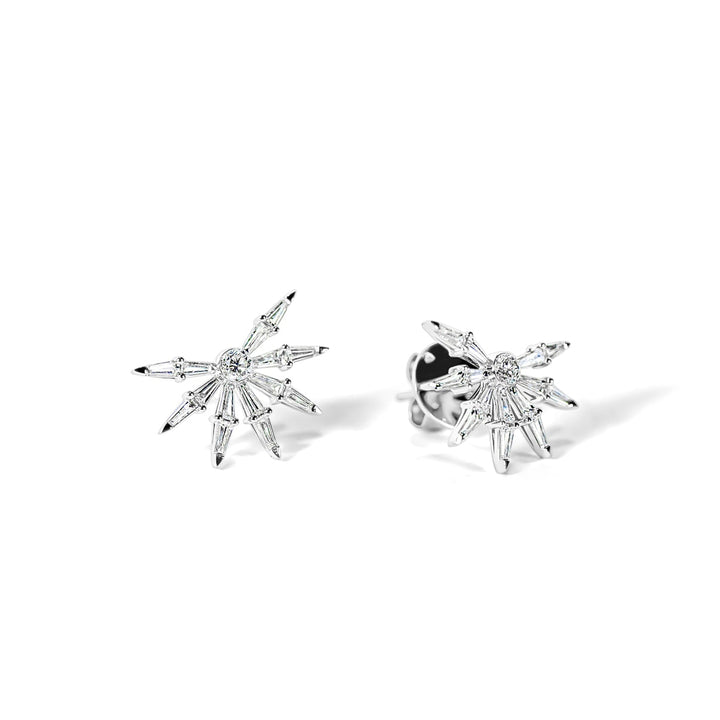 The "Jorja" Earrings showcase a stunning design, with 28 baguette diamonds fanning out from a central round diamond, resembling the elegance of a leaf. Crafted in 18k white gold, these earrings offer a unique and modern take on natural beauty. Their delicate yet striking shape ensures they are comfortable on the ear while making a bold statement. Perfect for those seeking a refined and distinctive look, the "Jorja" Earrings bring effortless sophistication to any occasion.
