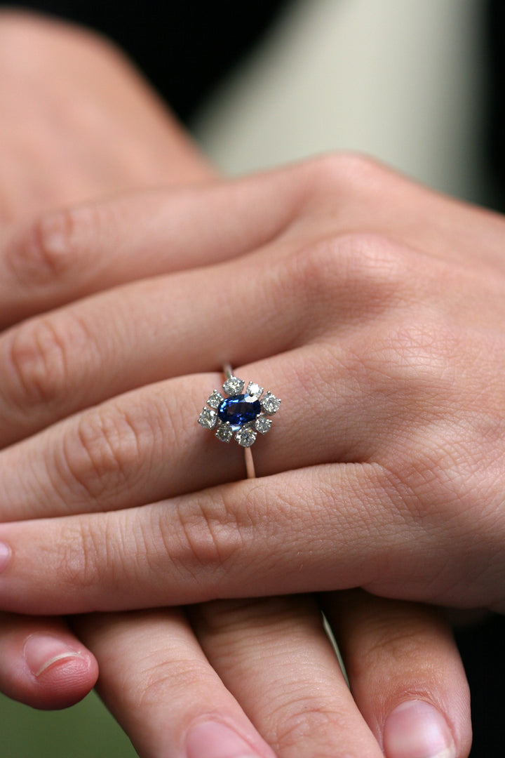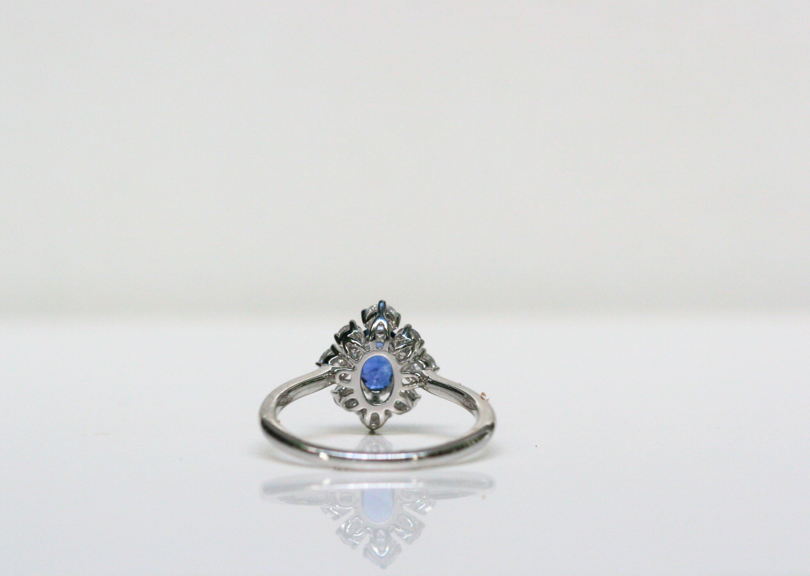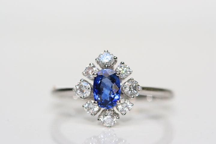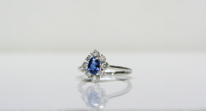 Indulge in the exquisite elegance of the "Lacey" Ring. This stunning piece features an oval sapphire encircled by a delicate halo of diamonds. Its vintage-inspired design is enhanced with modern elements, creating a captivating contrast between the vibrant blue and shimmering white. Let its sparkly brilliance adorn your finger with sophistication and style. Our "Lacey" ring would be a beautiful, unique engagement ring for one that loves sapphires.