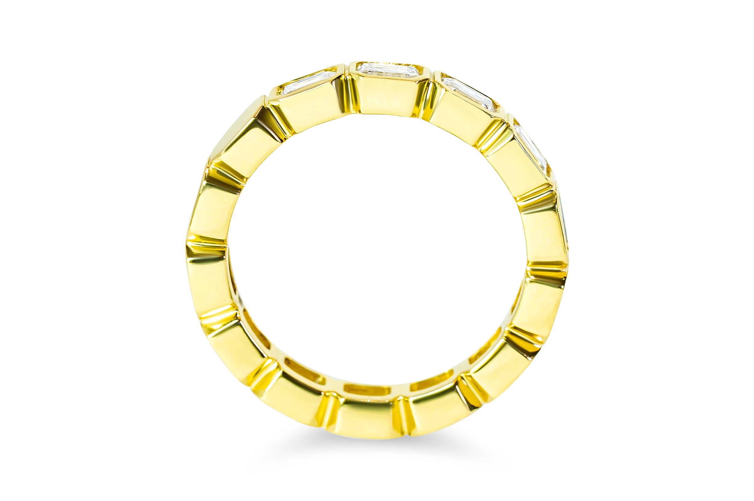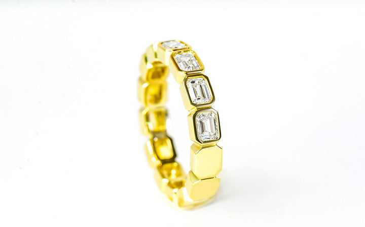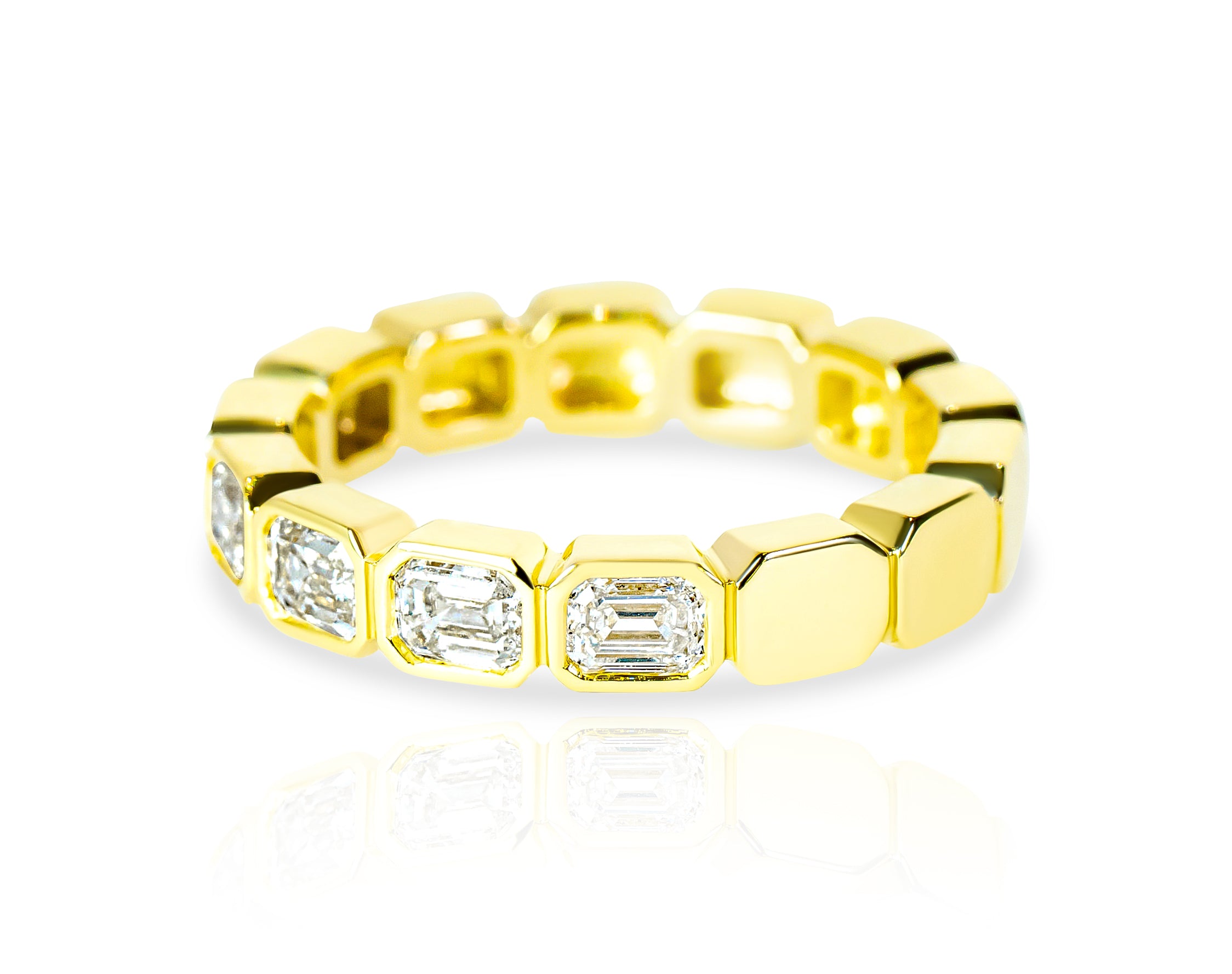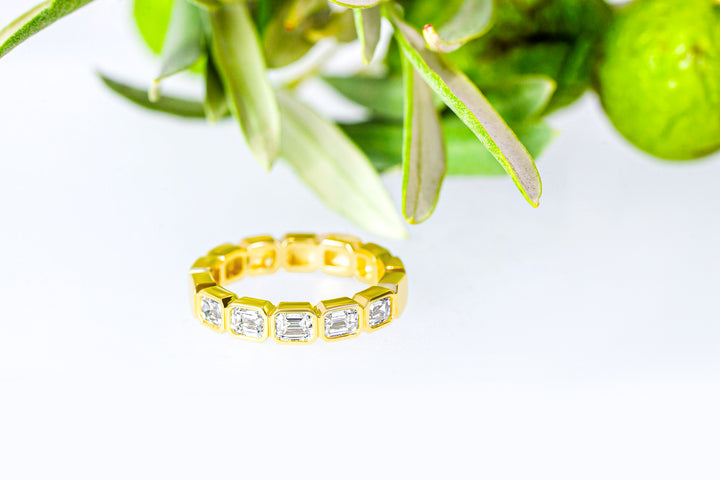 The "Lennox" Ring is a stunning showcase of luxury and modern design, featuring five emerald-cut diamonds bezel set in 18k yellow gold. Each stone is meticulously set to enhance its brilliance, while the ring's unique design extends the shape of the stones throughout, allowing it to be worn in either direction. With its heavy, opulent feel, the "Lennox" Ring makes a memorable statement as a 5th anniversary gift or a striking stacking piece. Its bold yet sophisticated design ensures it stands out as a timeless addition to any jewelry collection.