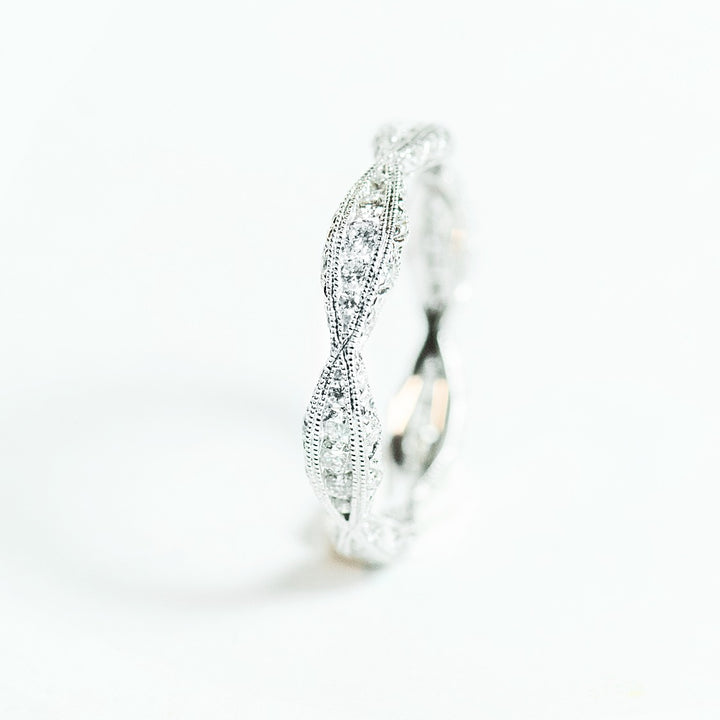 This hand-engraved filigree diamond eternity band is for those who appreciate the timeless vintage look. The intricate band is crafted with a beaded frame to showcase the brillant diamonds that wrap around the finger. Due to the three-dimensional design, diamonds are visible at every angle.