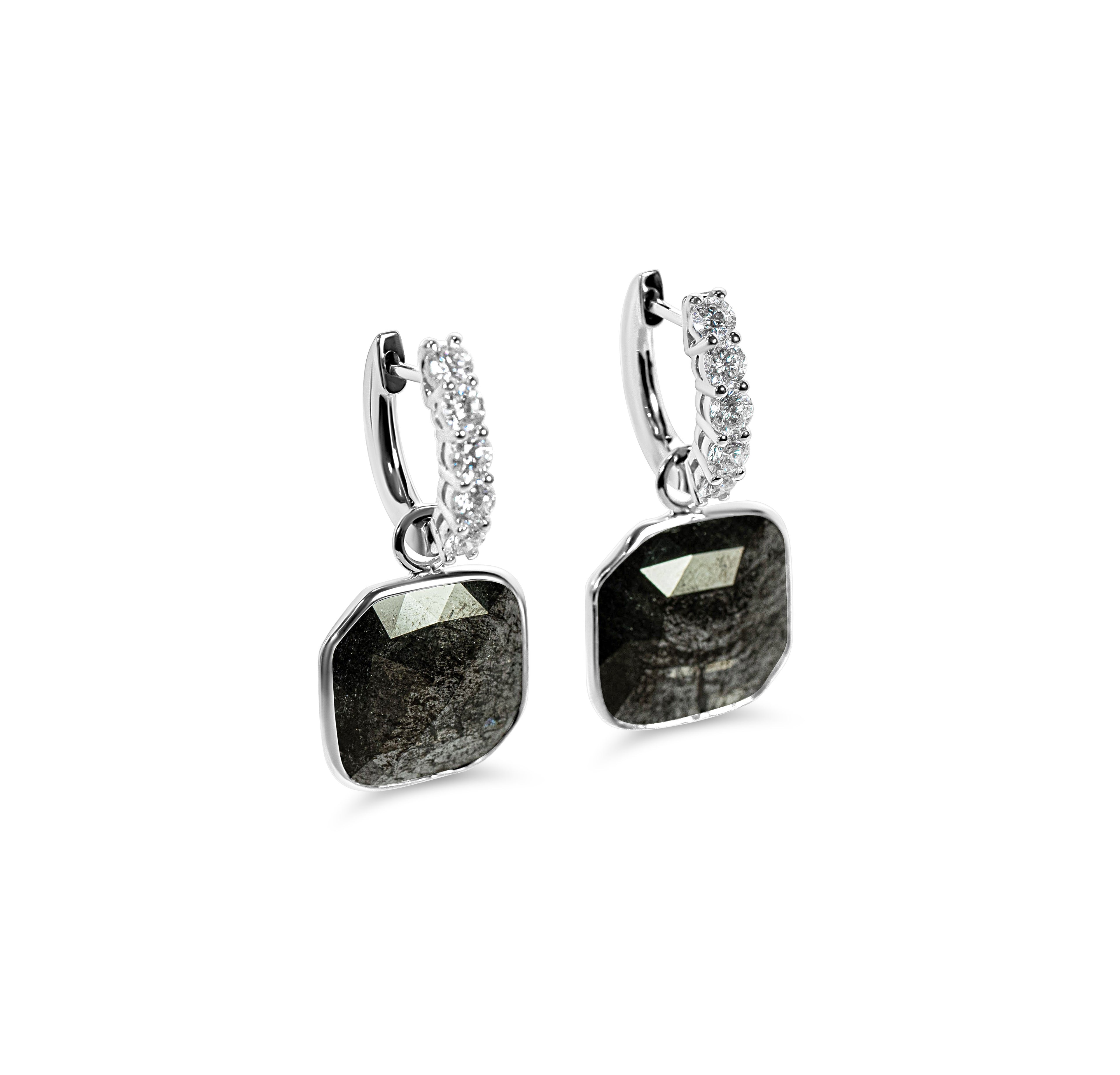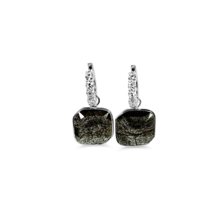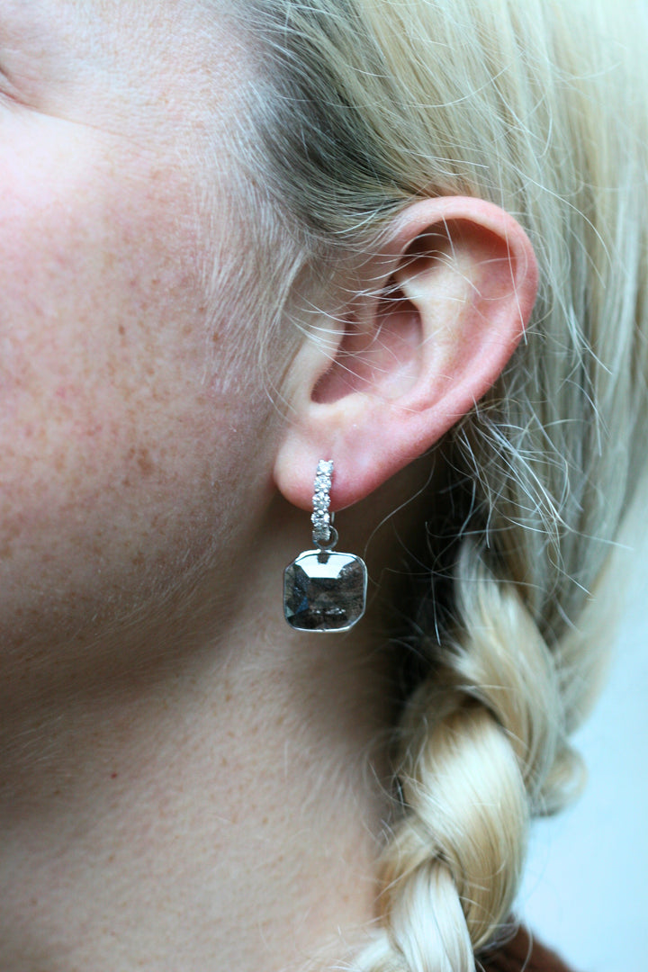 Our striking "Mercury" earrings feature rose cut salt and pepper diamonds, totaling over 12 carats. Set in 18k white gold, each stone is bezel set by hand to perfectly accommodate its unique shape, ensuring a flawless fit. The raw beauty of these diamonds is showcased as the light reveals the fascinating inclusions within each stone. A true one-of-a-kind design, these earrings are versatile, designed to be worn as dangles on diamond huggie hoops (sold separately), or removed and used as charms on a chain for an entirely different look.