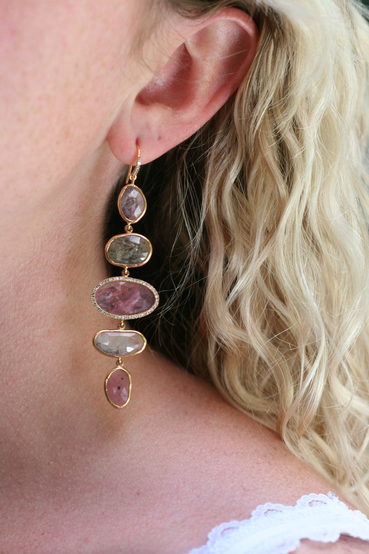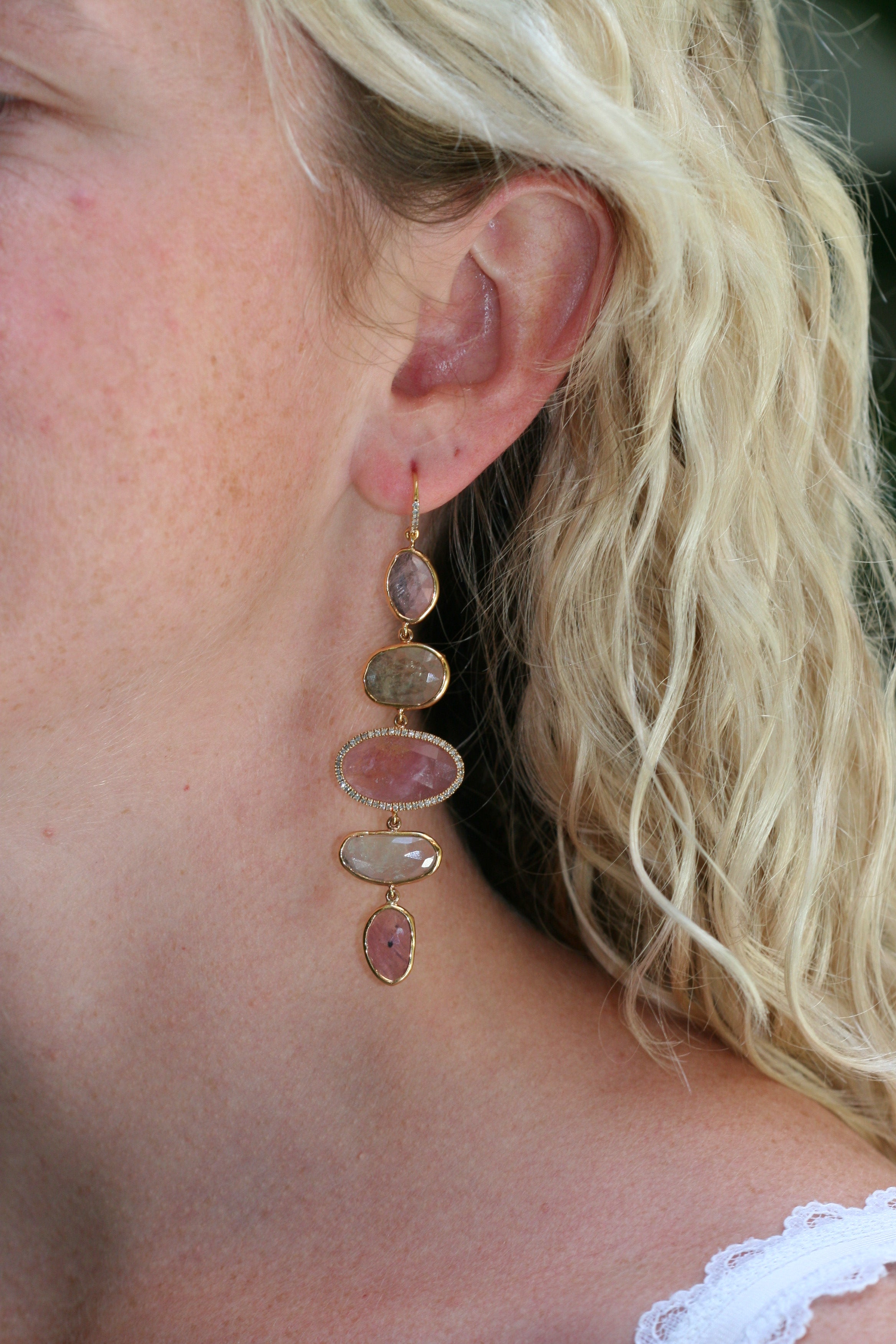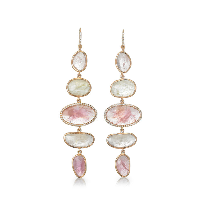 Unrivaled in sophisticated merriment, these elegant yet playful 18-karat rose gold earrings feature the sleek beauty of multicolored, sliced sapphires. More than 100 brilliant diamonds, nearly half a carat in all, complete this confection. Wear it with a white blouse during the day, or your favorite evening dress- these earrings are as versatile as they are beautiful.