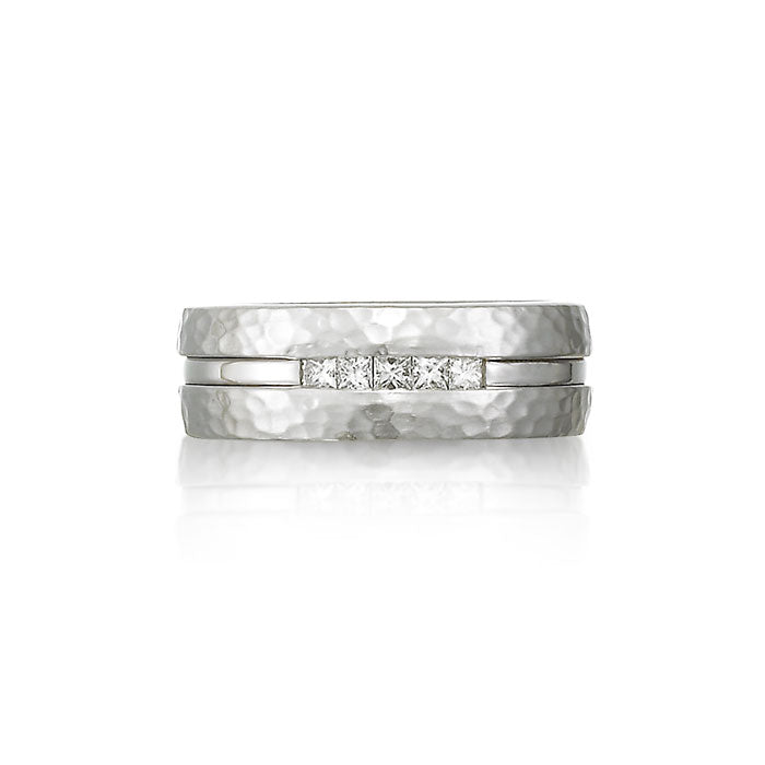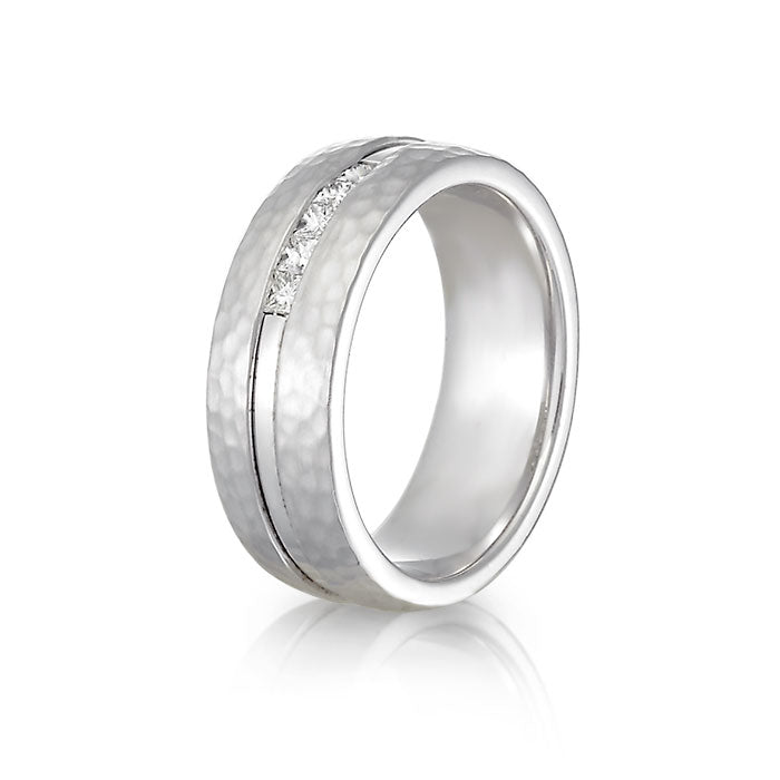 Odin features 14-karat white gold with a hammer finish and accented with 5 brilliant square diamonds, more than a quarter-carat in total weight.