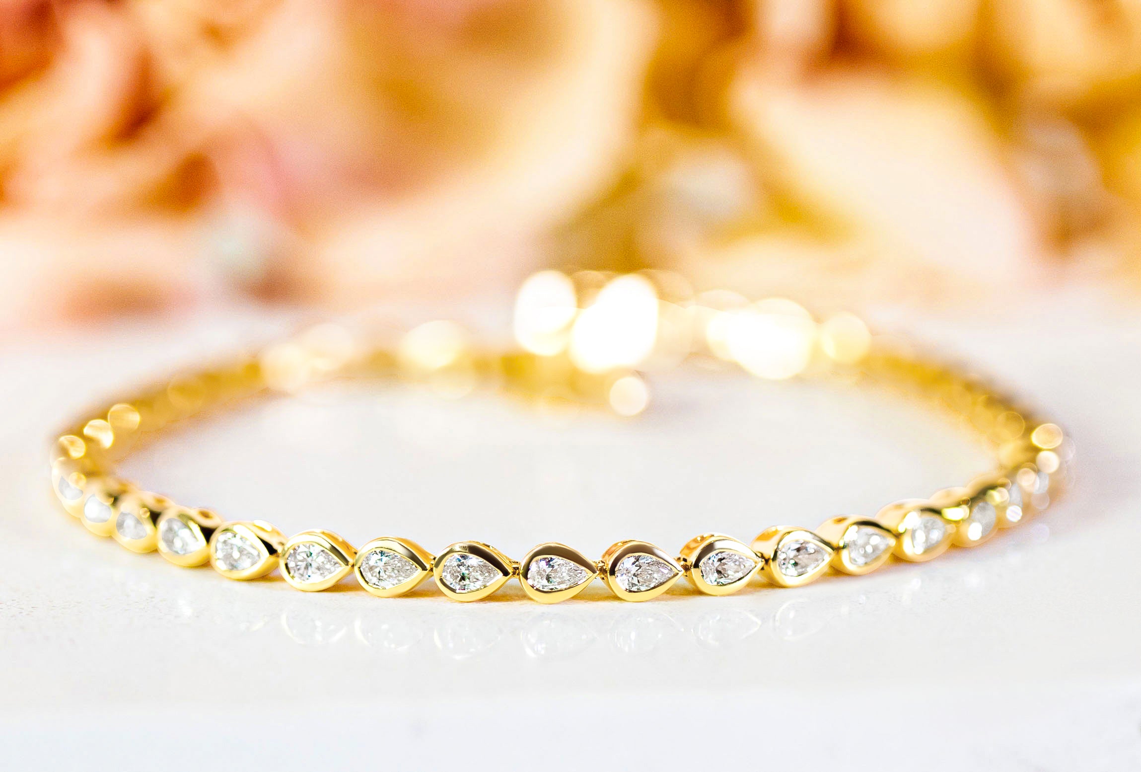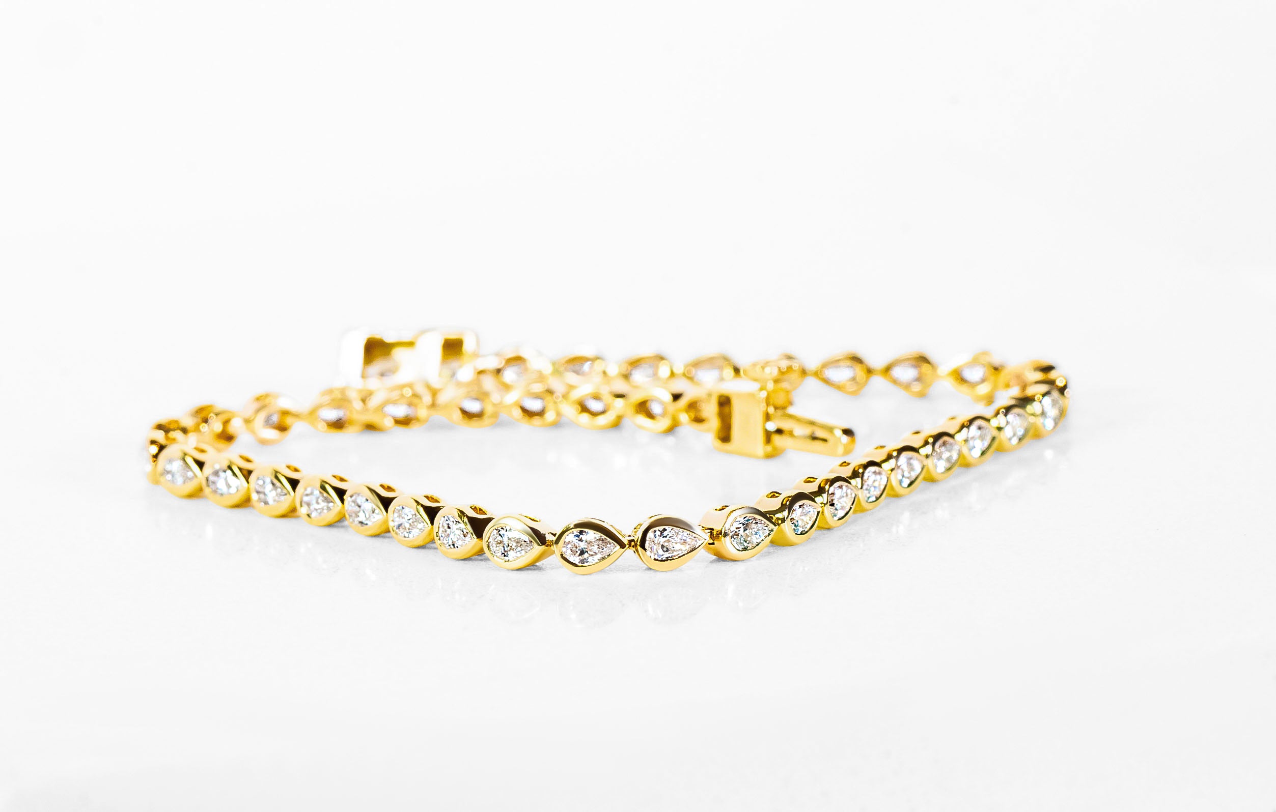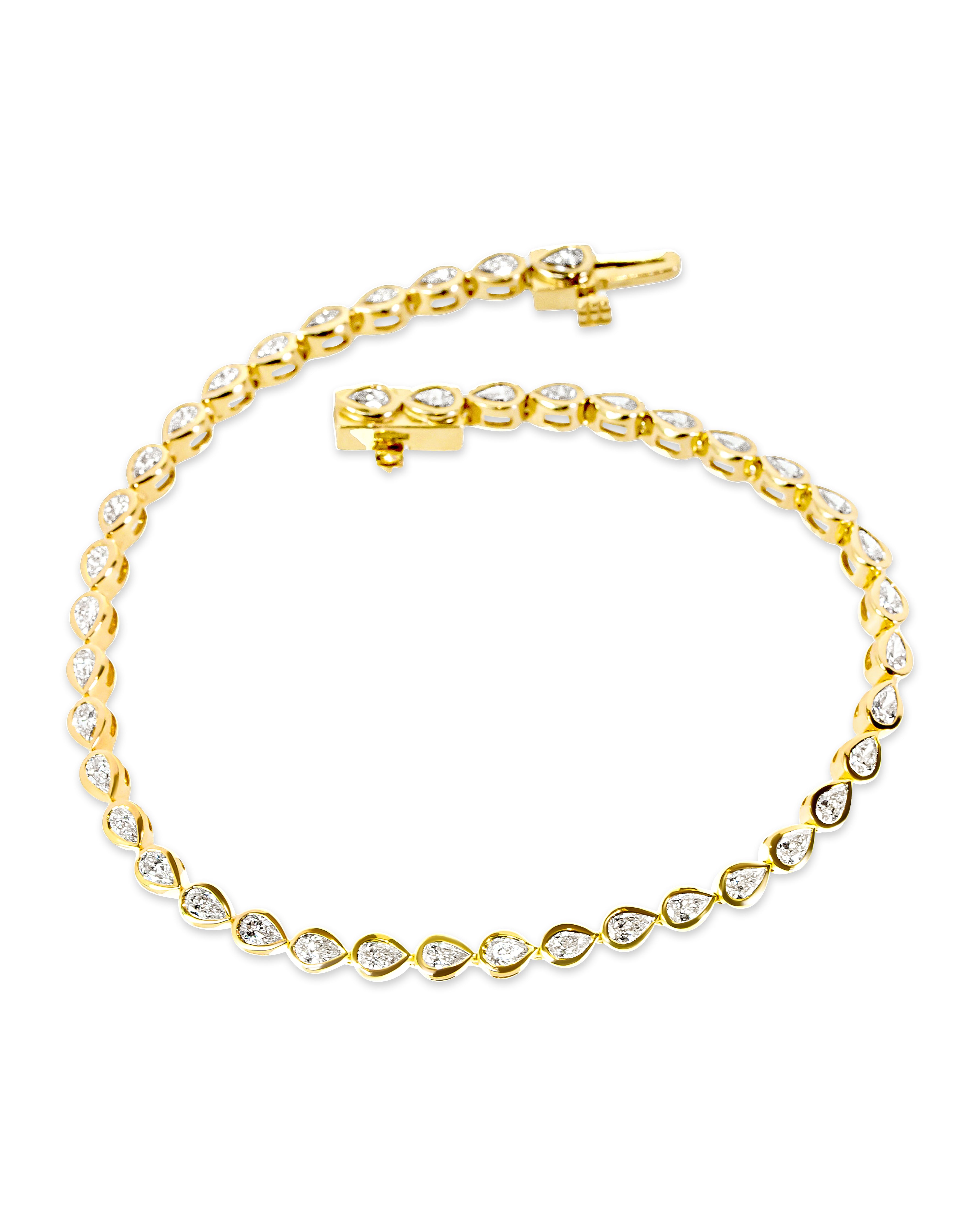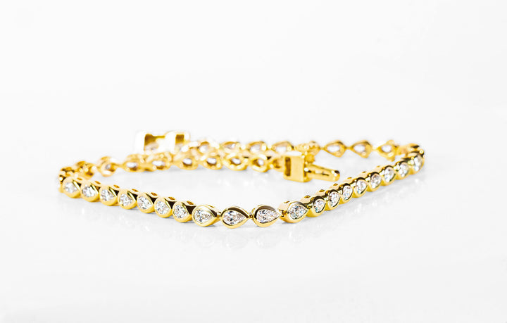 The "Paloma" Tennis Bracelet features a striking array of pear-shaped diamonds set east-west along the wrist, creating a captivating asymmetrical design. Each diamond is bezel set in 18k yellow gold, offering a bold yet elegant statement. The weight of the bracelet exudes luxury, while its unique form makes it stand out from traditional tennis bracelets. Secured with a sturdy box clasp and safety closure, the "Paloma" is a truly one-of-a-kind piece that combines timeless beauty with modern sophistication.