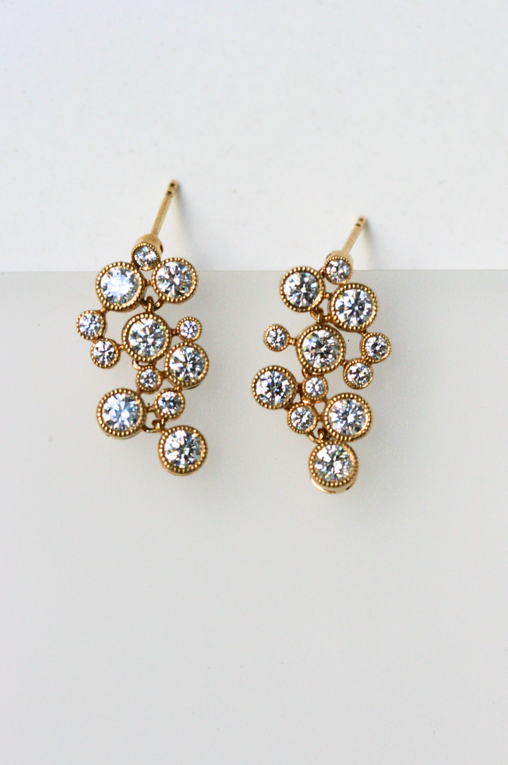 Nearly 2 carats of diamonds sparkle in our "Prosecco Dangle" Earrings. Bezel set in buttery 18k yellow gold; these earrings hang off the ear - catching the light with every movement. Comfortably secured with friction backs, you can wear these without fear of them falling out. As the April birthstone, the diamond earrings are a beautiful gift for a loved one with a birthday or anniversary in April!