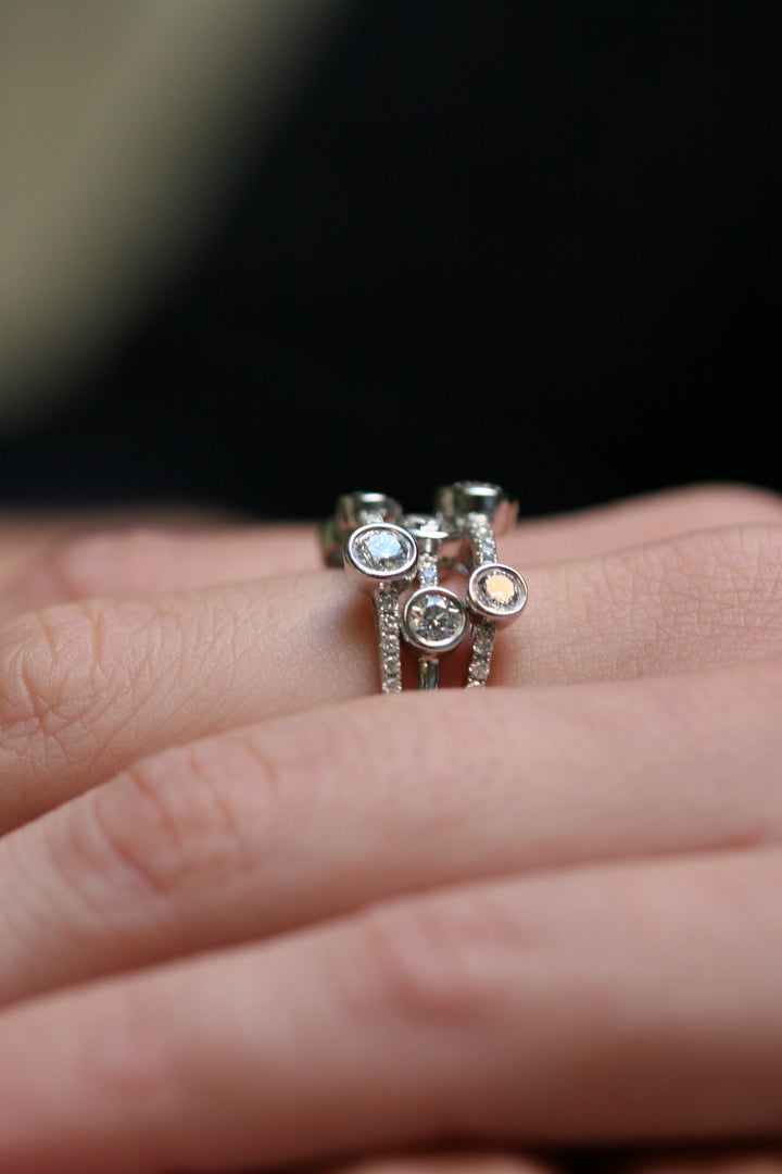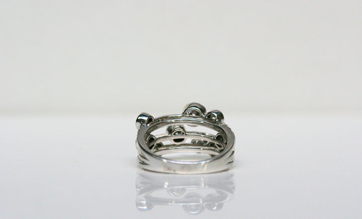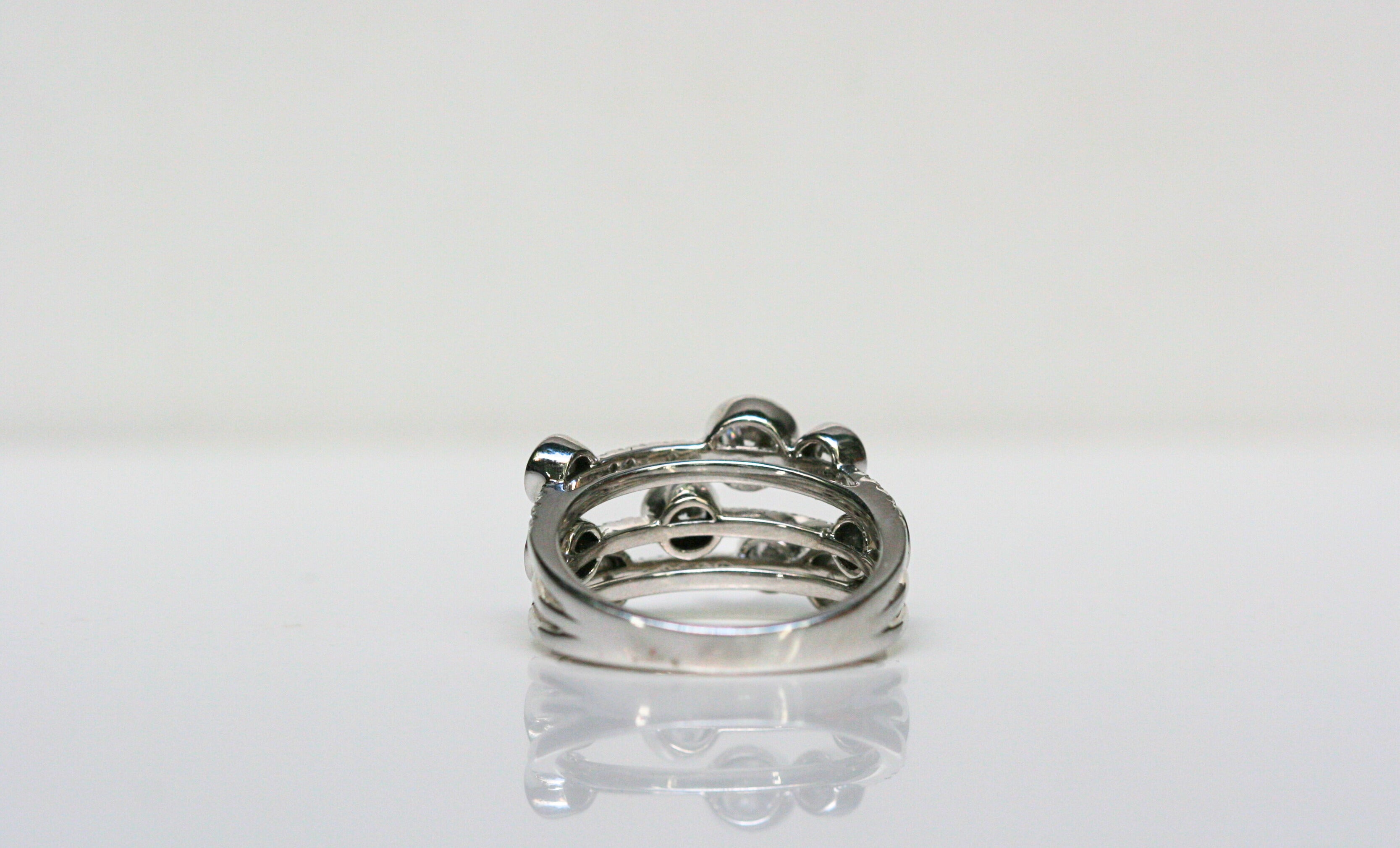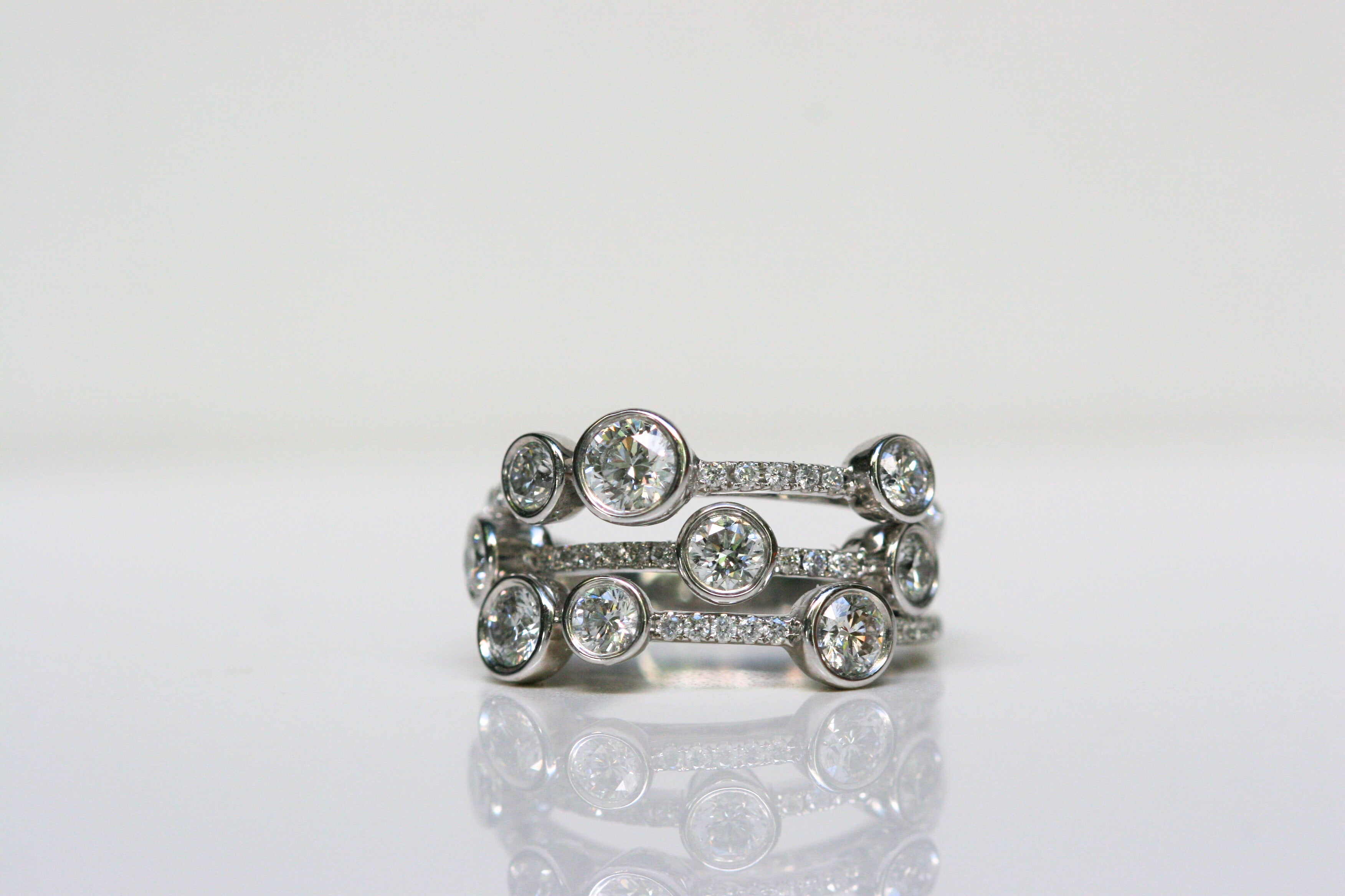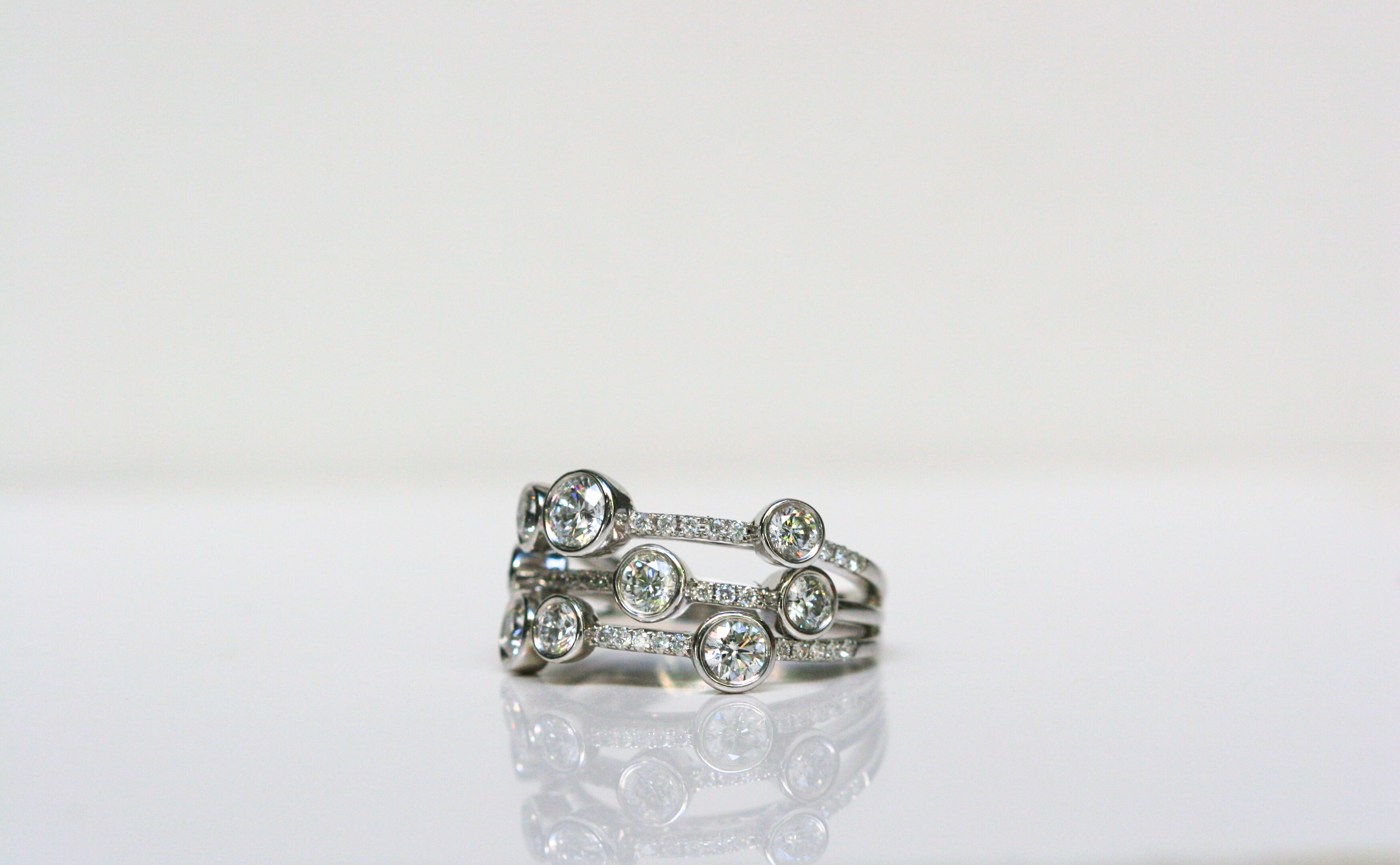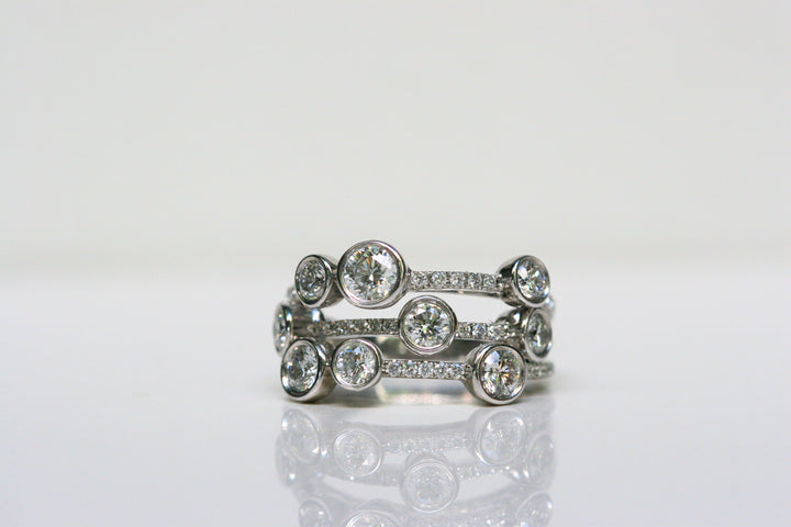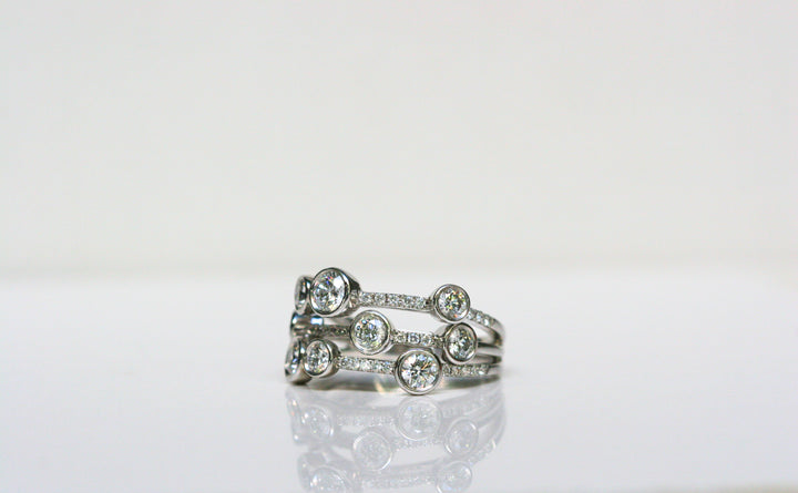 Indulge in luxury with our "Prosecco Deluxe" ring. Over 3 carats of sparkling diamonds adorn this stunning piece, set in silky 18k white gold. A true statement ring, perfect for those who appreciate unique and elegant jewelry. This ring makes a gorgeous alternative engagement ring for someone that loves one-of-a-kind pieces. Our "Prosecco Deluxe" ring would be a special April anniversary or birthday gift, as diamonds are the April birthstone.