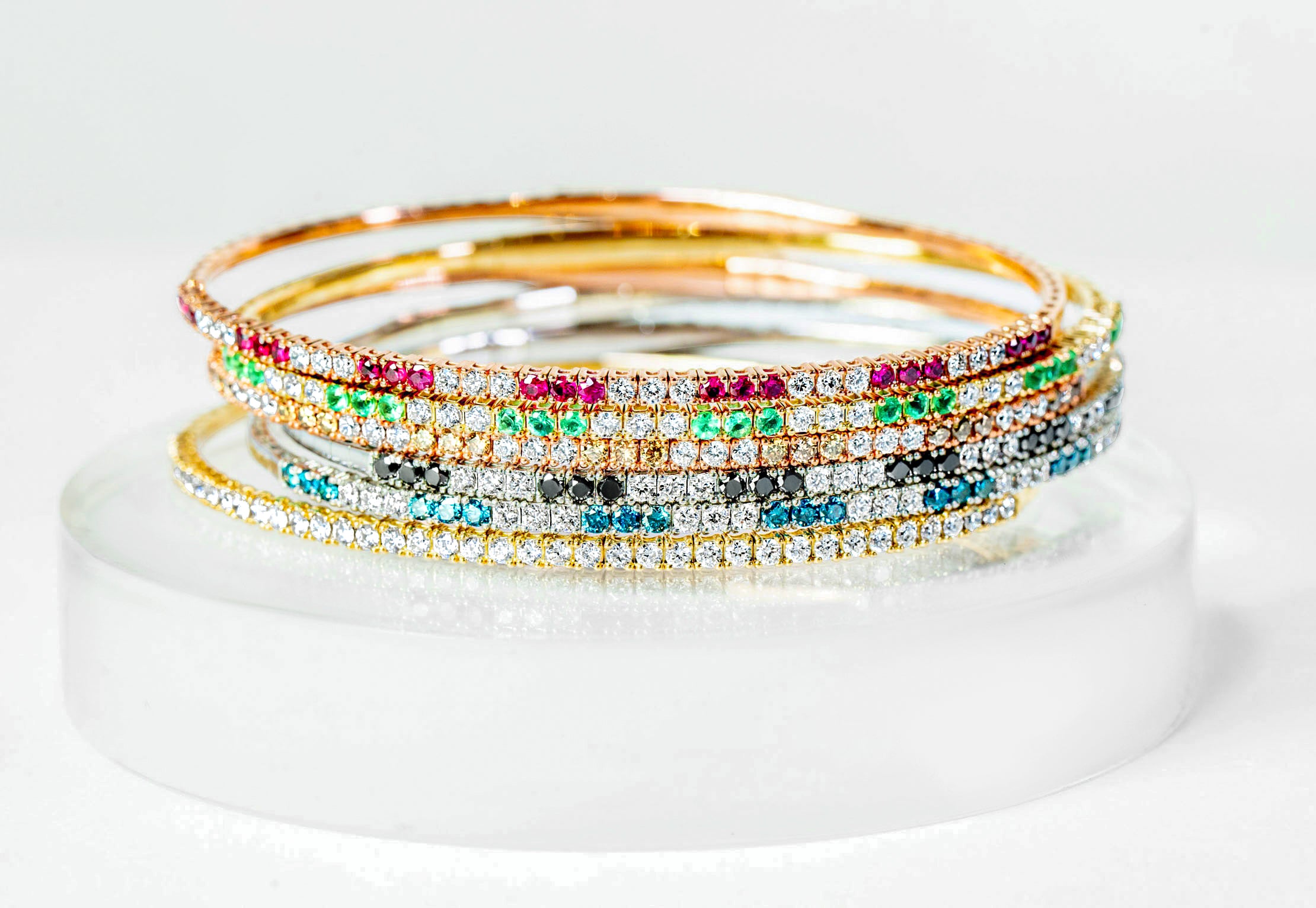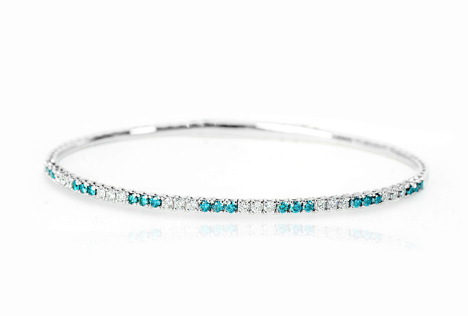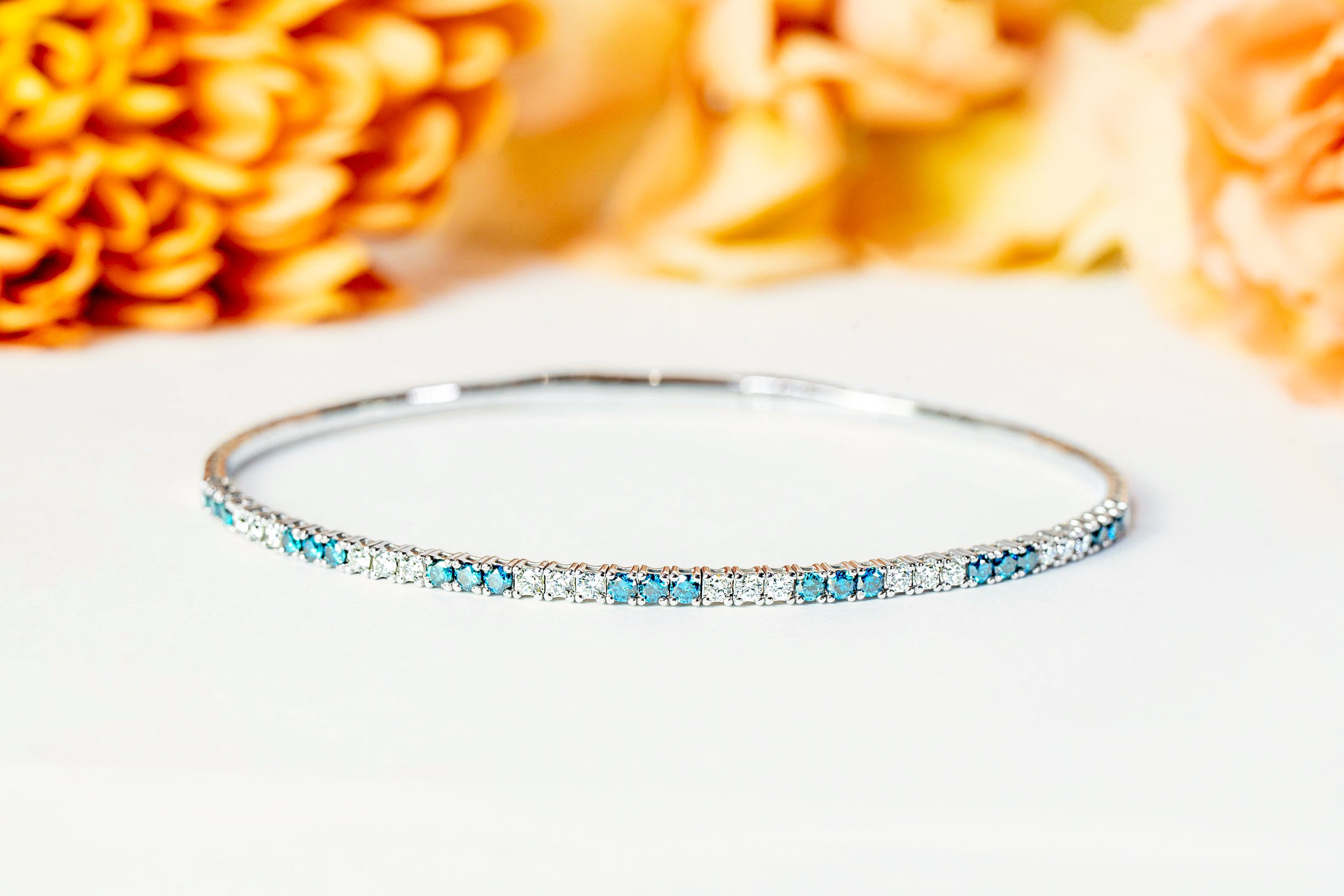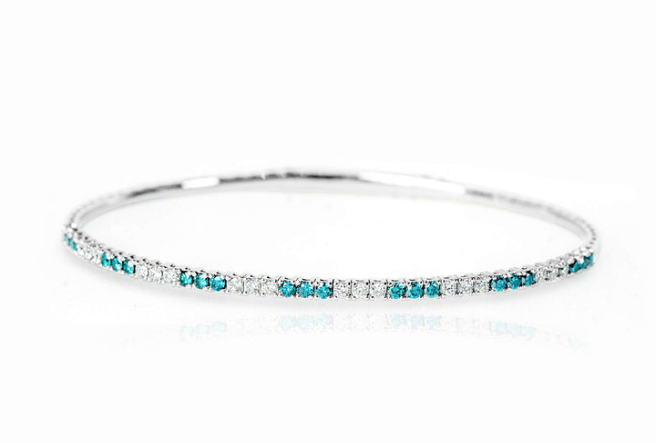 The "Ranya" Bangle is a sophisticated blend of elegance and practicality, featuring 21 dazzling white & stunning blue diamonds set in a sleek white gold design. Its titanium wire core provides flexibility, making it easy to slip on and off. The oval shape ensures the diamonds stay perfectly aligned on your wrist, offering both comfort and style. Ideal for everyday wear, this bangle can also be stacked with other "Ranya" bangles for a bold, statement look.