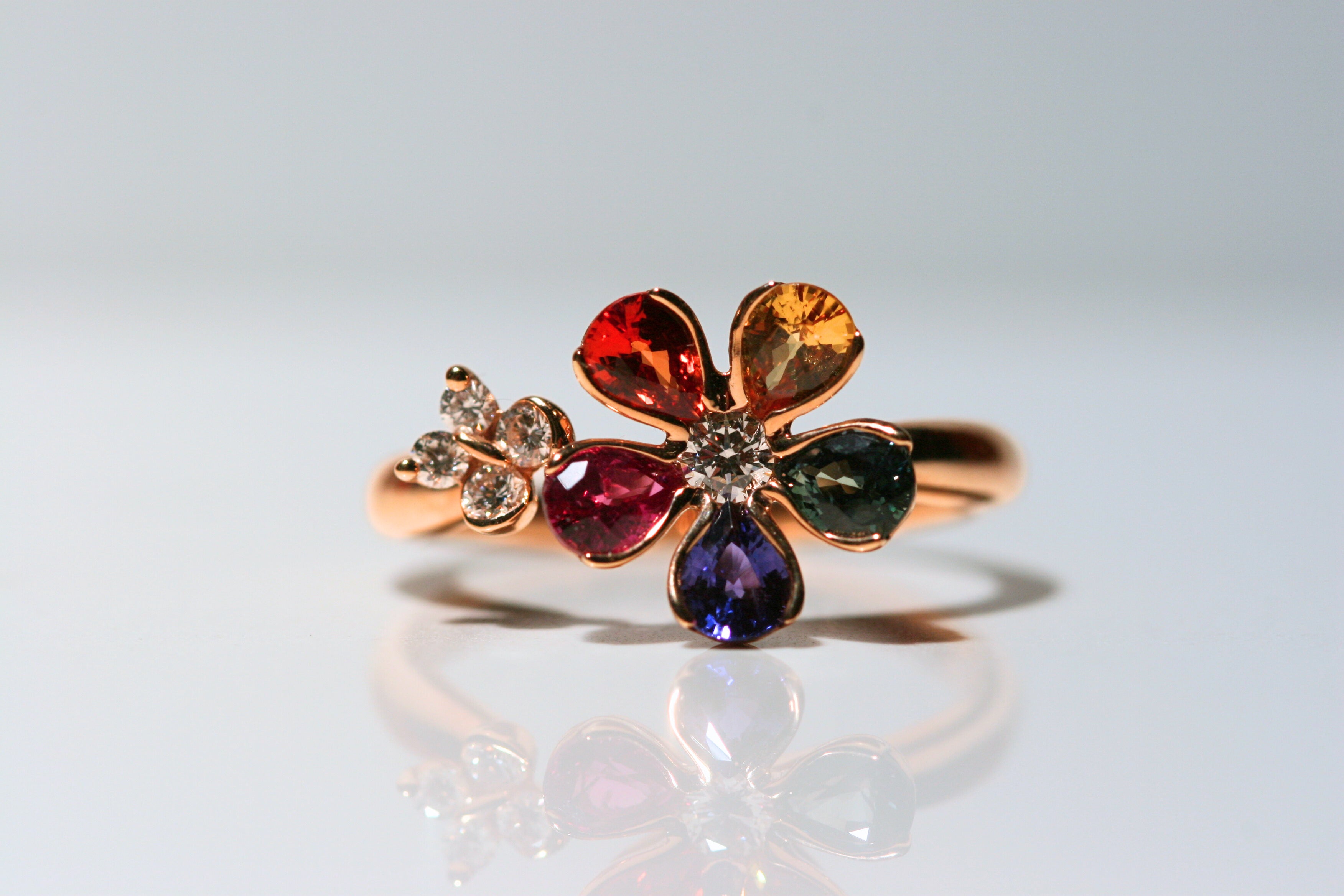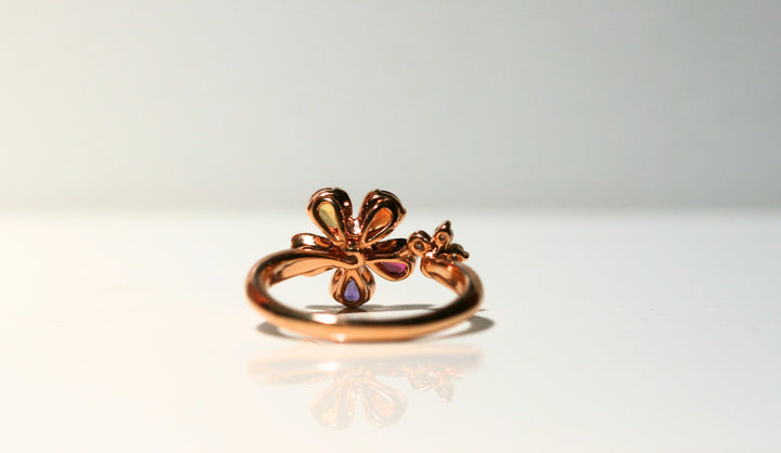 Elegantly crafted in 18k rose gold, the "Romantica" ring boasts 5 stunning pear cut sapphires in a rainbow of colors, forming a delicate and sparkly flower design. Accented by a small diamond flower, this statement piece exudes sophistication and exclusivity. Channel your inner romance with this luxurious and unique ring.