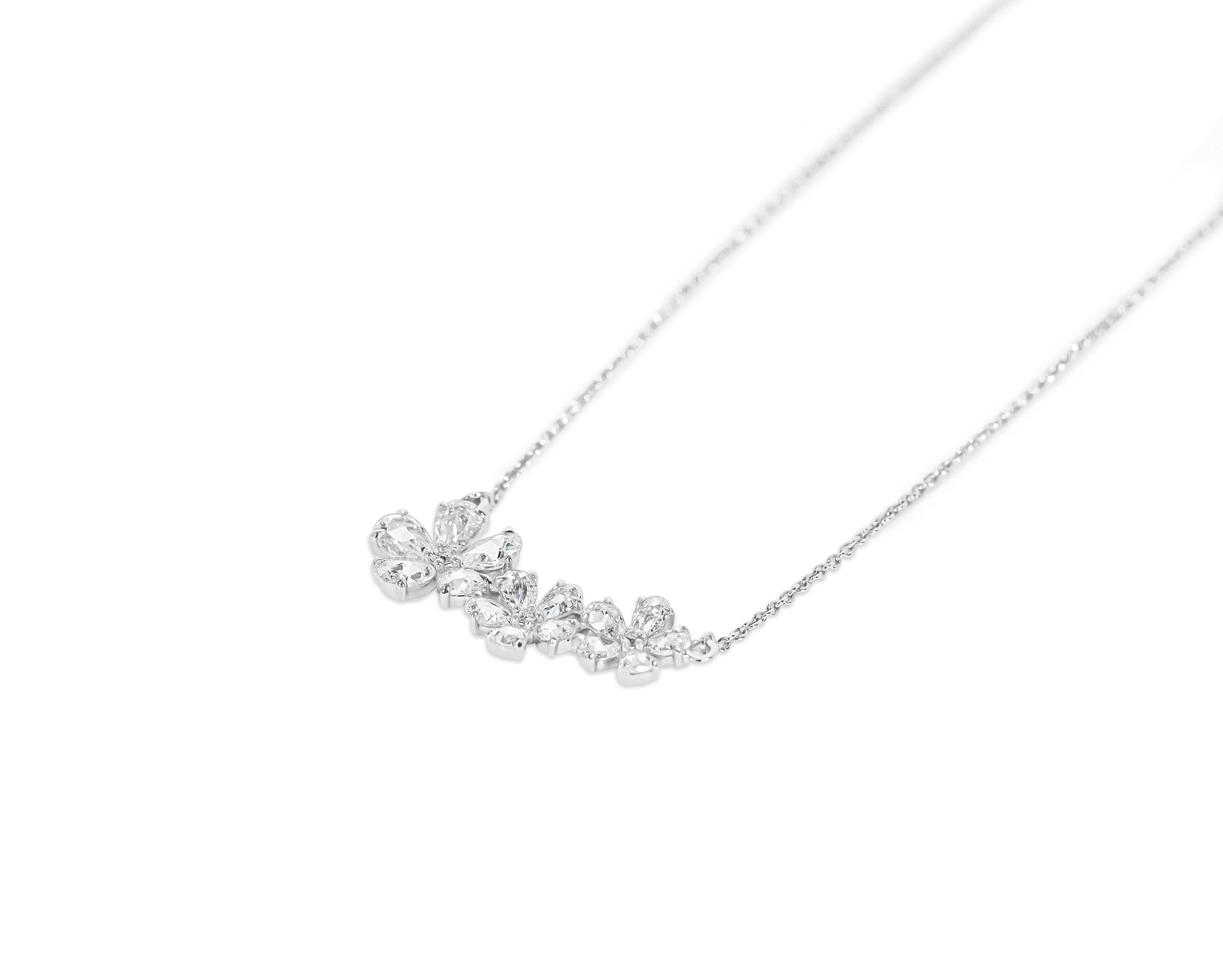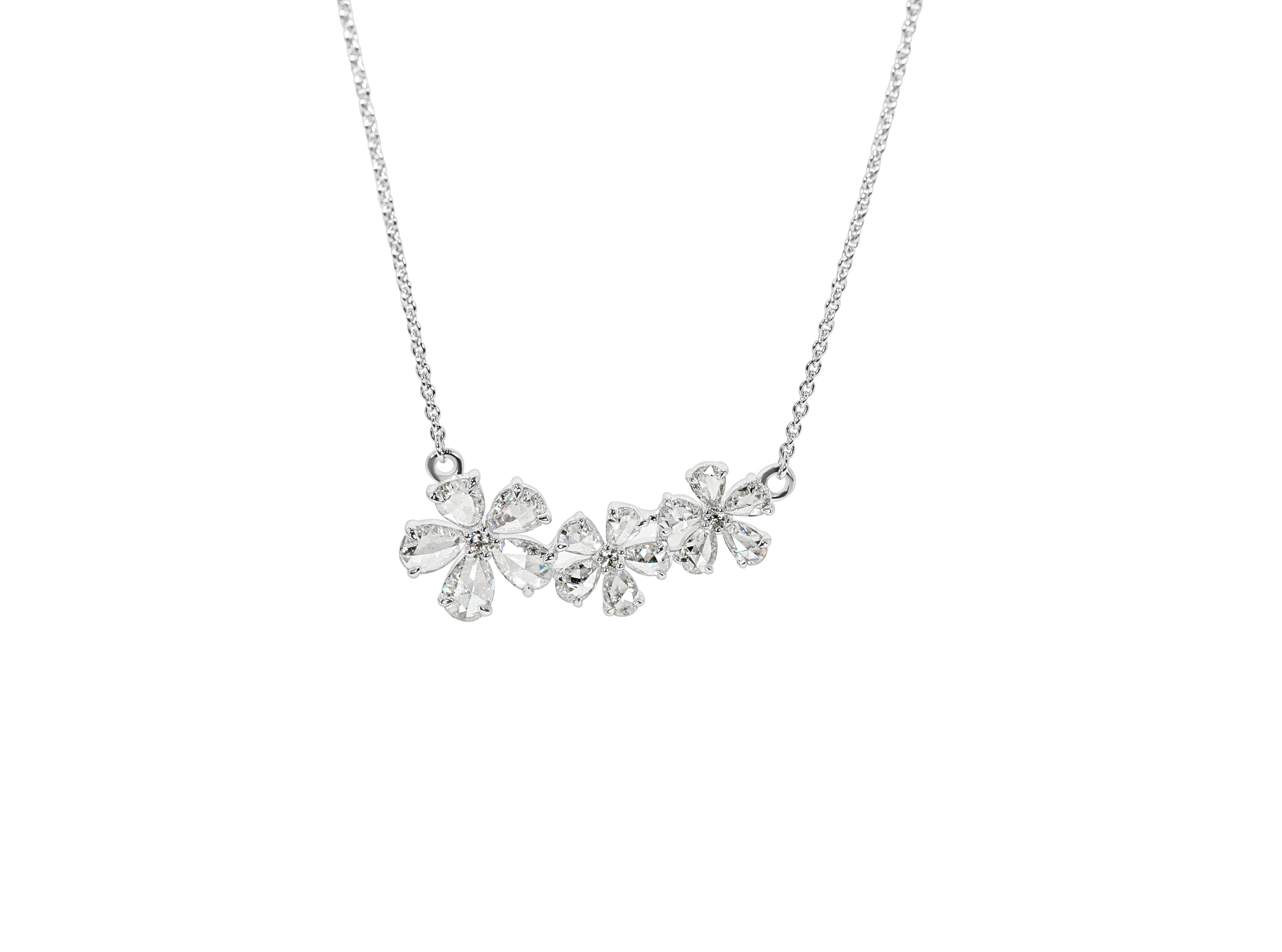 Introducing the "Sakura Trois" Necklace, a stunning and elegant piece inspired by the Japanese sakura flower. The necklace features a three flowers, with 15 Rose cut Pear Shape and 3 Round brilliant cut diamonds in the center. Crafted in 18k white gold, the necklace is set on a 16" Cable Link Chain with a secure lobster clasp. Fusing delicacy and femininity, this necklace is the perfect statement piece for any occasion. Add a touch of botanical beauty to your jewelry collection with the "Sakura" Flora Necklace.